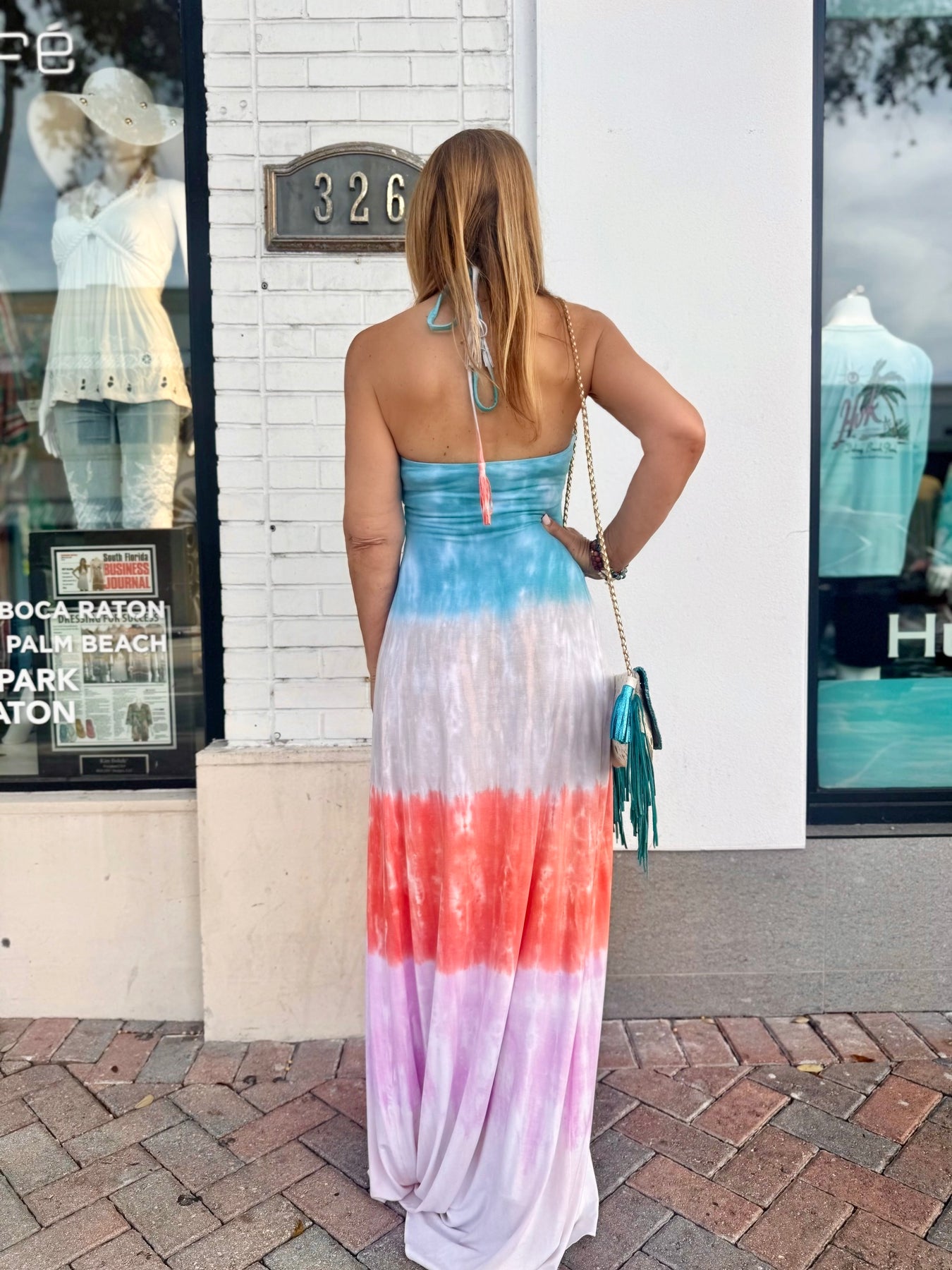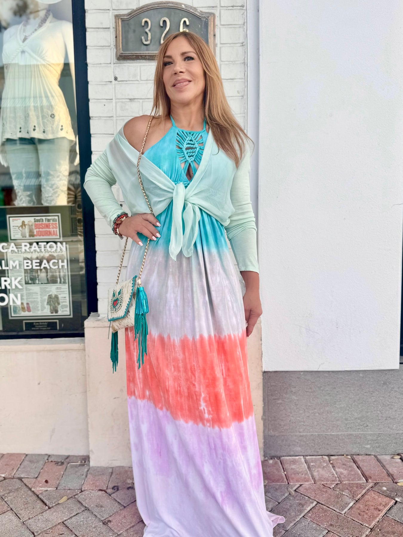 - Teal, coral, and lavender tie-dye and ombré maxi dress