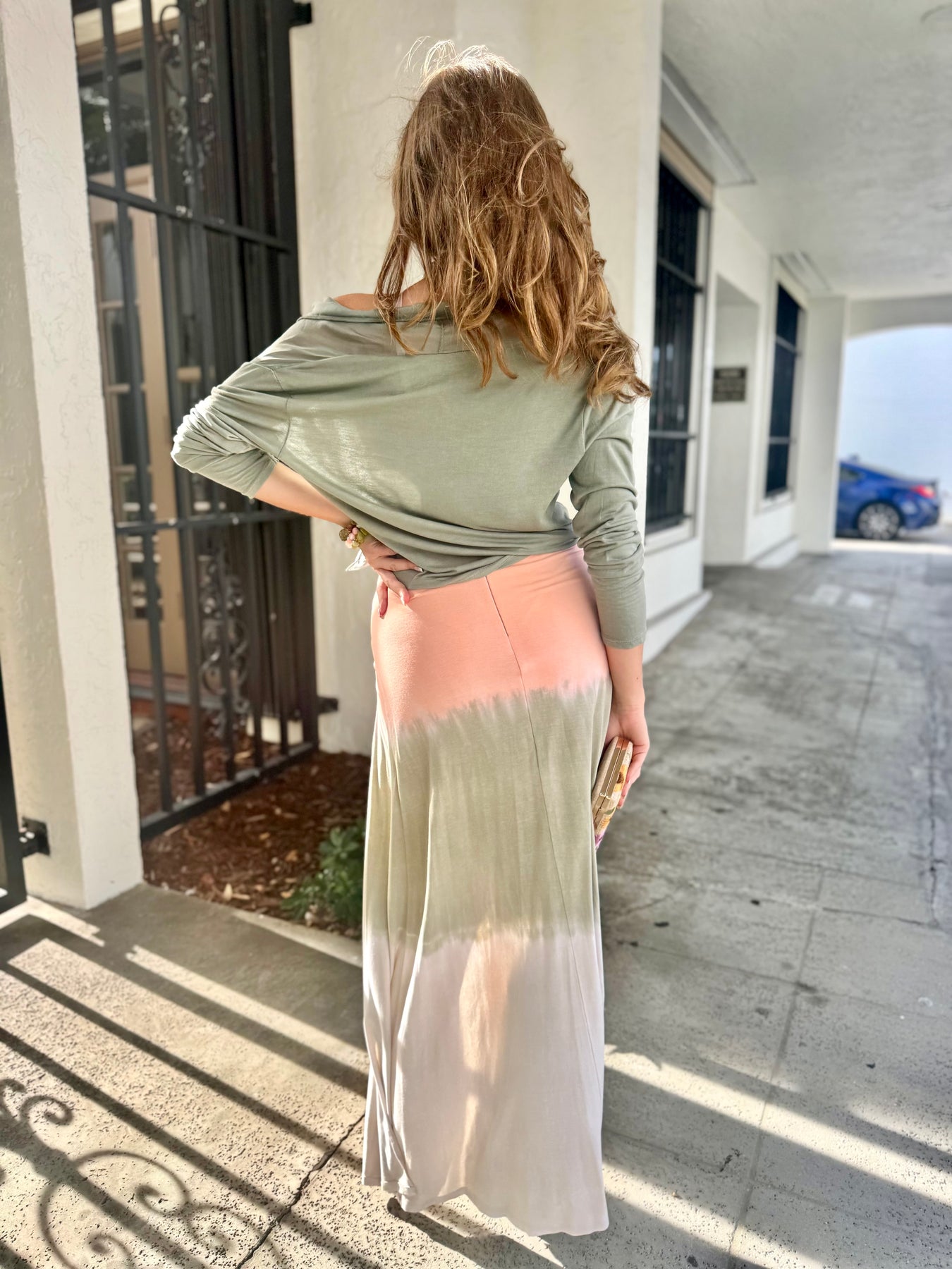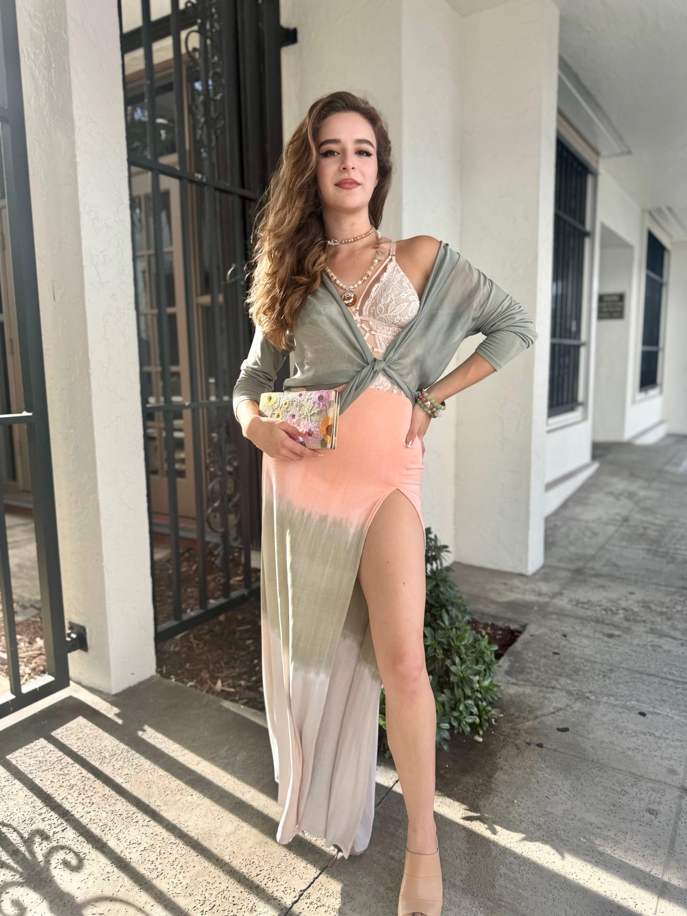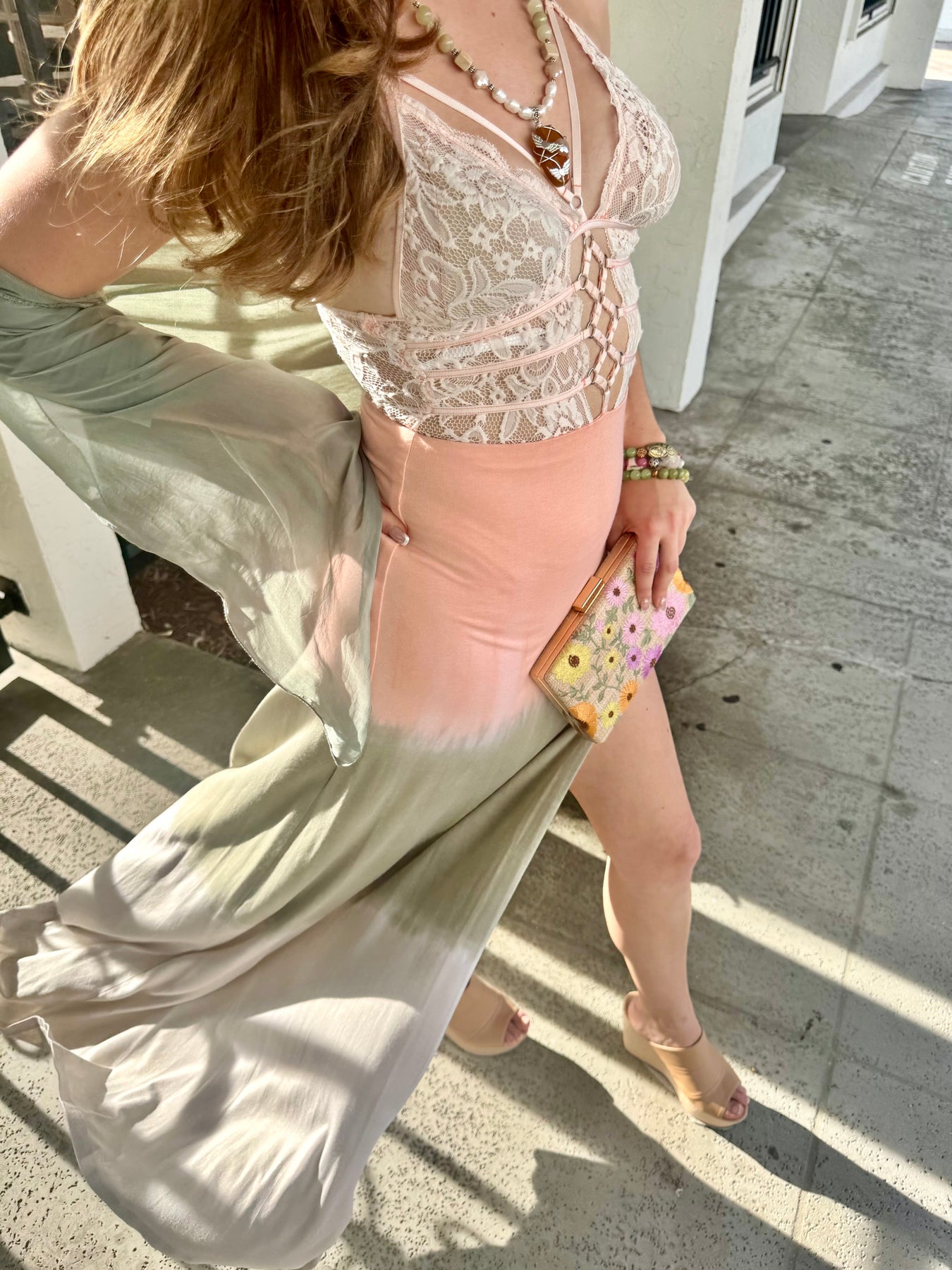 Breeze through golden hour in the Desert Rose Lace Maxi Dress. Featuring a blush lace bodice with intricate strappy detailing and a flowing ombré skirt in sunset peach and sage green, this dress is pure effortless romance. Lightweight and eye-catching, it’s perfect for brunch, beach parties, or summer nights under the stars.
