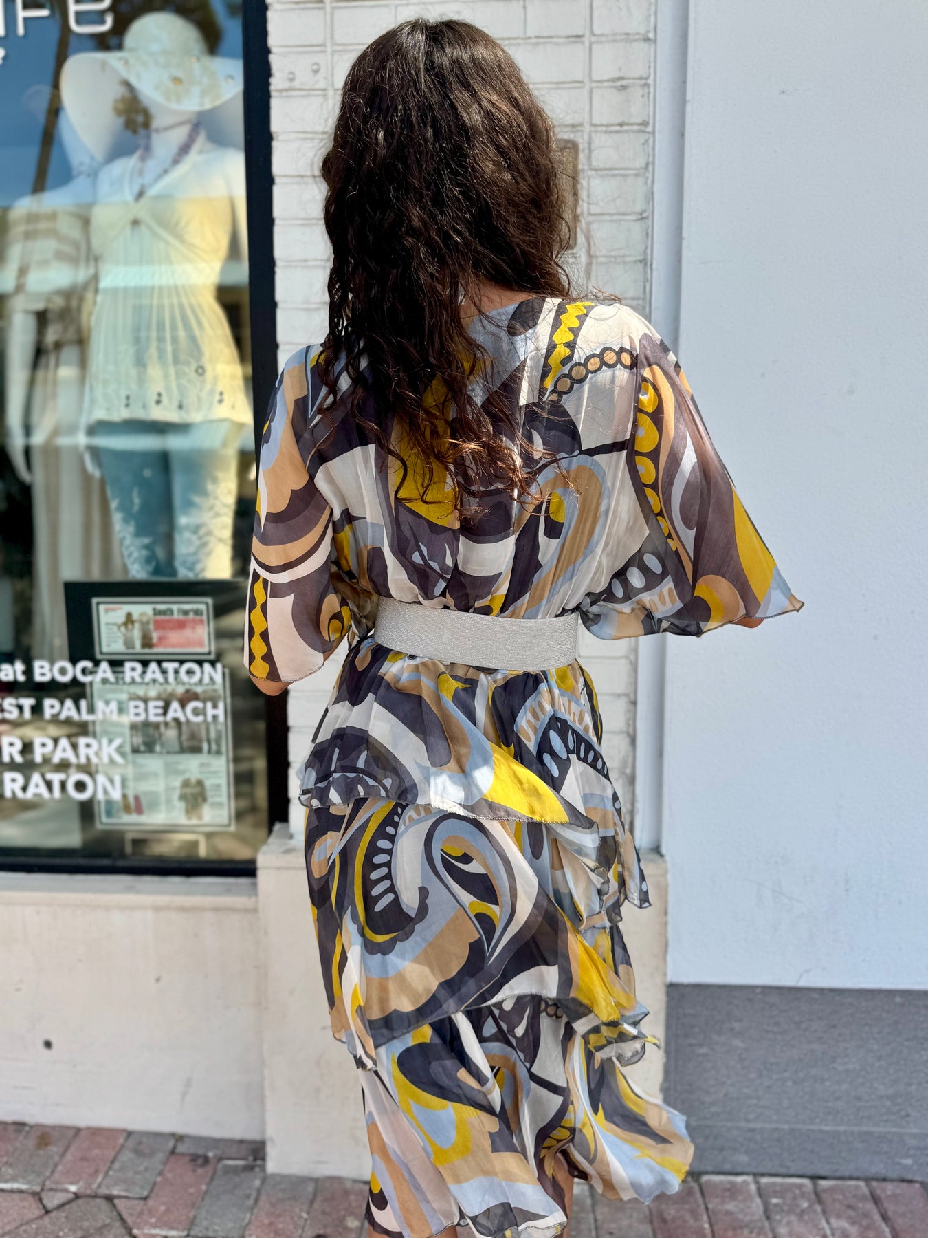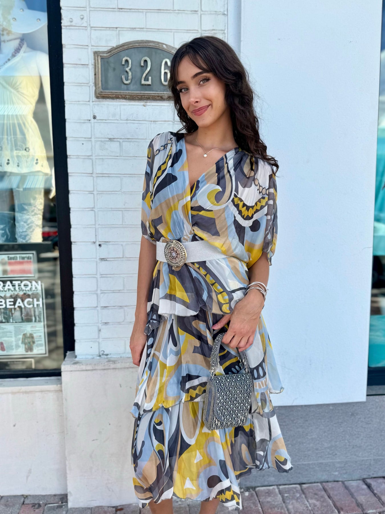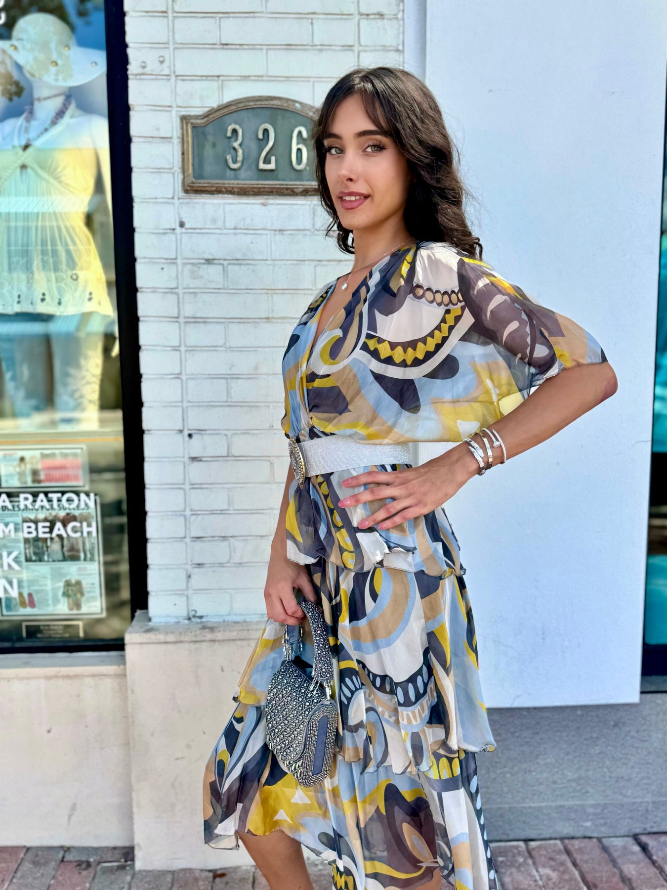 Graceful and effortlessly sophisticated, the Golden Hour Silk Blend Midi Dress is made for modern muses. Crafted from a luxurious silk-blend fabric, this flowy dress features a soft abstract print in hues of golden yellow, muted gray, ivory, and slate blue — reminiscent of the colors cast by the setting sun. The tiered silhouette adds movement and dimension, while the crossover V-neckline and flattering elastic waist create an effortlessly feminine shape.