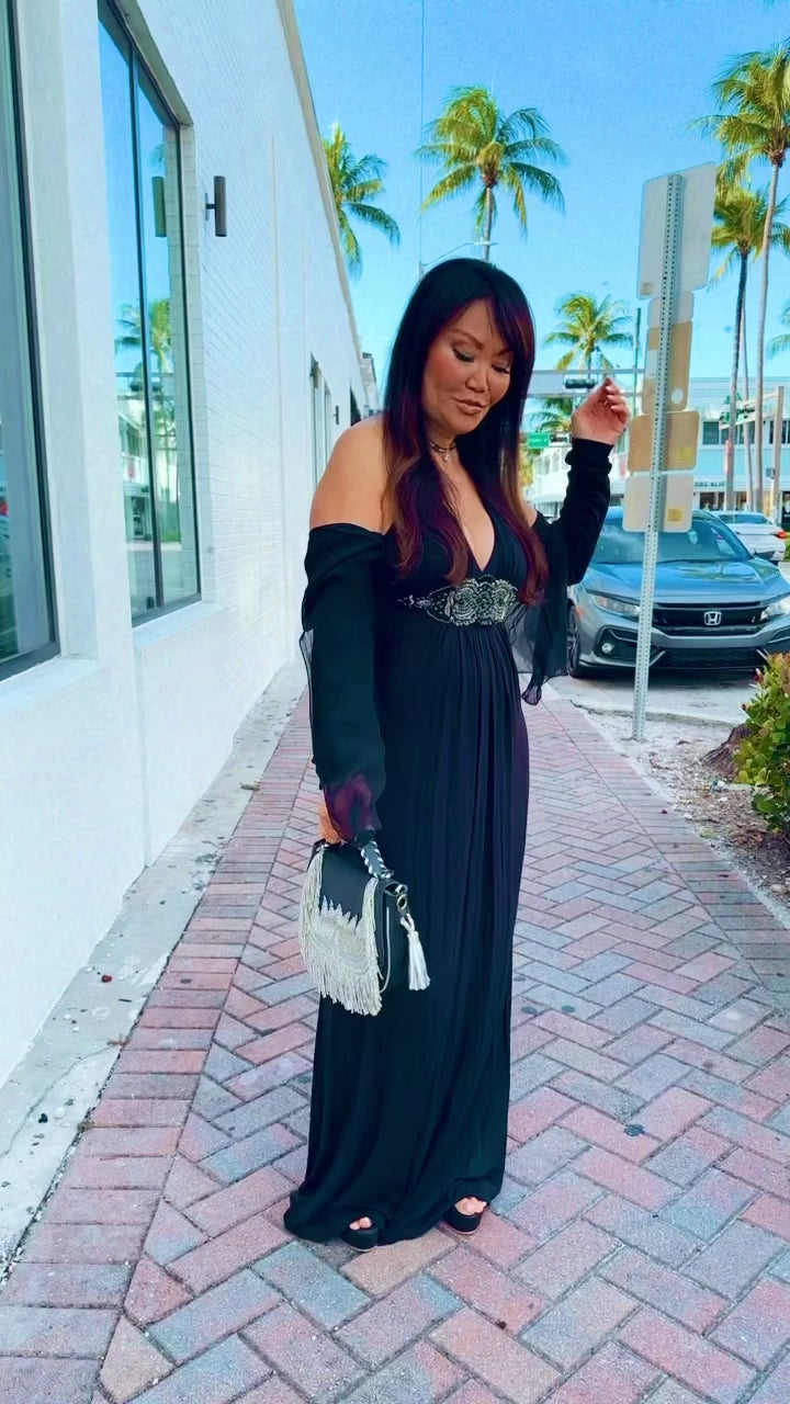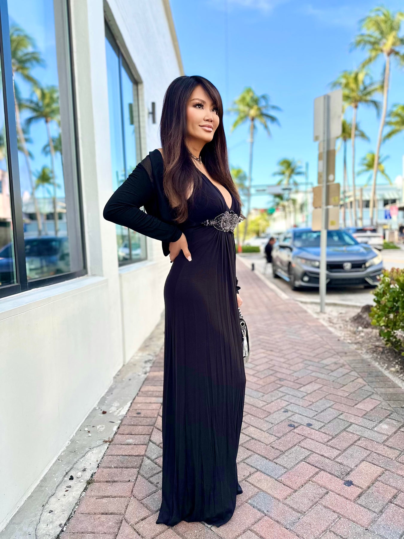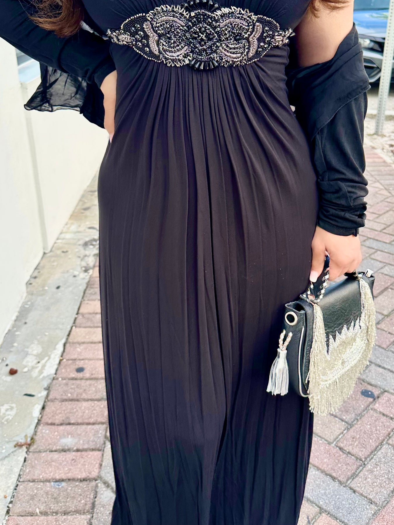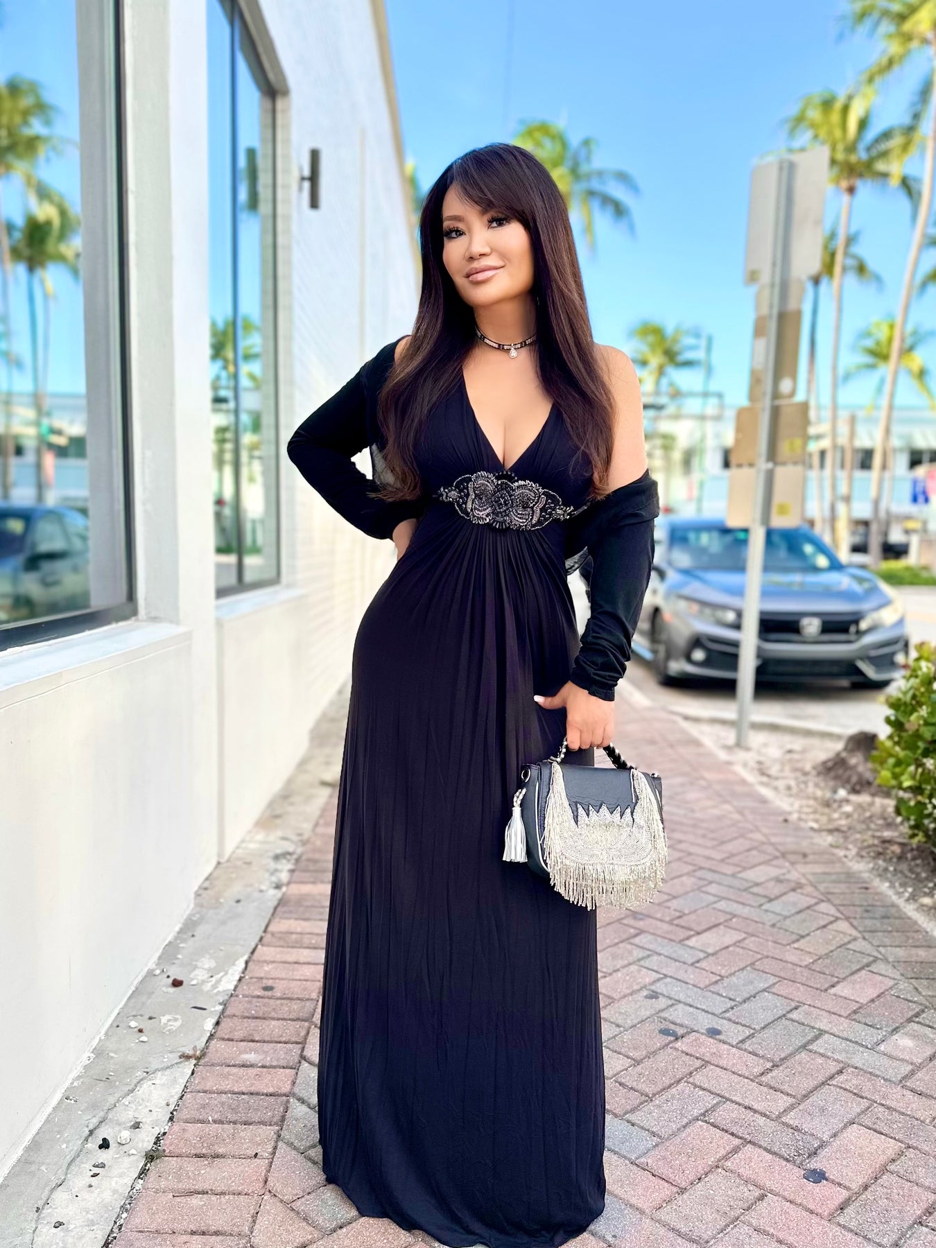 Slip into the Midnight Gem Dress and let the night sparkle around you. With its sultry silhouette, silky soft fabric, and striking gem-embellished neckline, this dress is pure after-dark elegance. Whether you're heading to a rooftop dinner or dancing under the stars, this look is made to glow when the lights go low. Pair with strappy heels and a bold lip for the ultimate nighttime statement. Perfect for galas or weddings.
