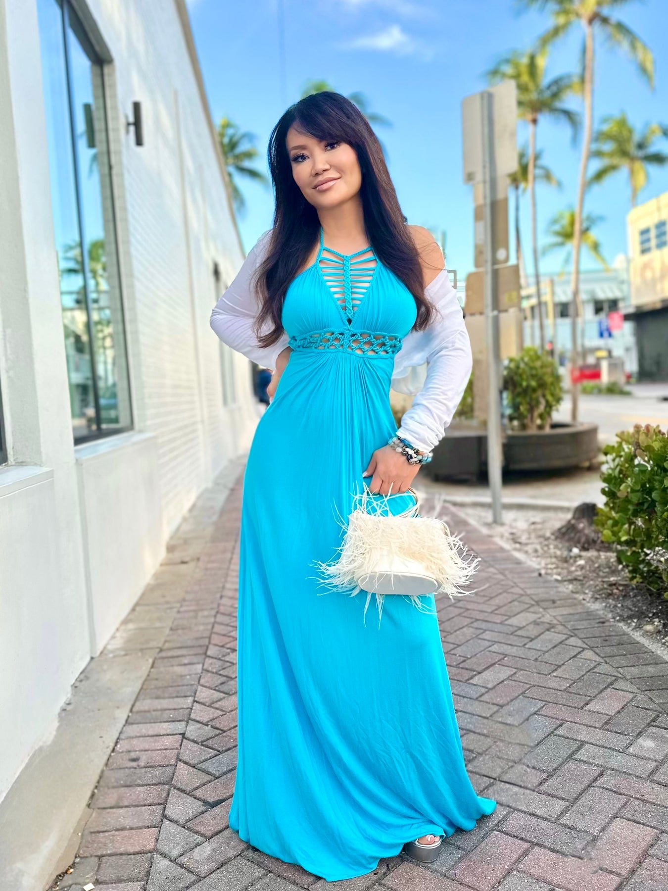 Make waves in the Ocean Gem Crochet Halter Dress, a vibrant turquoise maxi designed to stun from beach to boardwalk. Featuring a plunging neckline with crisscross straps, hand-crocheted paneling under the bust, and a flowy, floor-grazing silhouette, this dress is everything you want for a summer escape — effortless, breathable, and unforgettable. Pair with a white fringe bag and platform sandals for an island-glam look.