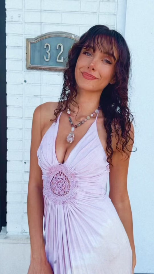 Feel the ocean breeze in the Sea Mist Crochet Halter Dress — a stunning blend of beachy elegance and bohemian beauty. Featuring a soft halter neckline, hand-crocheted center detailing, and a breezy high slit, this flowy aqua-toned or blush-toned dress moves with you from golden hour to moonlit strolls. Lightweight, flattering, and unforgettable. Pair with nude wedges, a statement cuff, and a fringed bag for effortless coastal glam.