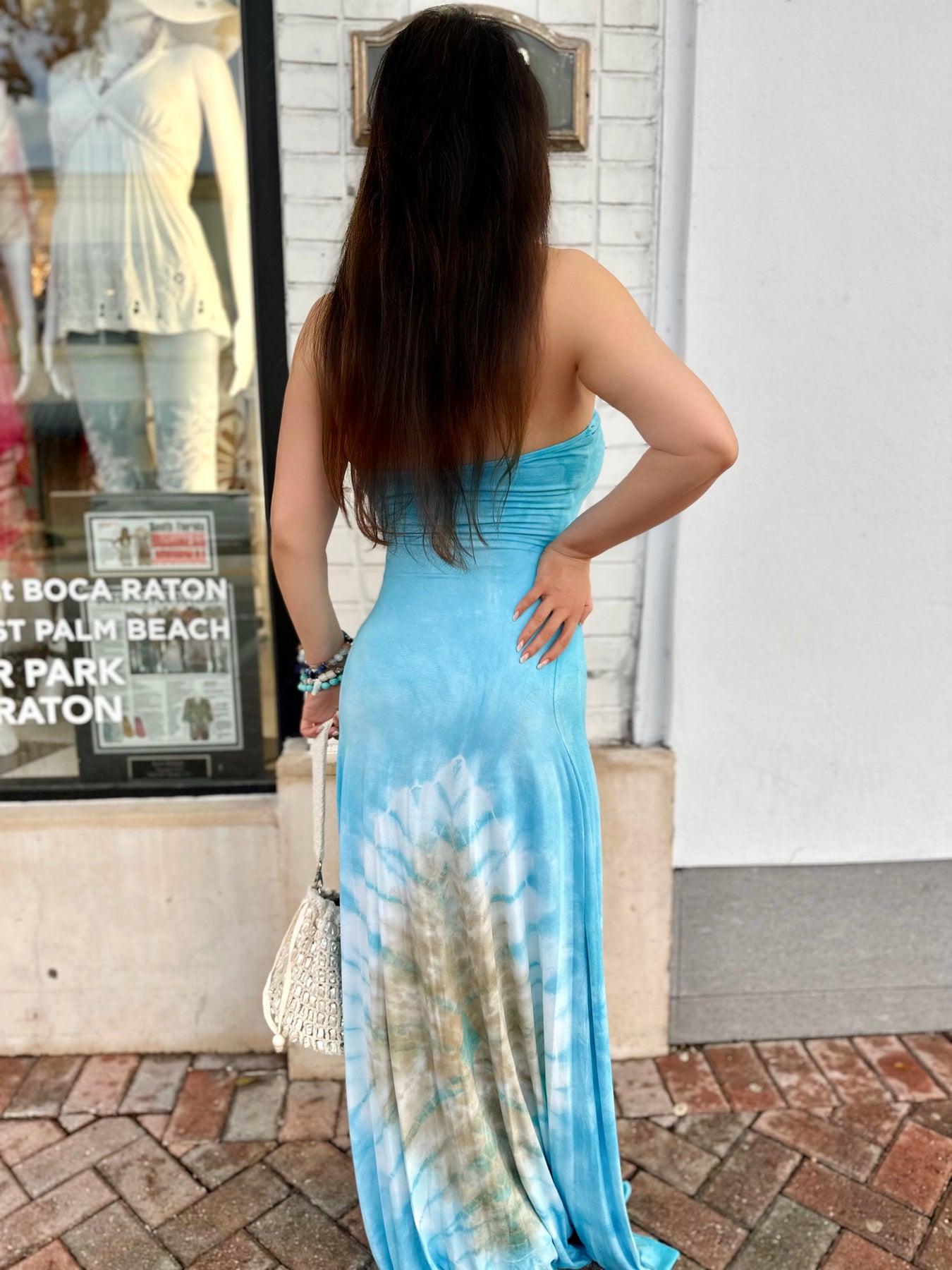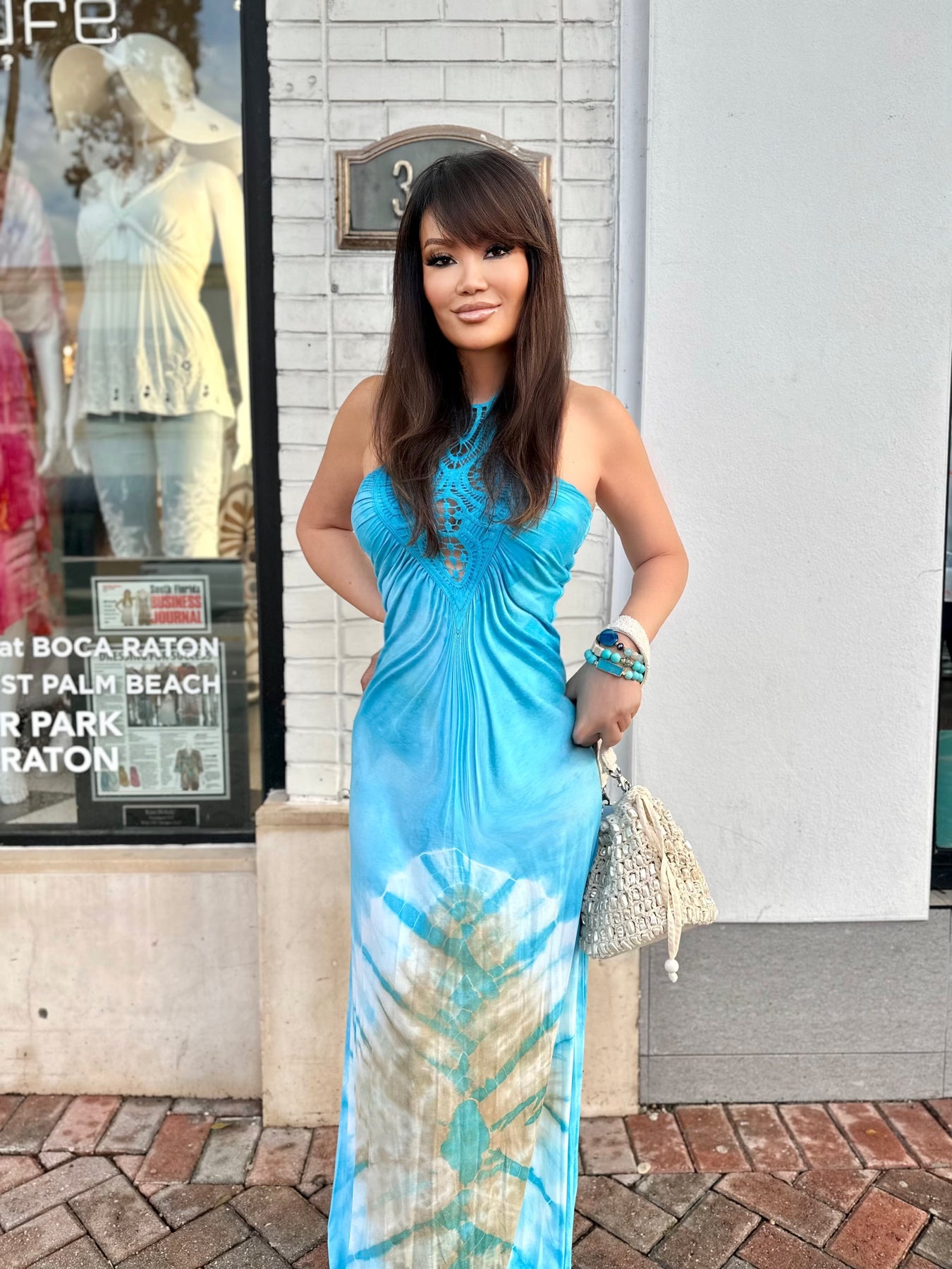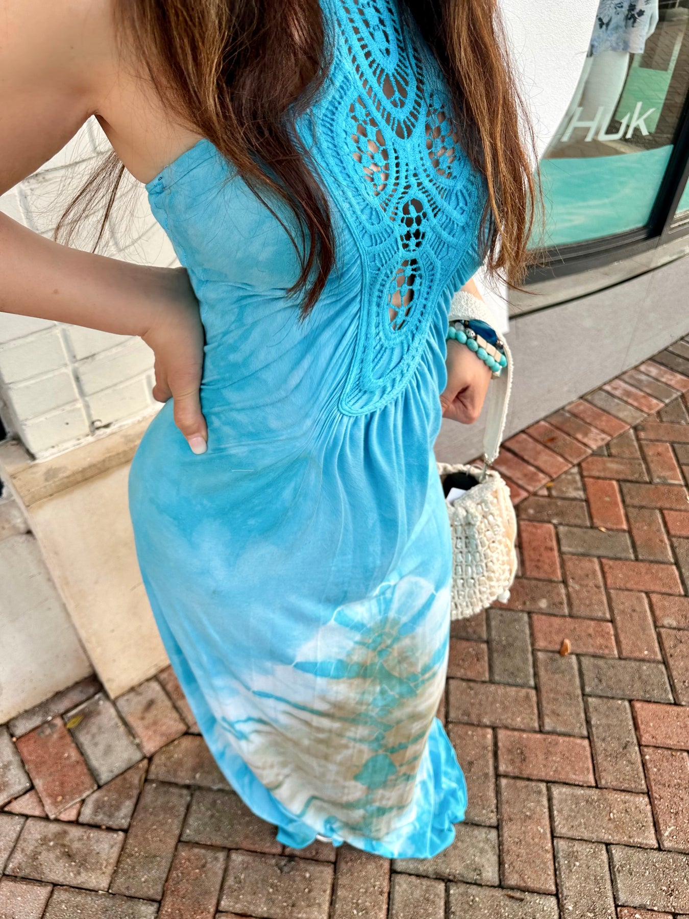 Flow like the ocean in the Tide Pool Crochet Halter Maxi Dress, a coastal dream designed for sunny getaways and breezy evenings. Featuring a hand-crocheted neckline, ruched bodice, and a watercolor-inspired tie-dye print in aqua blue and sandy neutrals, this dress hugs in all the right places while keeping you cool and carefree. Pair with woven accessories and natural stone jewelry for an effortless island goddess vibe.