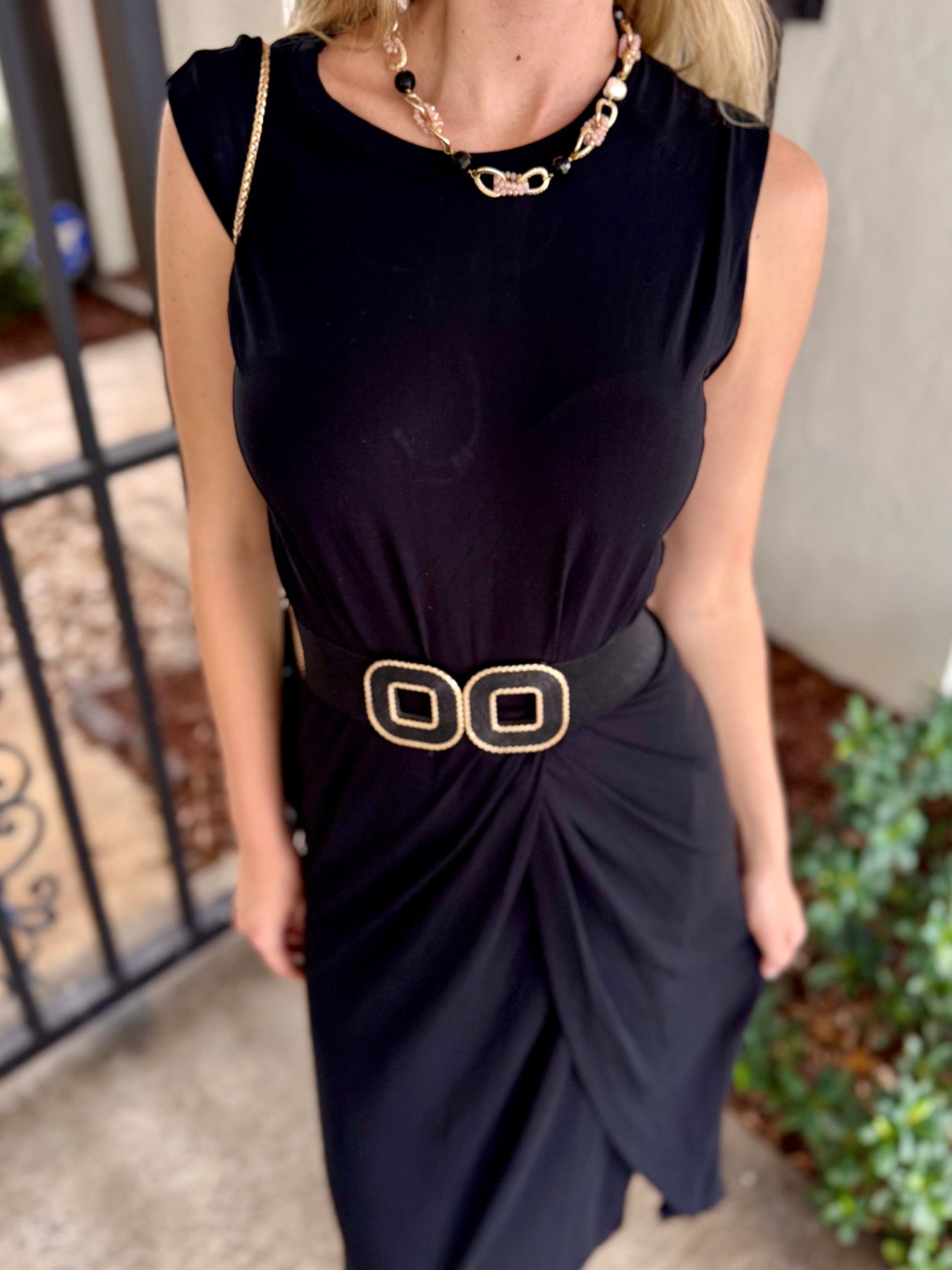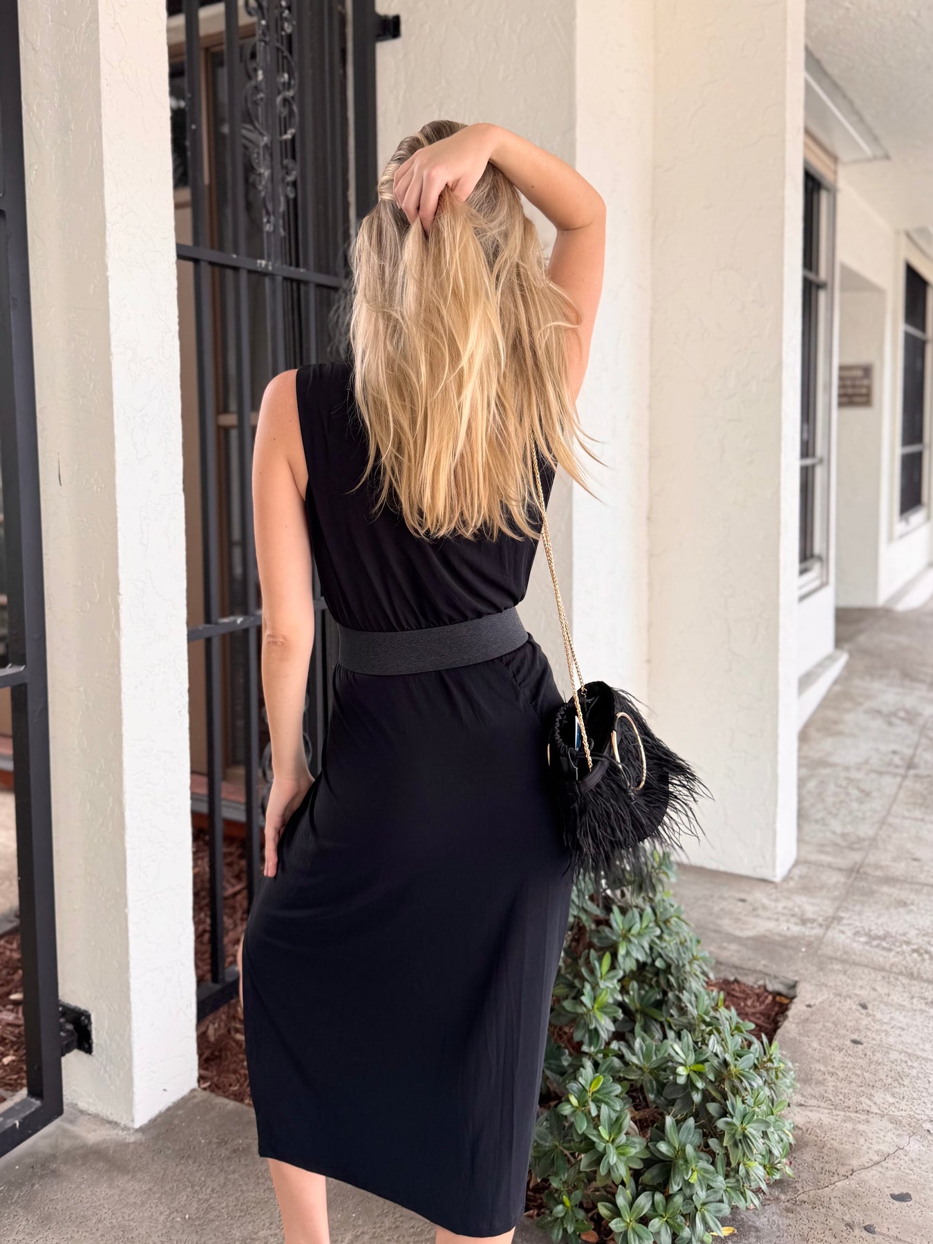 Effortlessly sleek with a touch of edge, the Twilight Drape Midi Dress is your new go-to for day-to-night sophistication. This sleeveless black midi features a luxe stretch fabric that gently hugs your frame, while the front twist detail and thigh-high slit create a flattering draped effect that elongates and elevates. The high neckline and clean lines give it a modern, minimalist vibe—perfect for layering with gold jewelry and a bold boot or heel.
