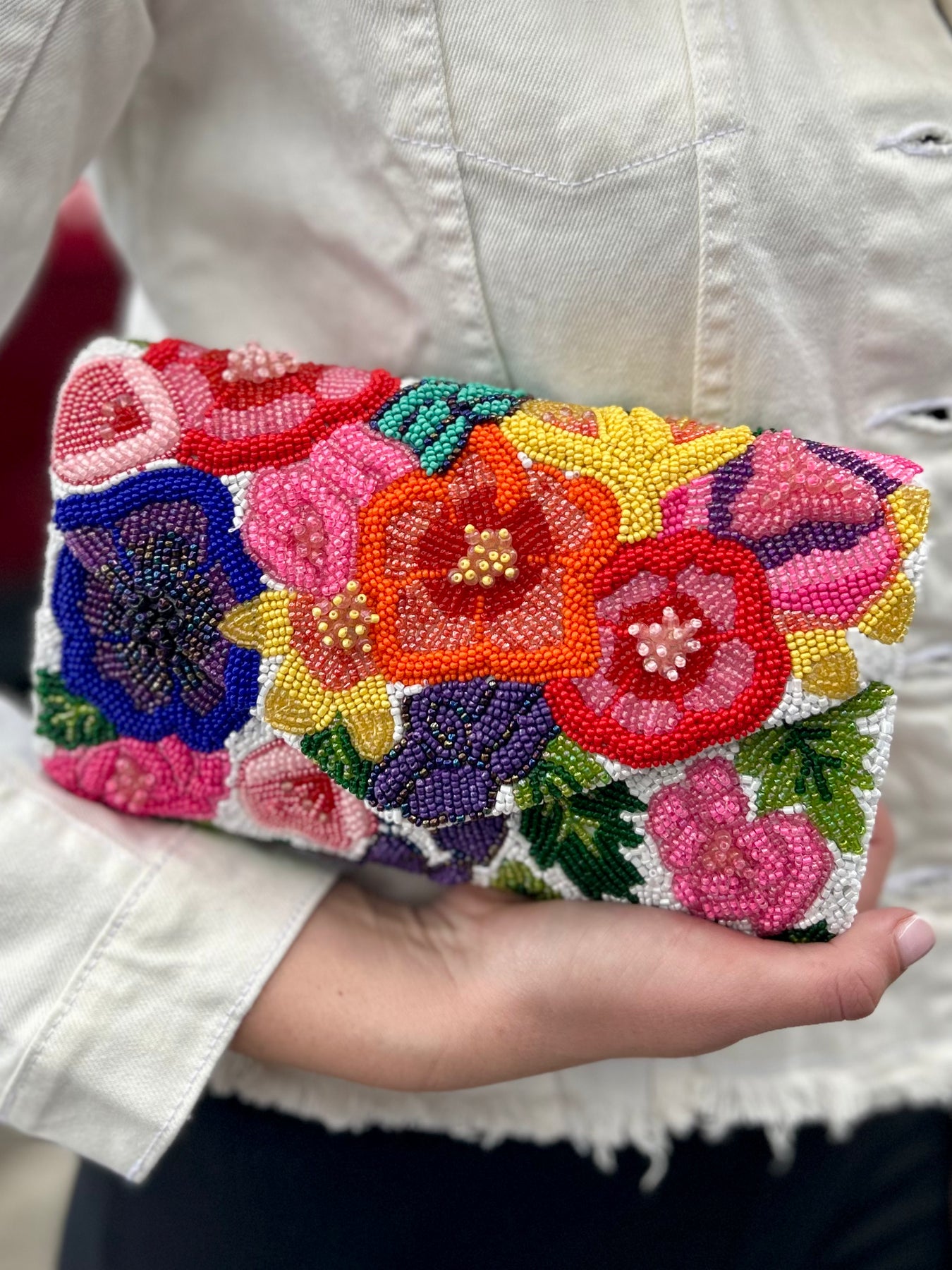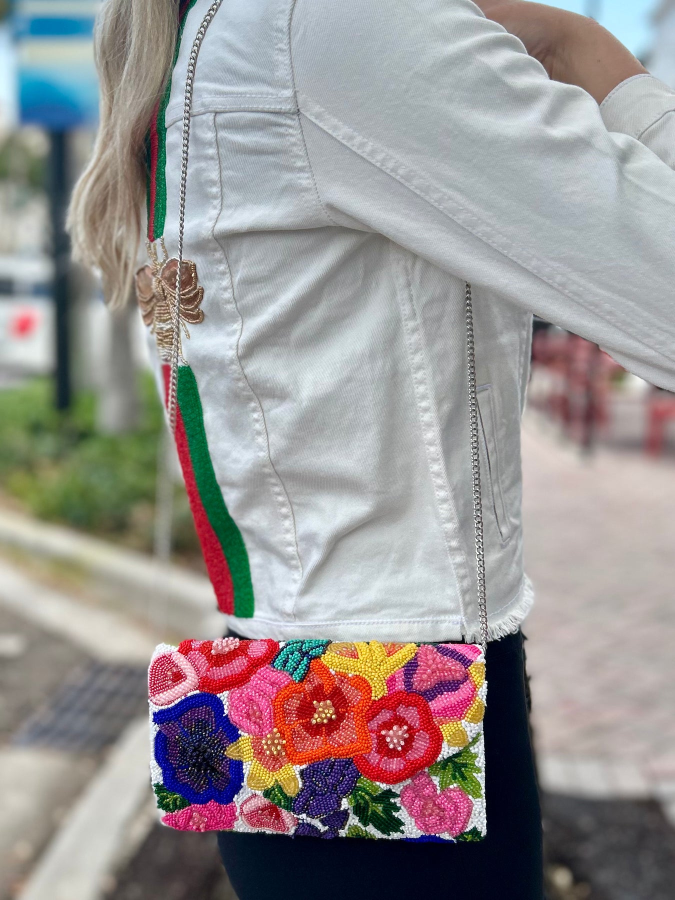 The Luminous Flower Garden Beaded Clutch is a veritable masterpiece, adorned with intricately crafted floral motifs that dance upon a pristine white beaded background. The vibrant blossoms, rendered in resplendent three-dimensional artistry, evoke the essence of a blossoming garden. Suspended elegantly by a sleek silver chain, this clutch is not merely an accessory, but a statement of refined taste and sophistication.