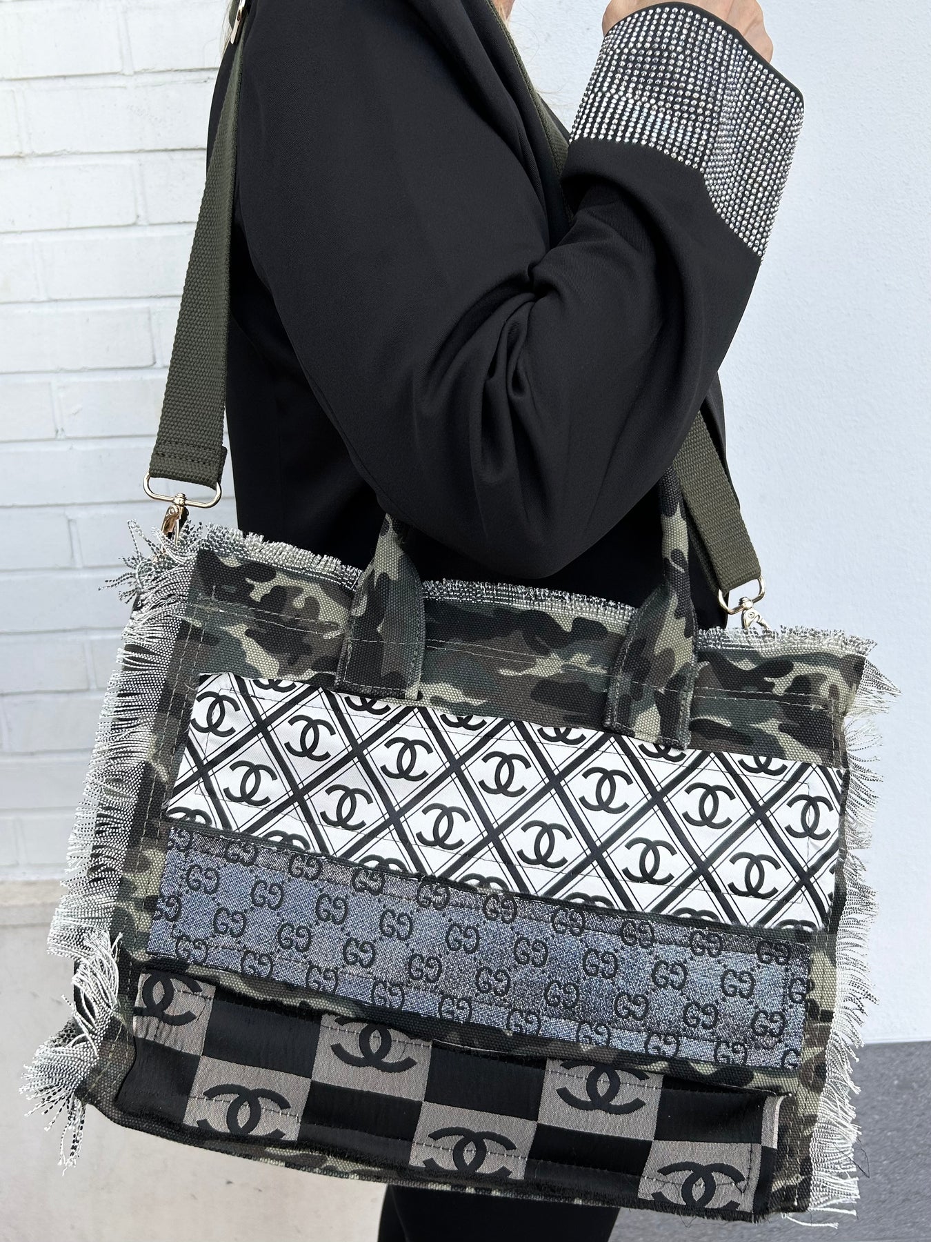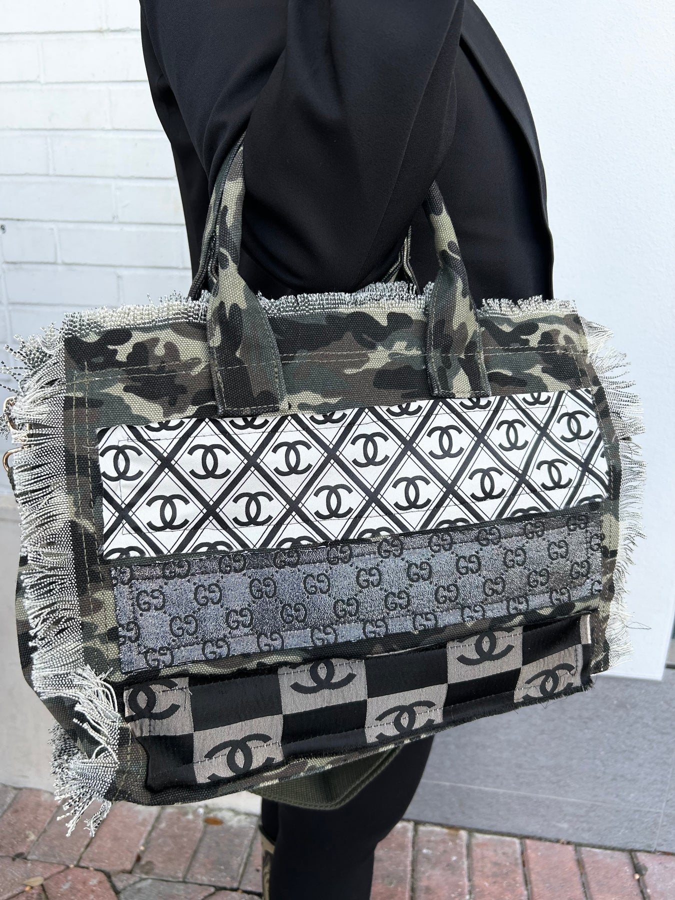 Turn heads with this striking upcycled designer-inspired statement tote, where luxury style meets sustainable fashion. This handcrafted handbag features a bold patchwork design showcasing iconic monogram patterns, including classic black and white motifs and rich brown accents, artfully combined for a one of a kind look. The structured camo canvas body is finished with edgy frayed trim detailing along the edges, adding texture and modern character. Designed for both fashion and function, the bag includes durable dual shoulder straps, a spacious interior perfect for everyday essentials, and a sturdy silhouette that maintains its shape while carrying comfortably. The contrasting panel design creates a visually dynamic piece that pairs effortlessly with both casual and elevated outfits.