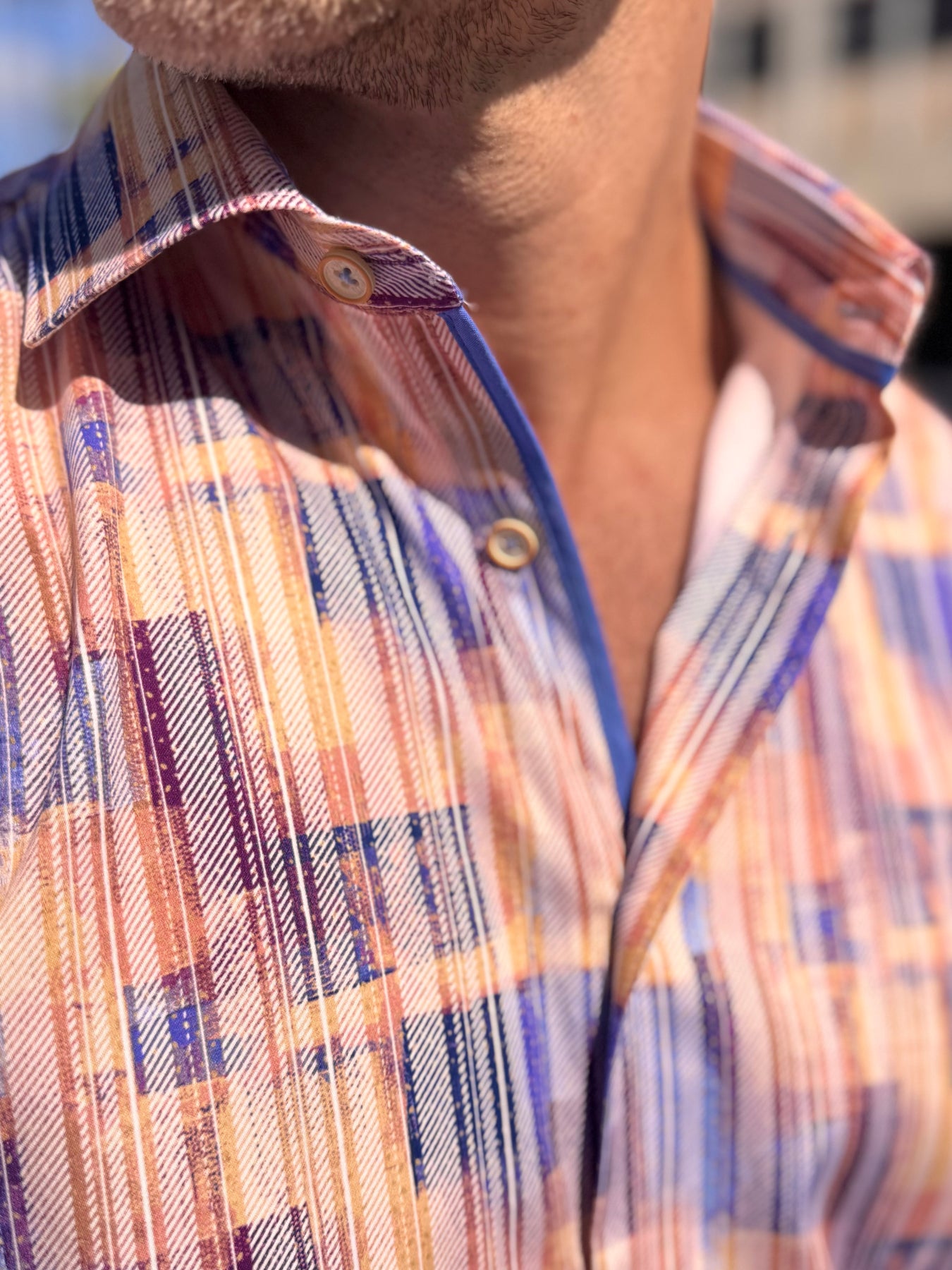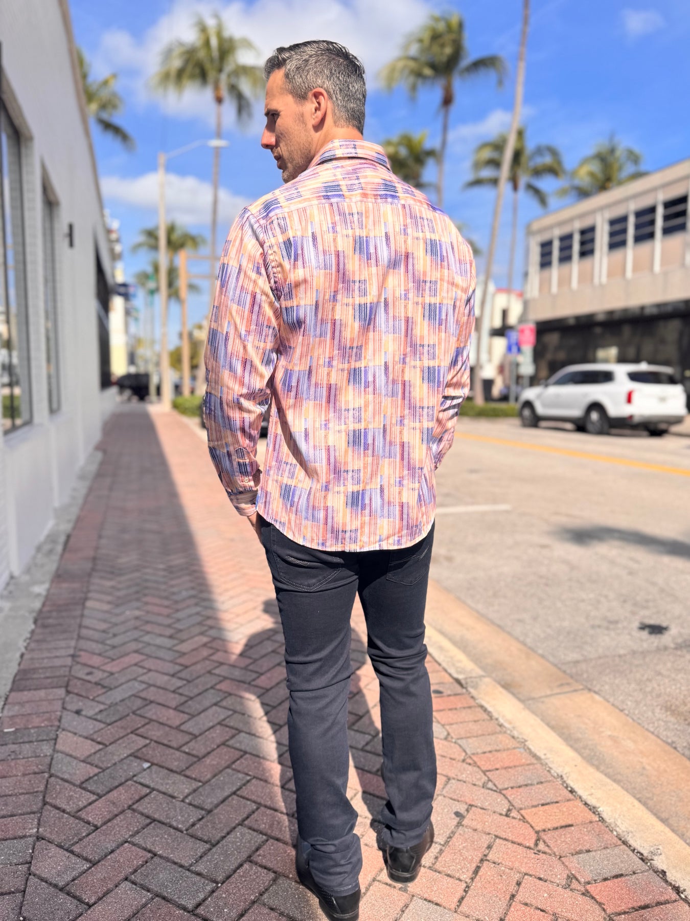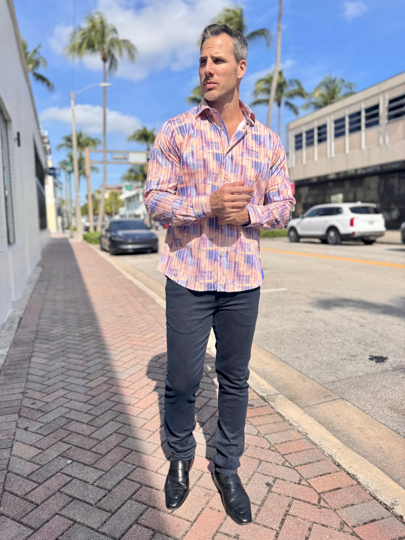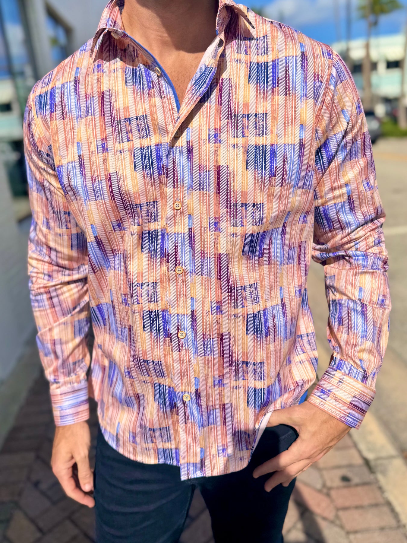 Infused with sunset warmth and ocean-blue depth, the Azure Mirage Mosaic Long Sleeve Button-Down brings artful sophistication to everyday style. Its abstract mosaic pattern blends soft peach tones with vibrant blues and violets, creating a dynamic look that stands out while staying effortlessly refined.