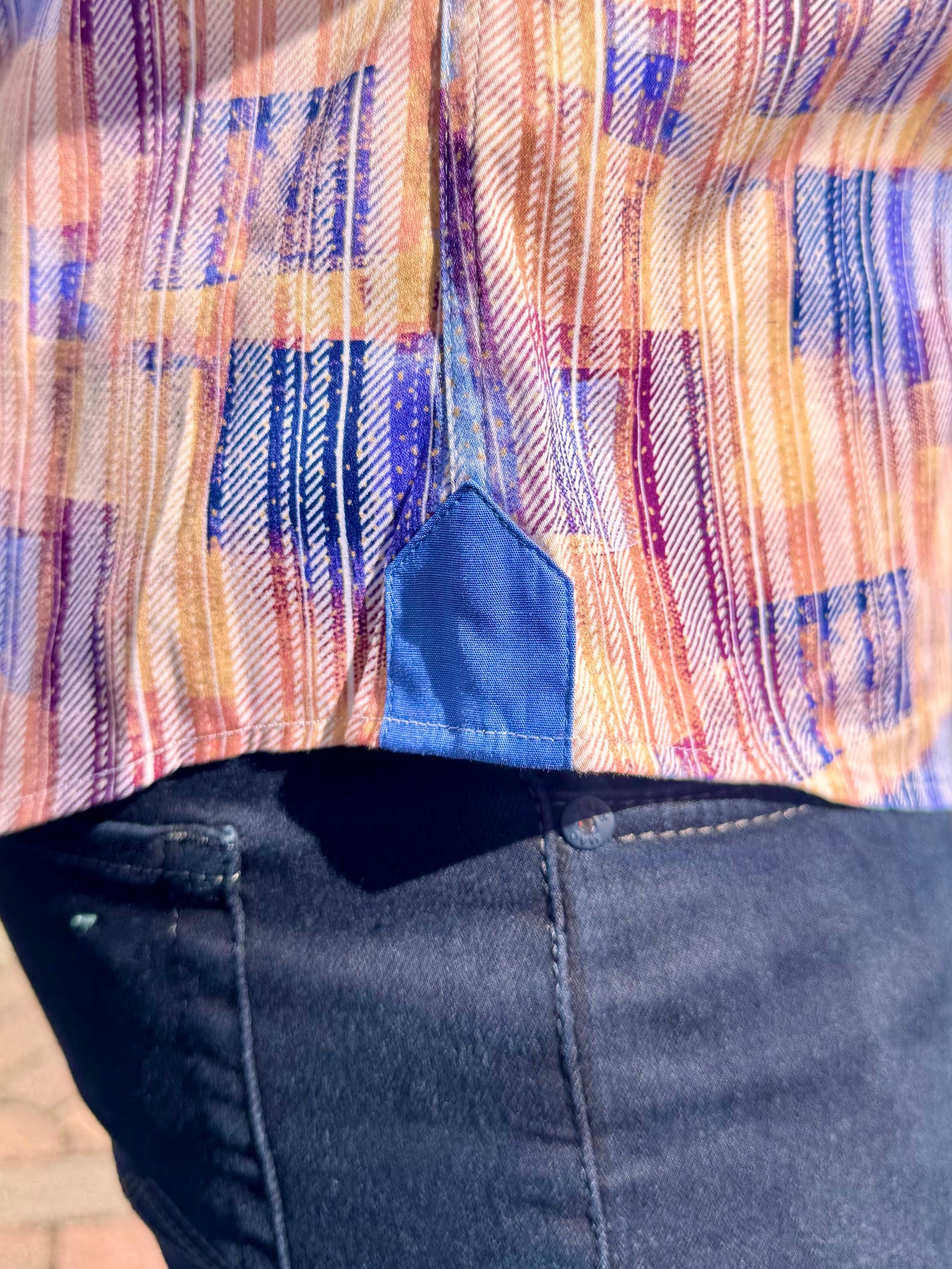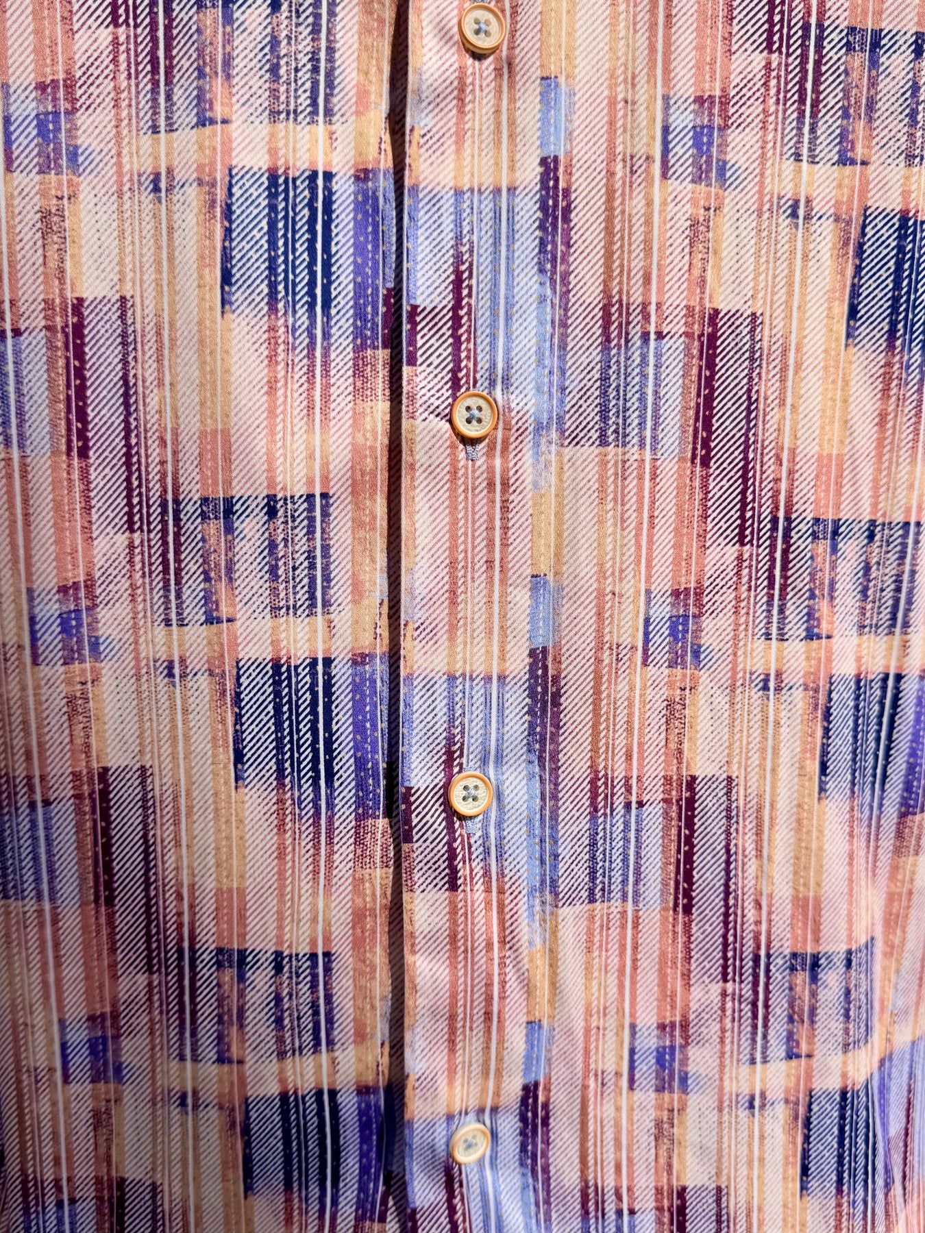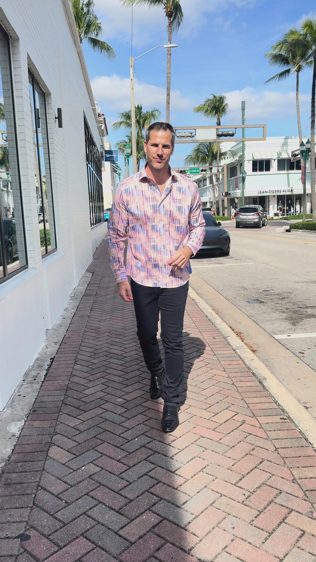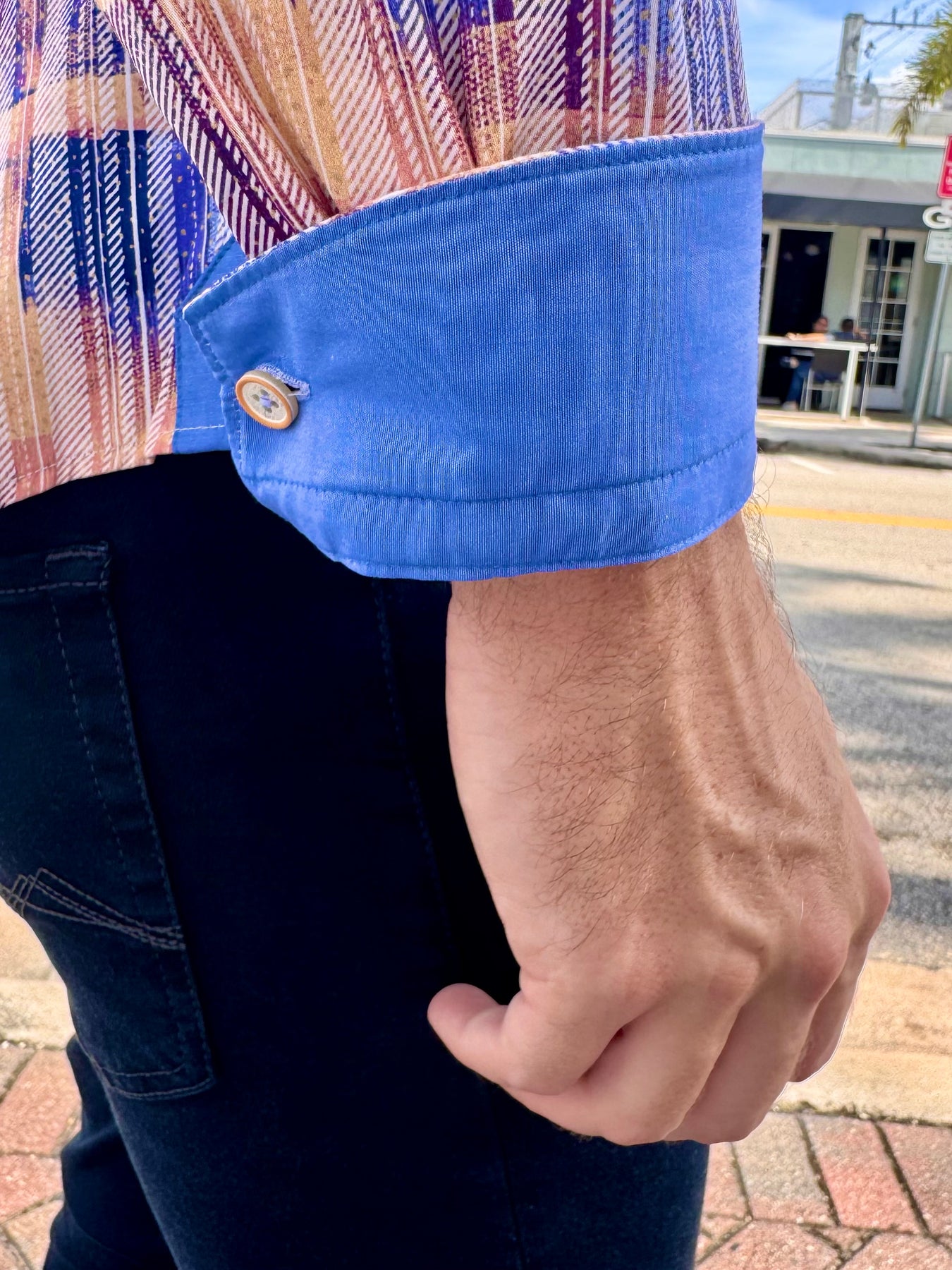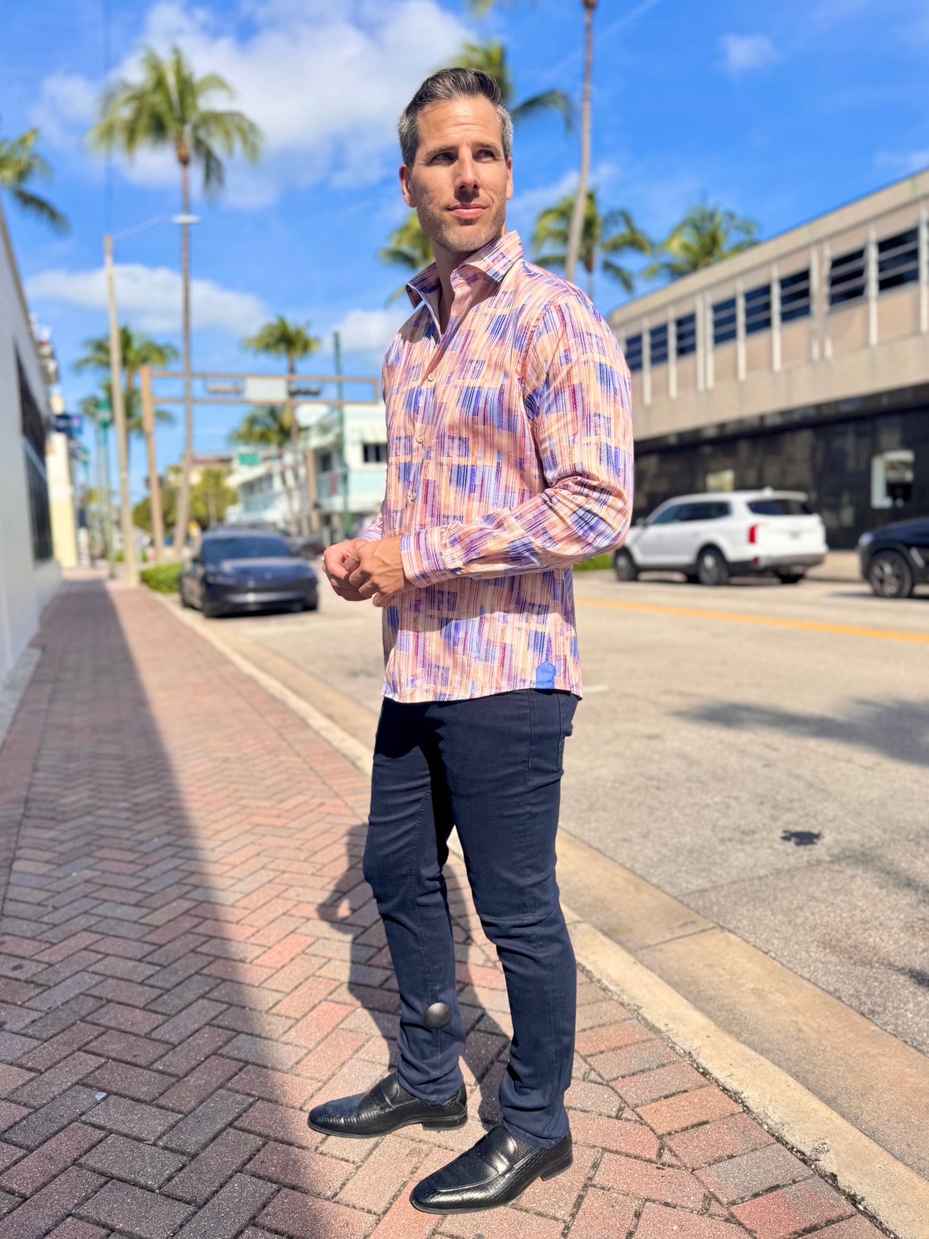 Infused with sunset warmth and ocean-blue depth, the Azure Mirage Mosaic Long Sleeve Button-Down brings artful sophistication to everyday style. Its abstract mosaic pattern blends soft peach tones with vibrant blues and violets, creating a dynamic look that stands out while staying effortlessly refined.