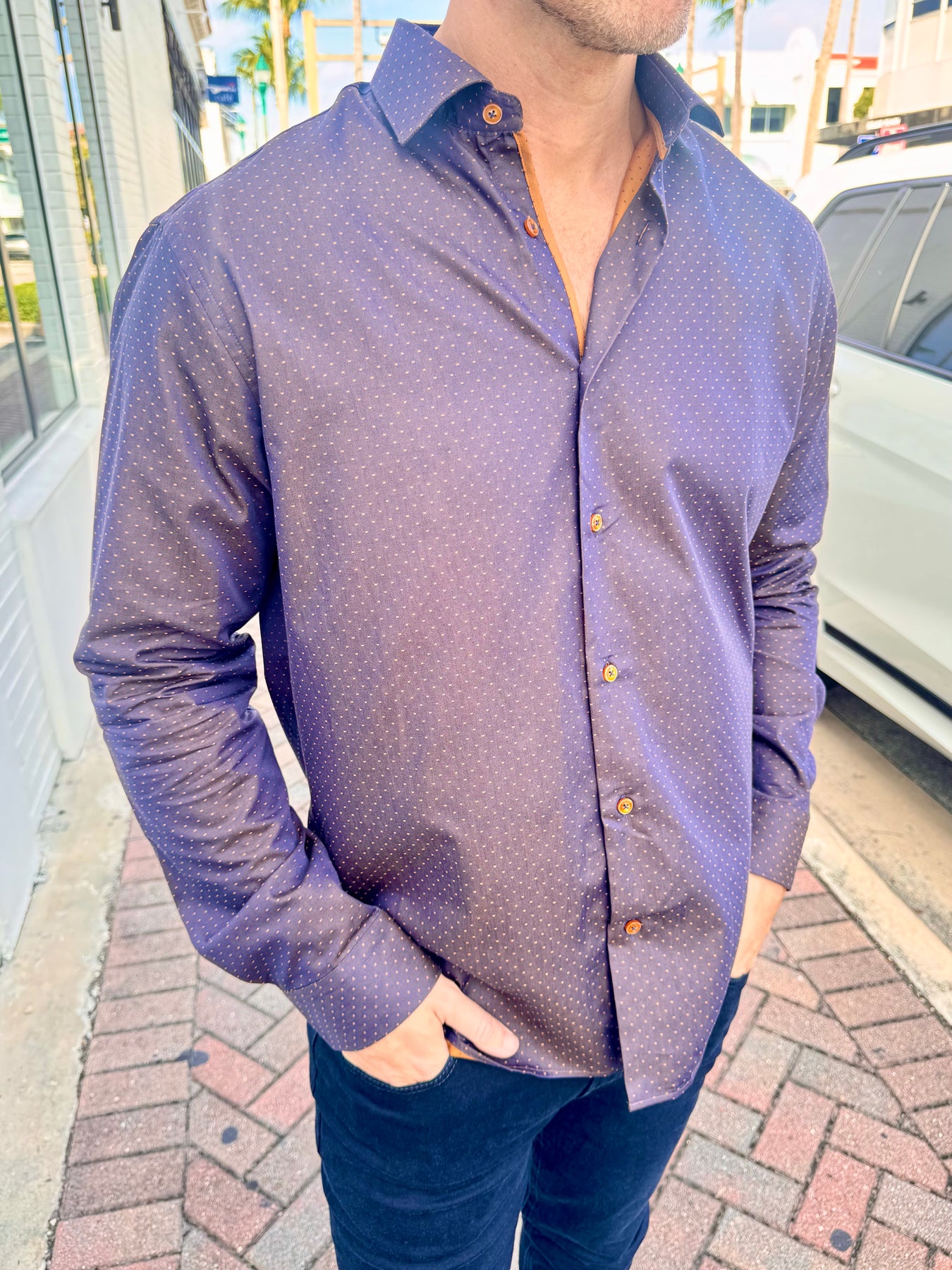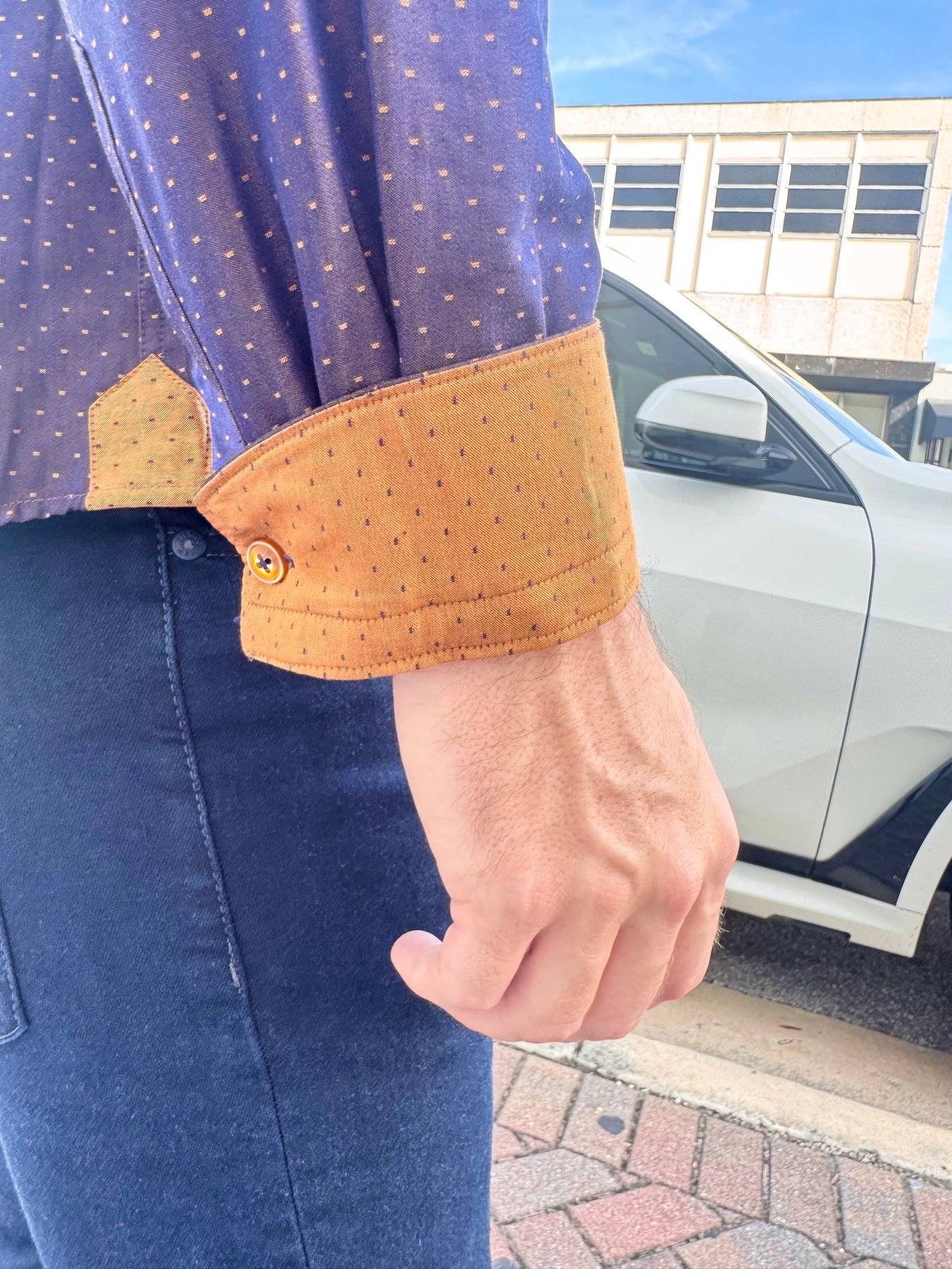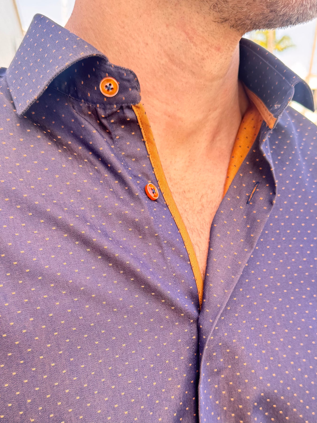 A refined essential with a bold twist, the Indigo Ember Microdot Long Sleeve Button-Down pairs deep indigo tones with subtle microdot patterning for a polished yet modern look. The standout ember-orange contrast at the cuff and hem creates a striking reveal when styled with rolled sleeves or an untucked finish.