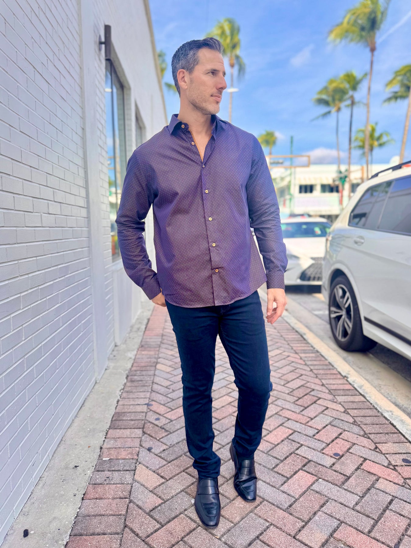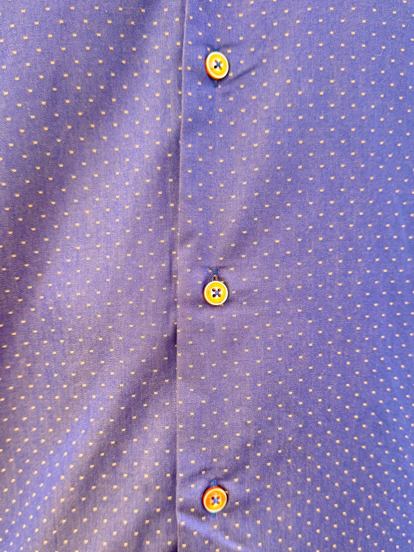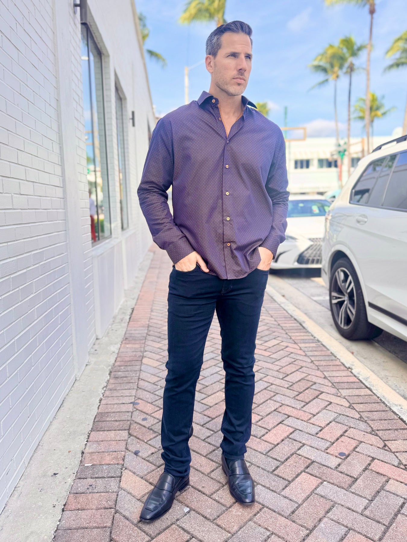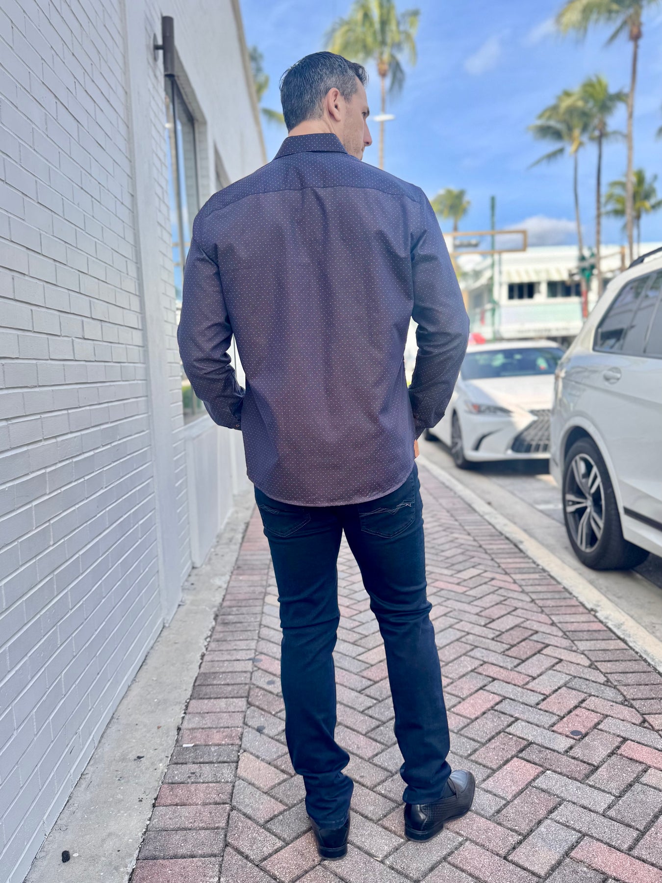 A refined essential with a bold twist, the Indigo Ember Microdot Long Sleeve Button-Down pairs deep indigo tones with subtle microdot patterning for a polished yet modern look. The standout ember-orange contrast at the cuff and hem creates a striking reveal when styled with rolled sleeves or an untucked finish.