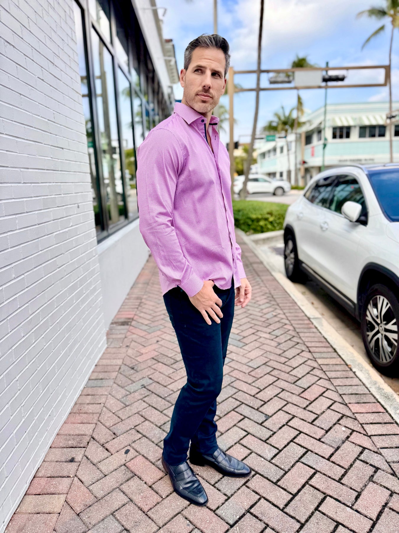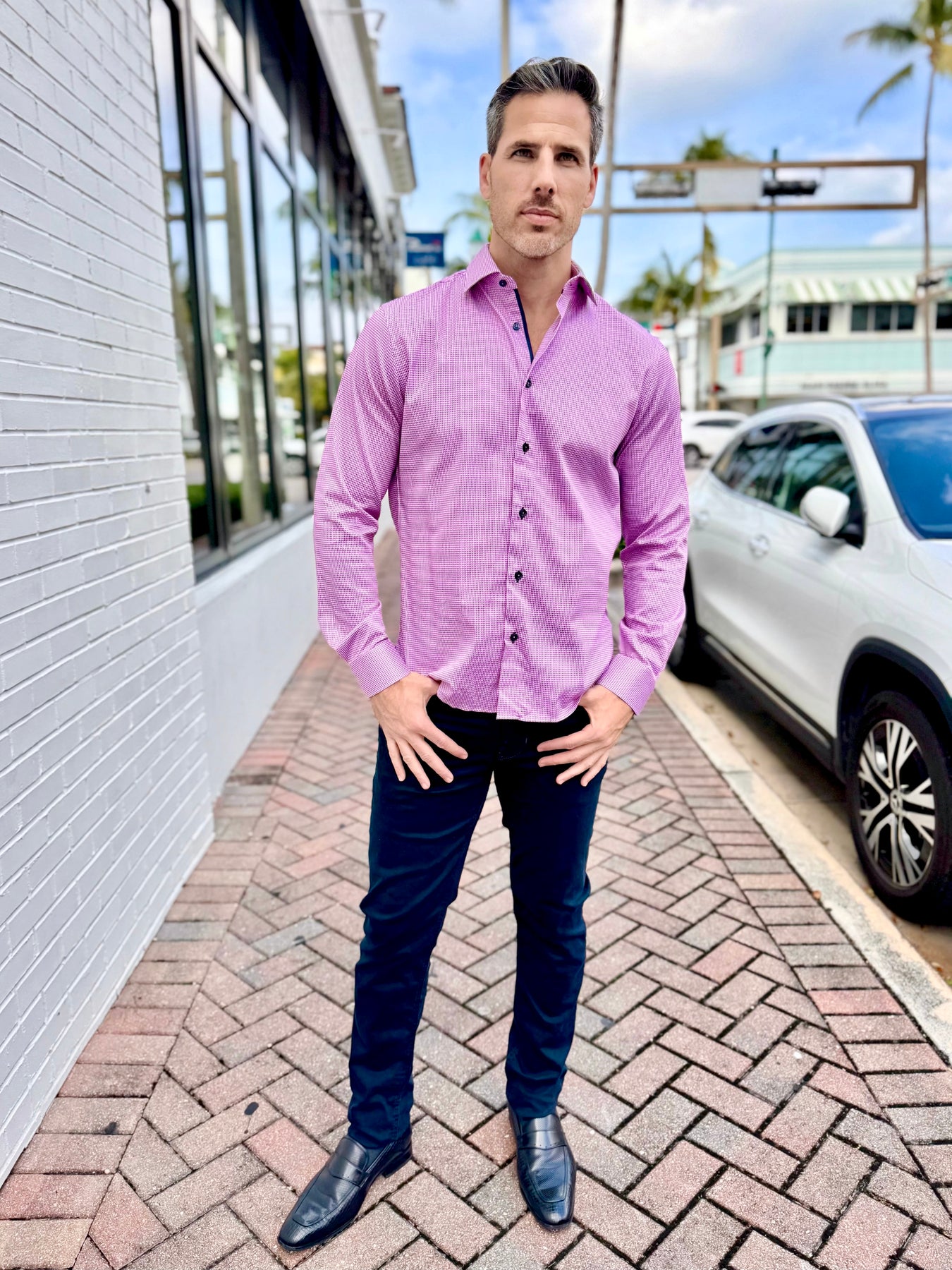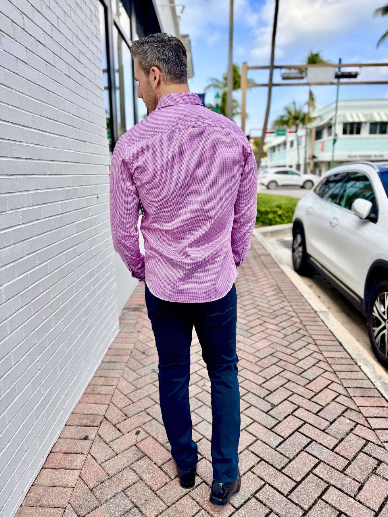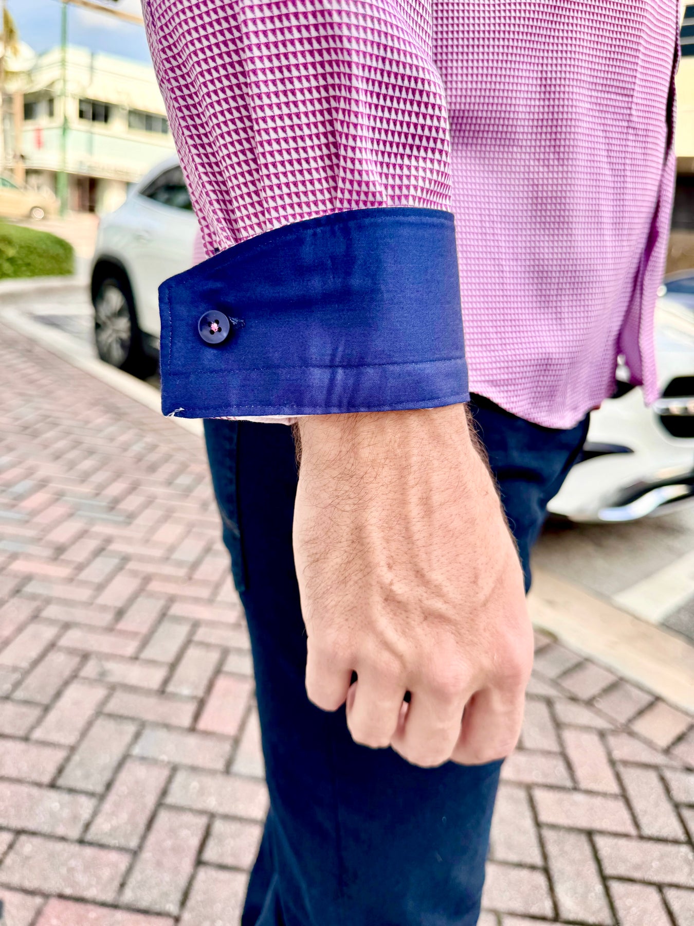 Clean, modern, and subtly bold, the Lilac Matrix Accent Long Sleeve Button-Down brings geometric sophistication to everyday menswear. Its lilac-and-navy micro-pattern creates a refined visual texture, while the deep navy contrast cuff and hem detail add a polished designer finish.