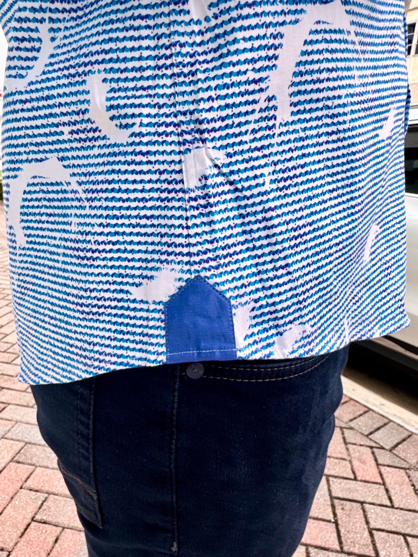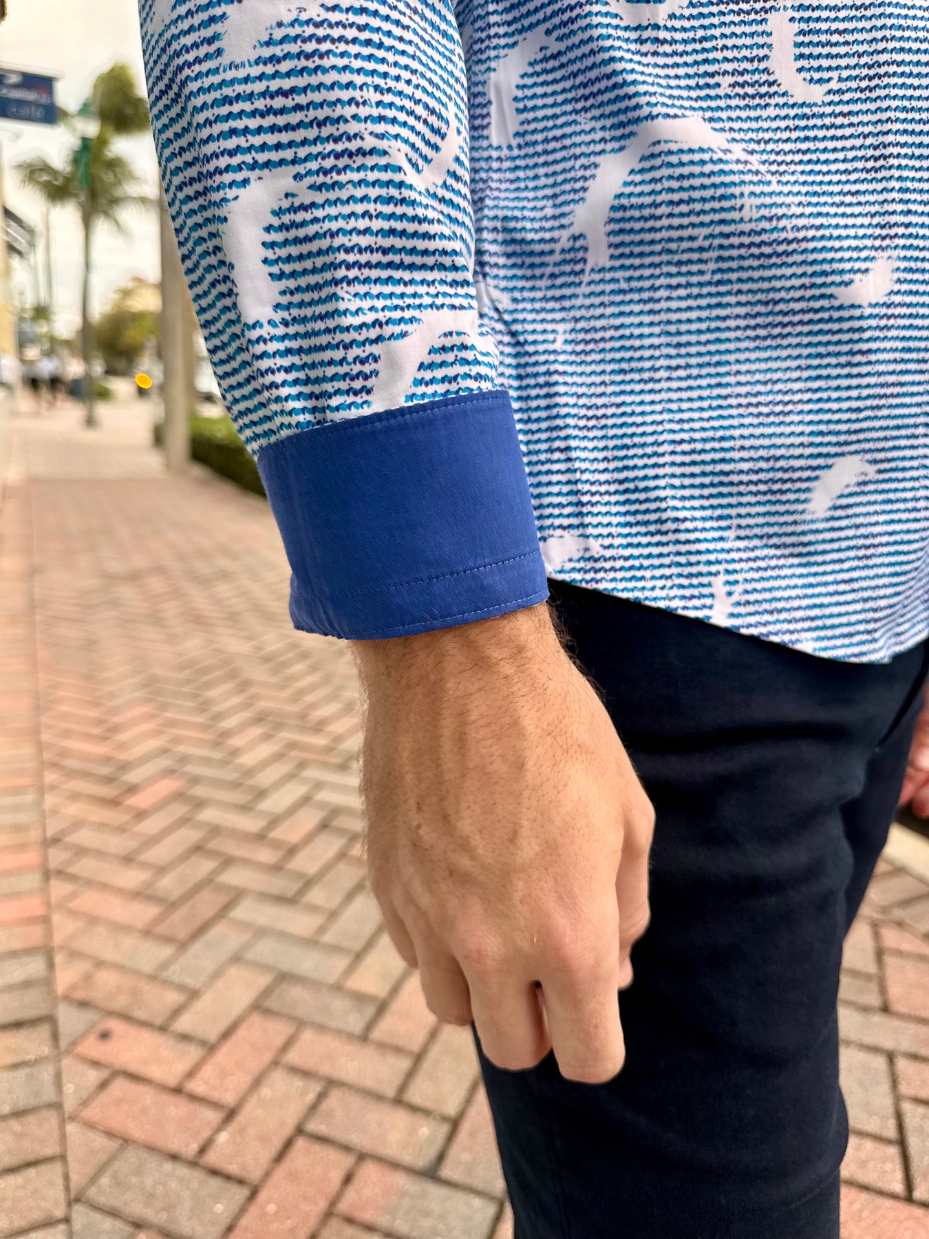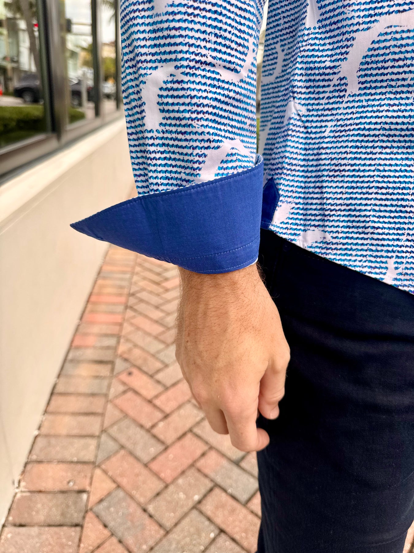 - Solid blue contrast trim at inner placket and cuffs
