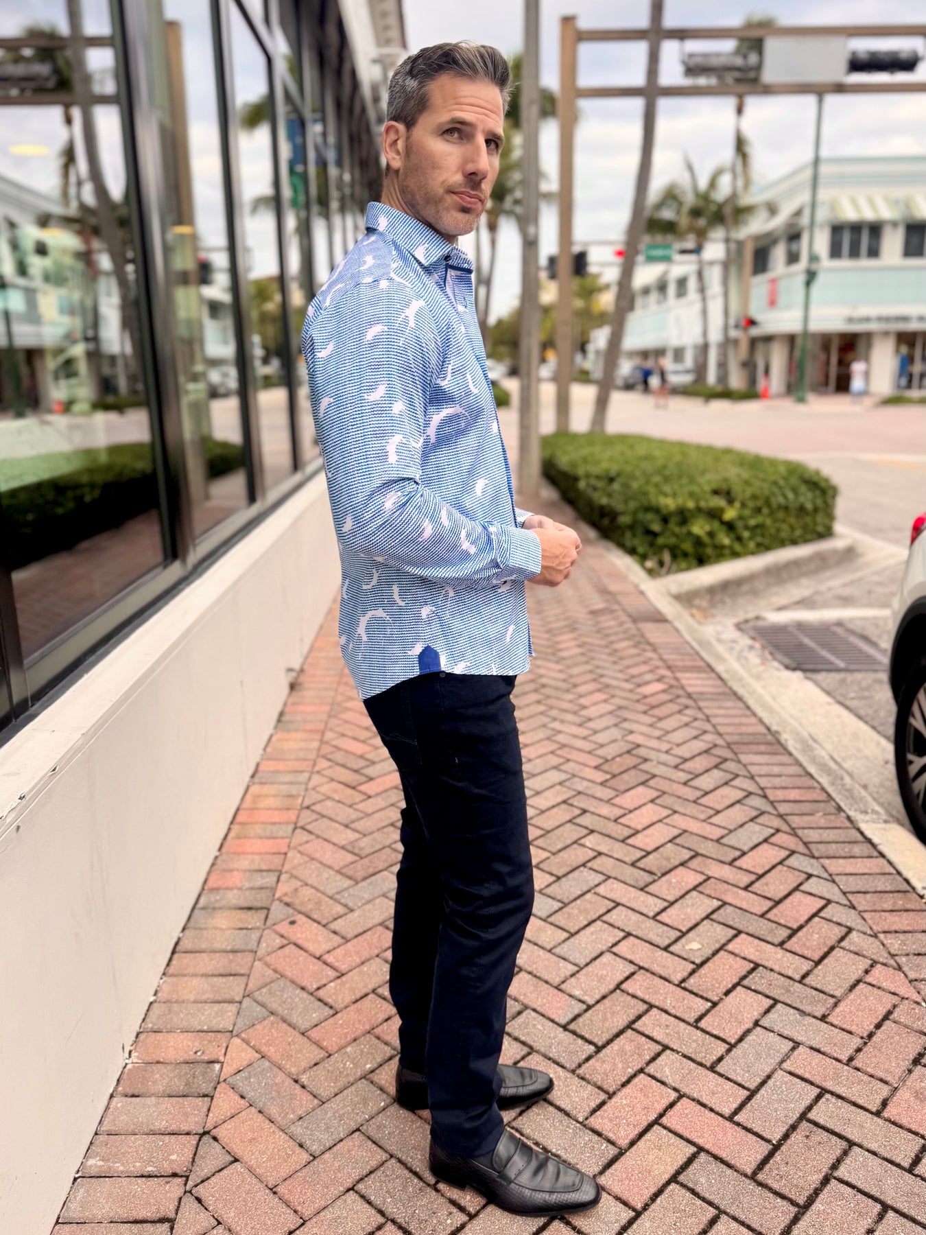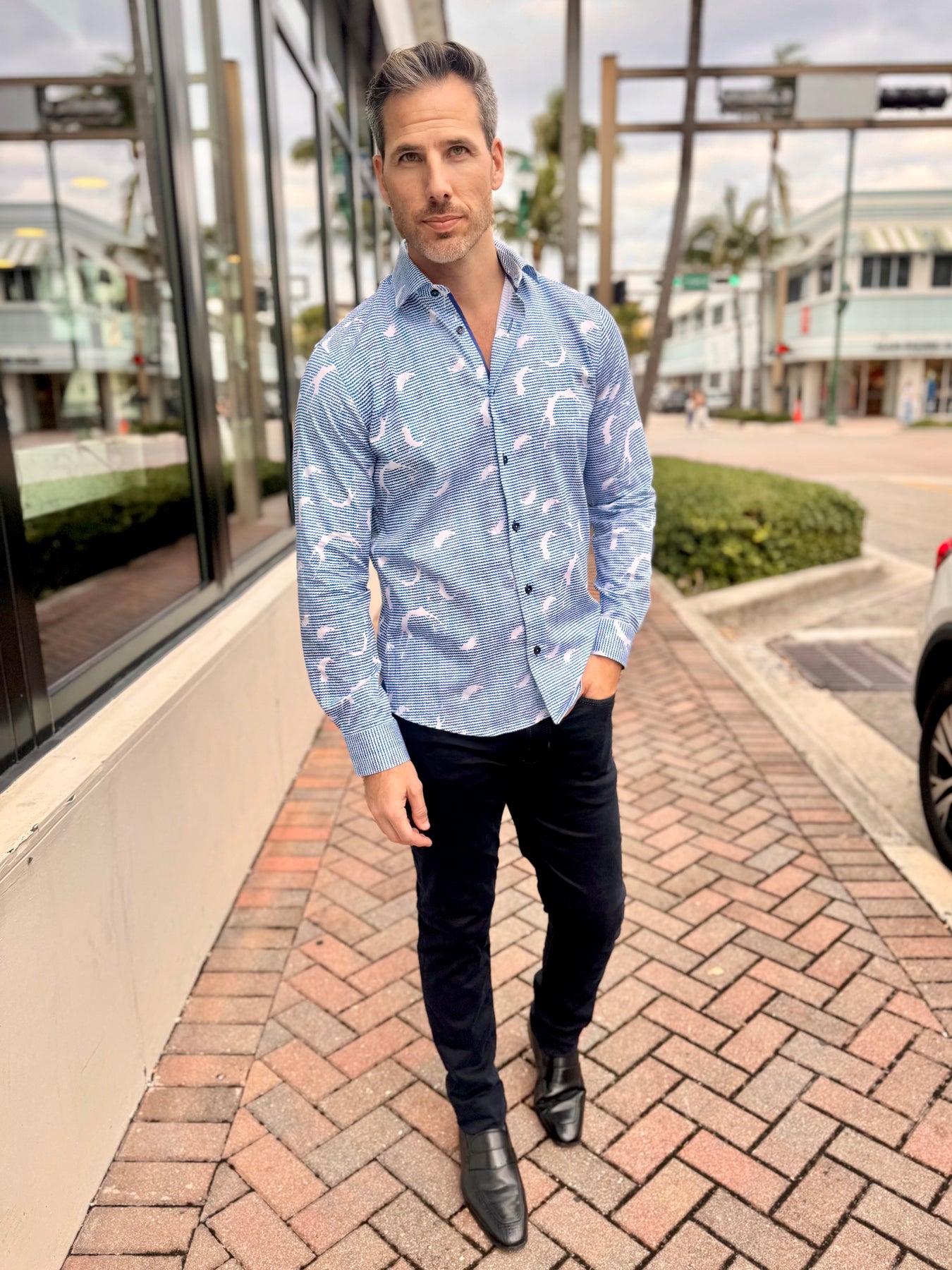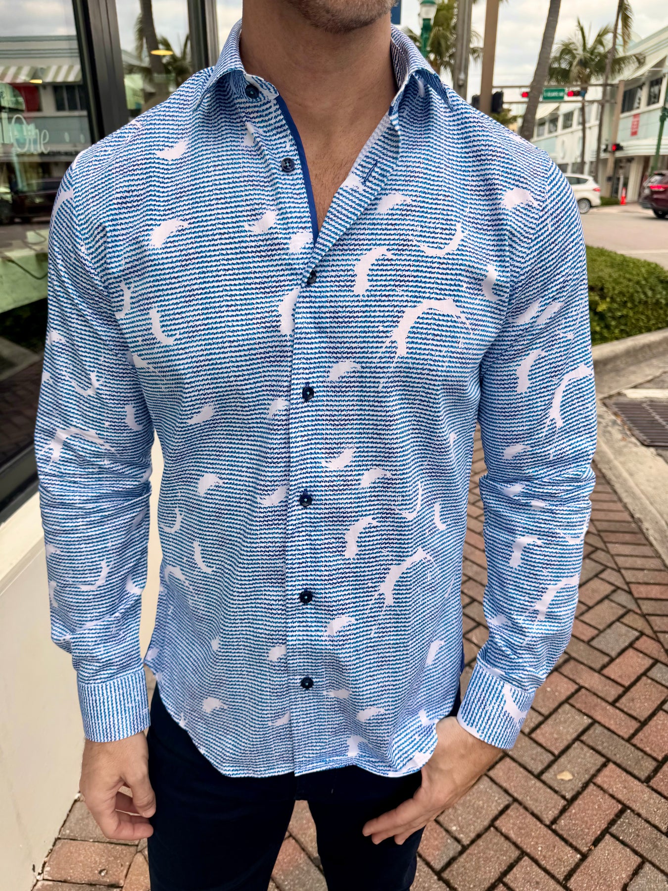 - Solid blue contrast trim at inner placket and cuffs