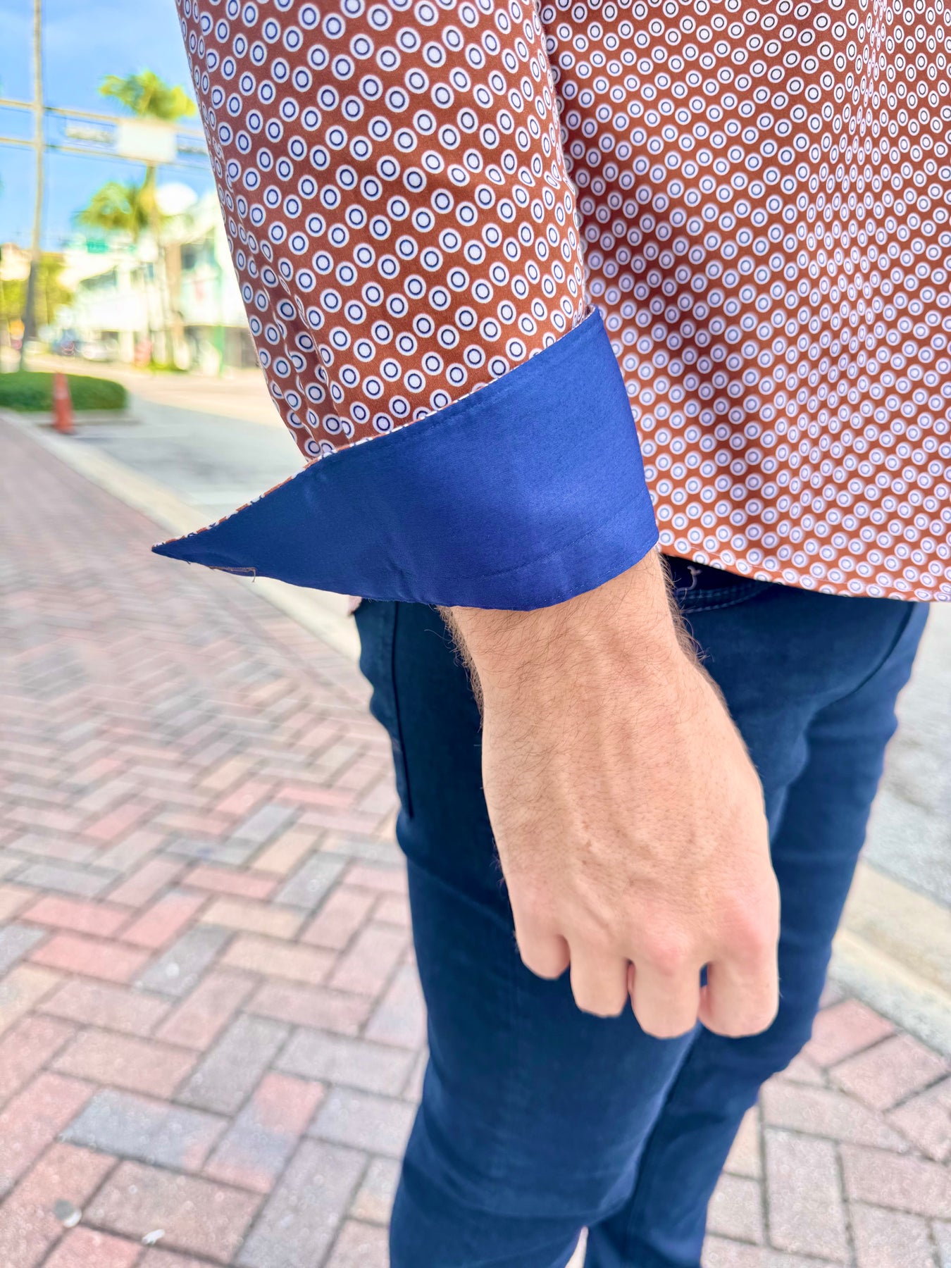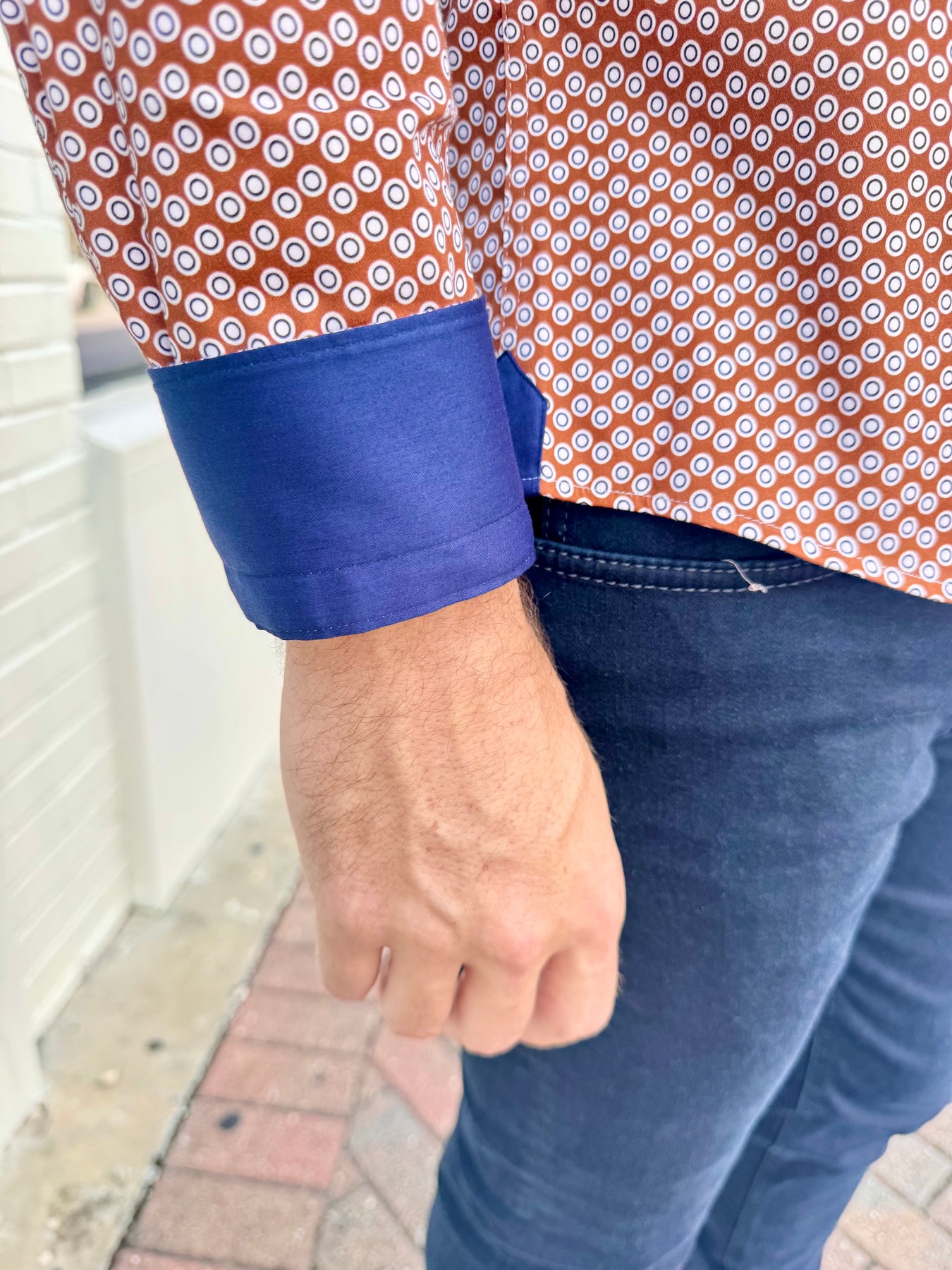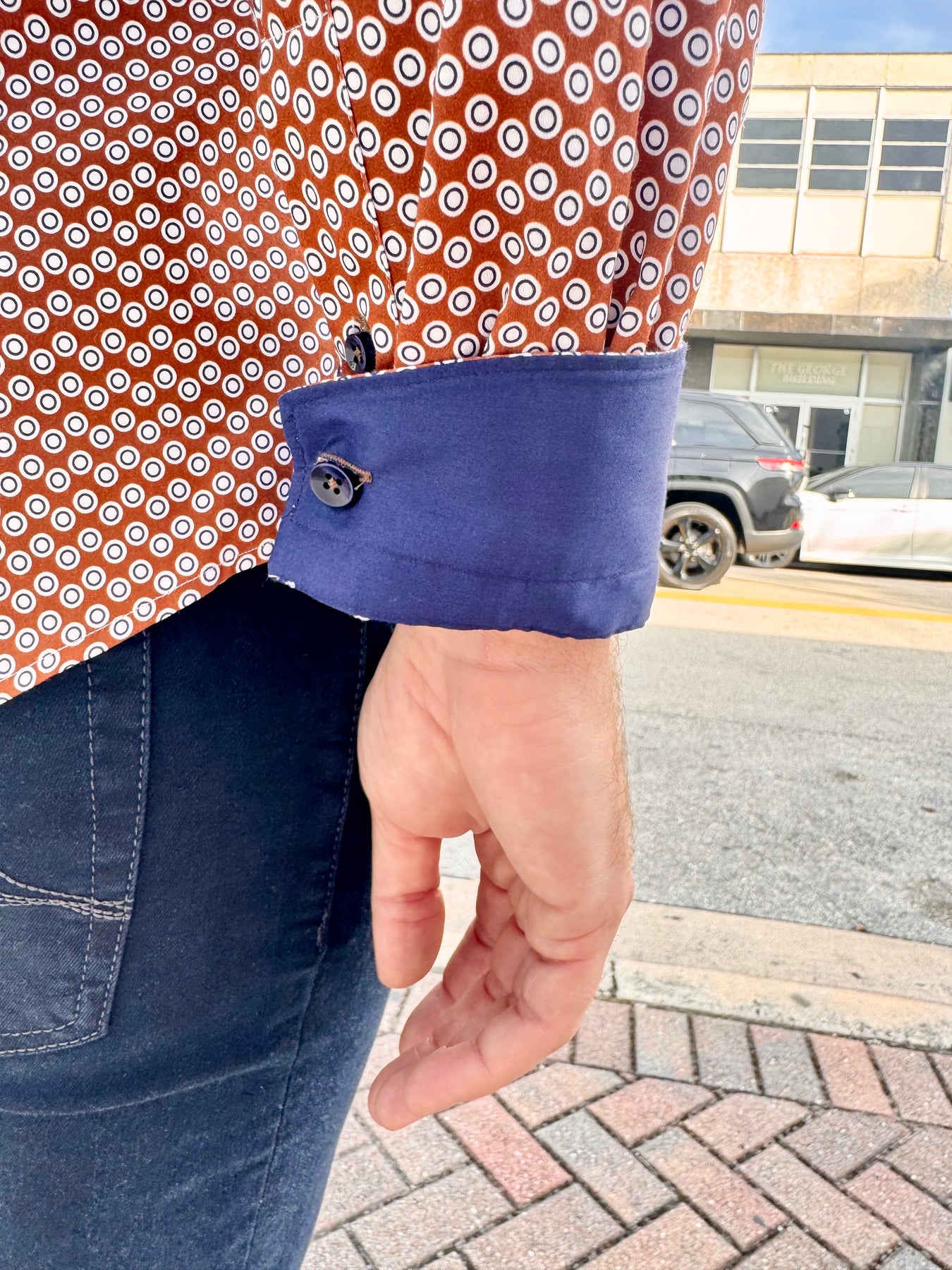 Pair with dark denim or navy chinos to enhance the bold cuff contrast and give the print a modern, refined balance.