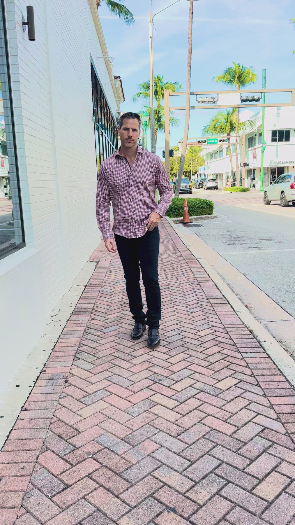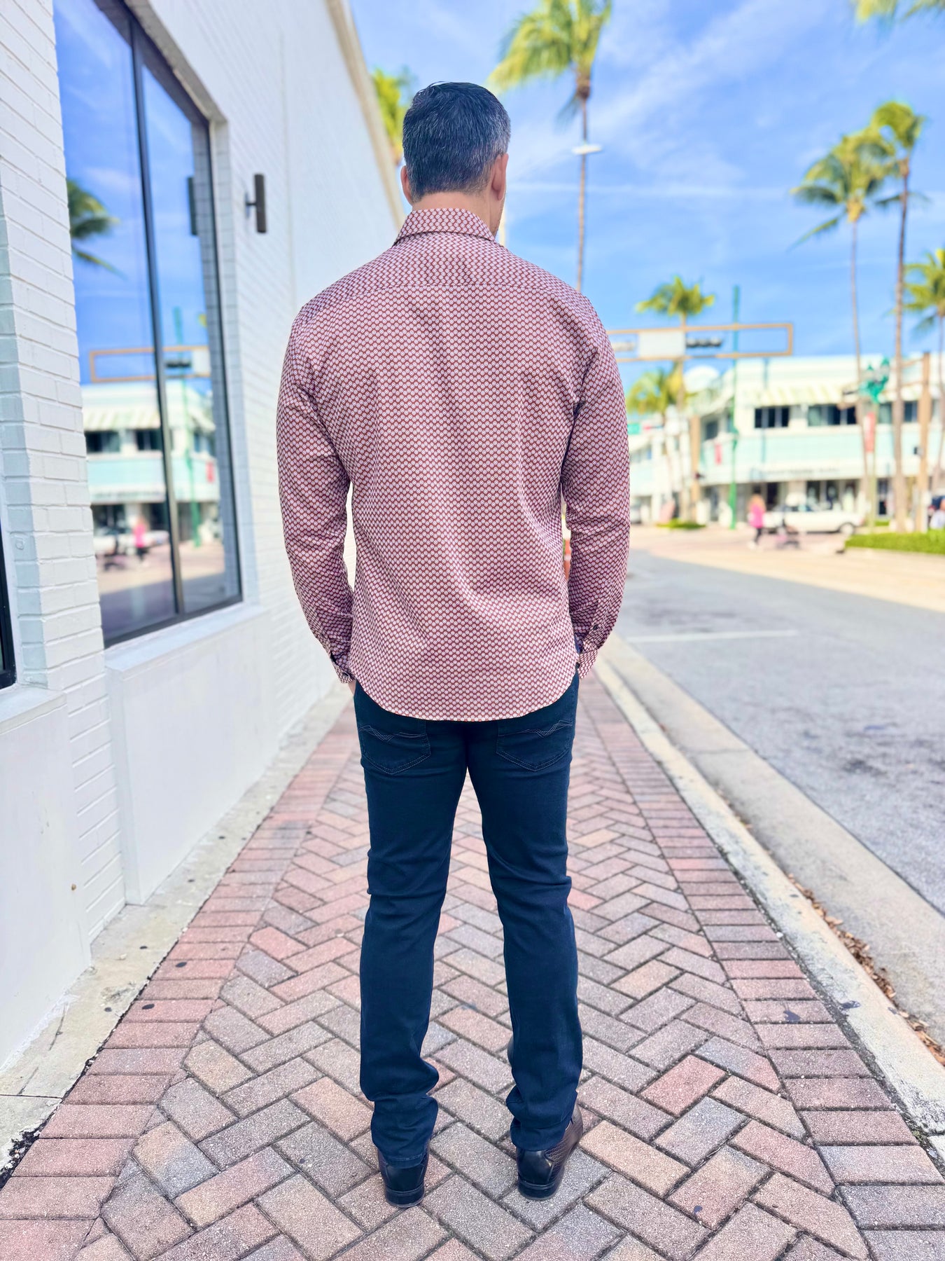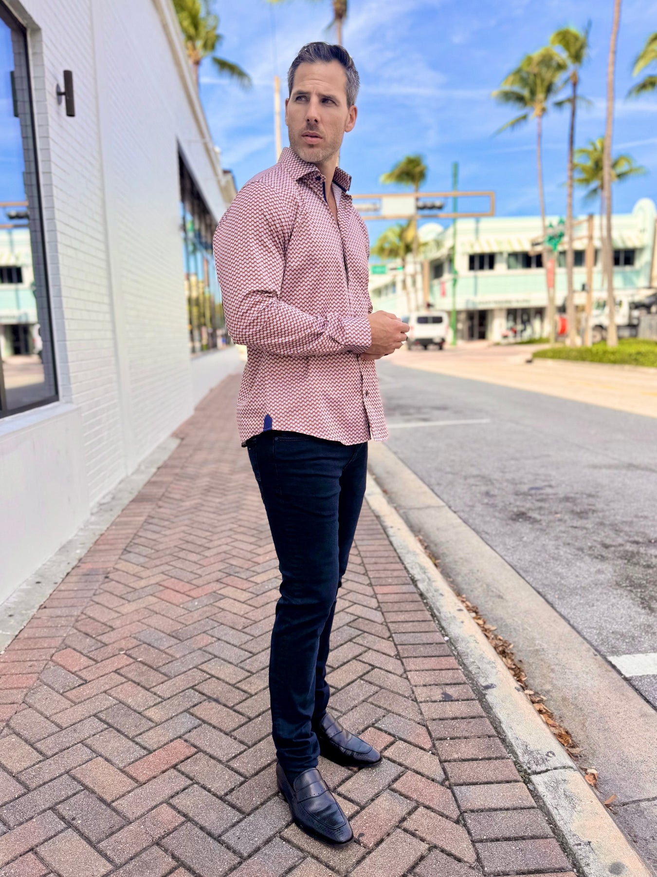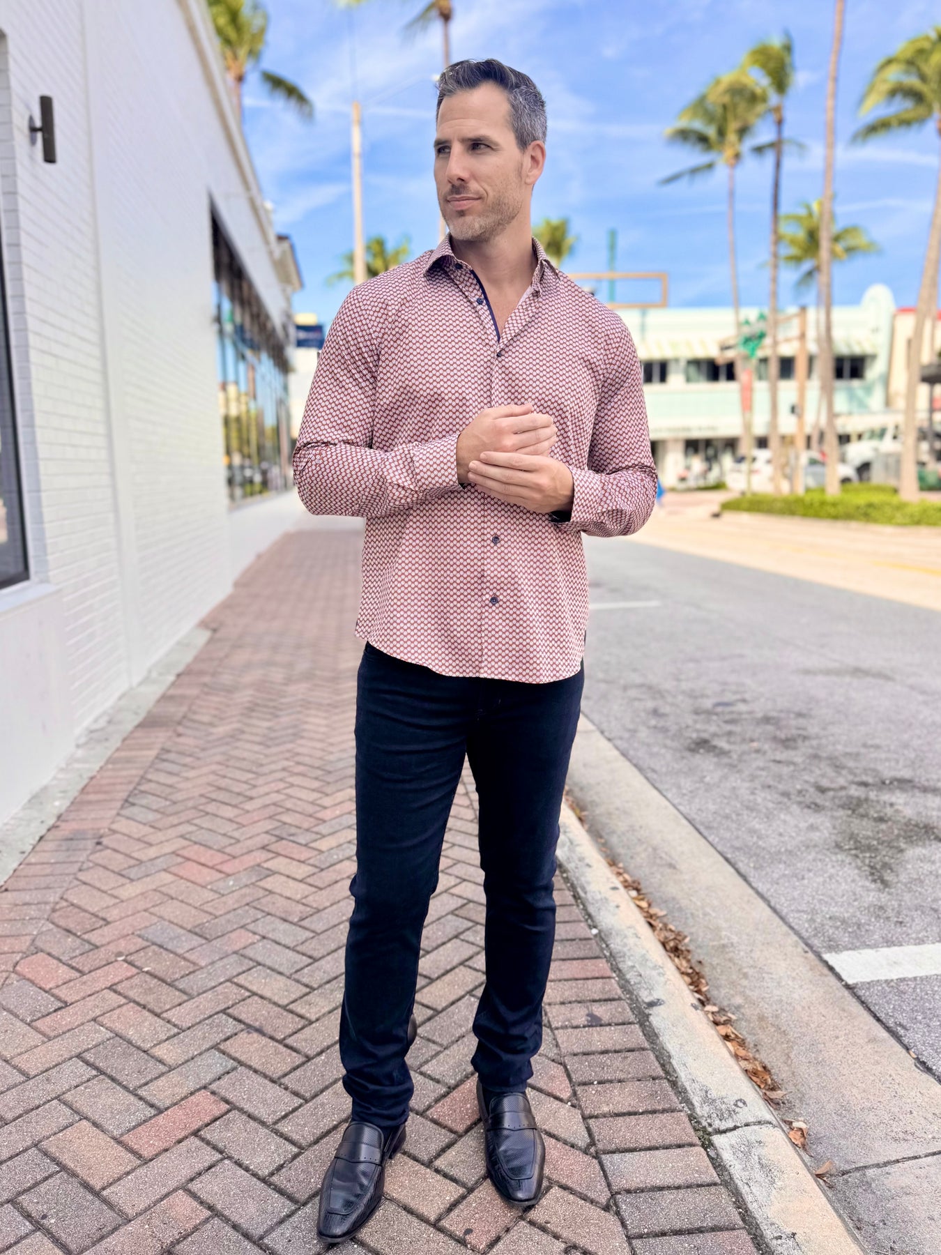 Pair with dark denim or navy chinos to enhance the bold cuff contrast and give the print a modern, refined balance.