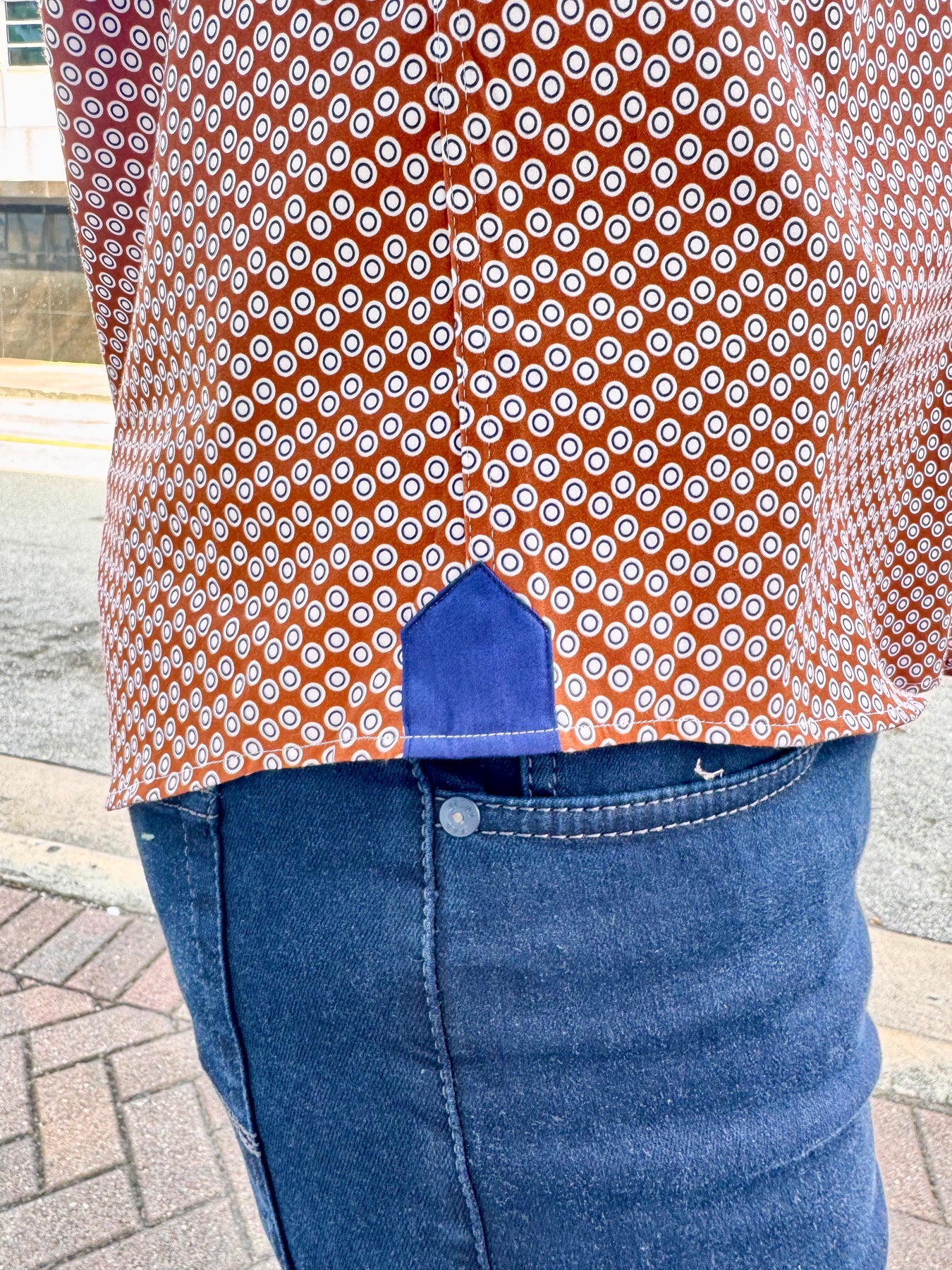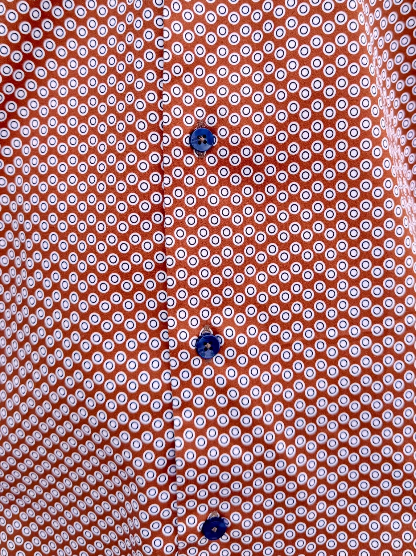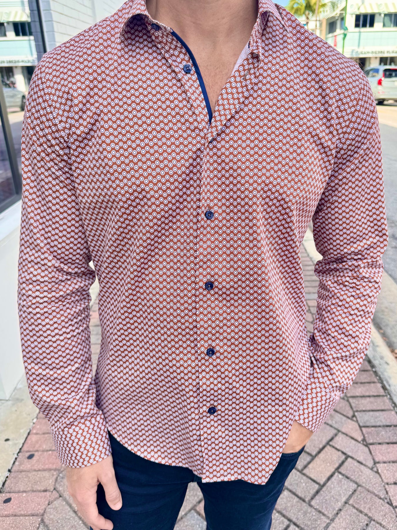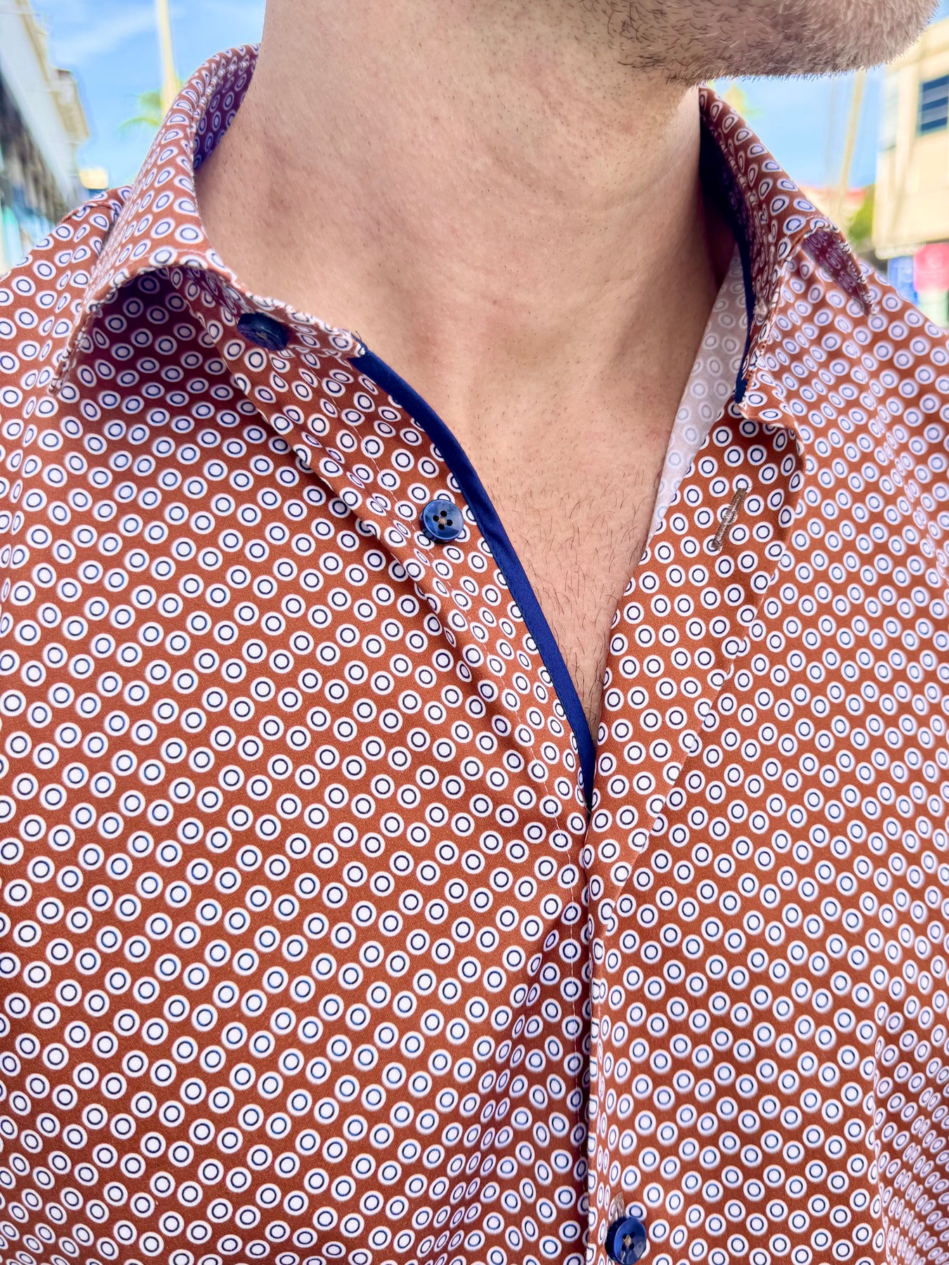 Sophisticated yet full of personality, the Saffron Geo Accent Long Sleeve Button-Down brings refined patterning to the modern man’s wardrobe. Its warm saffron base is layered with crisp geometric detailing, while the rich navy contrast trim and cuff create a polished, standout finish.