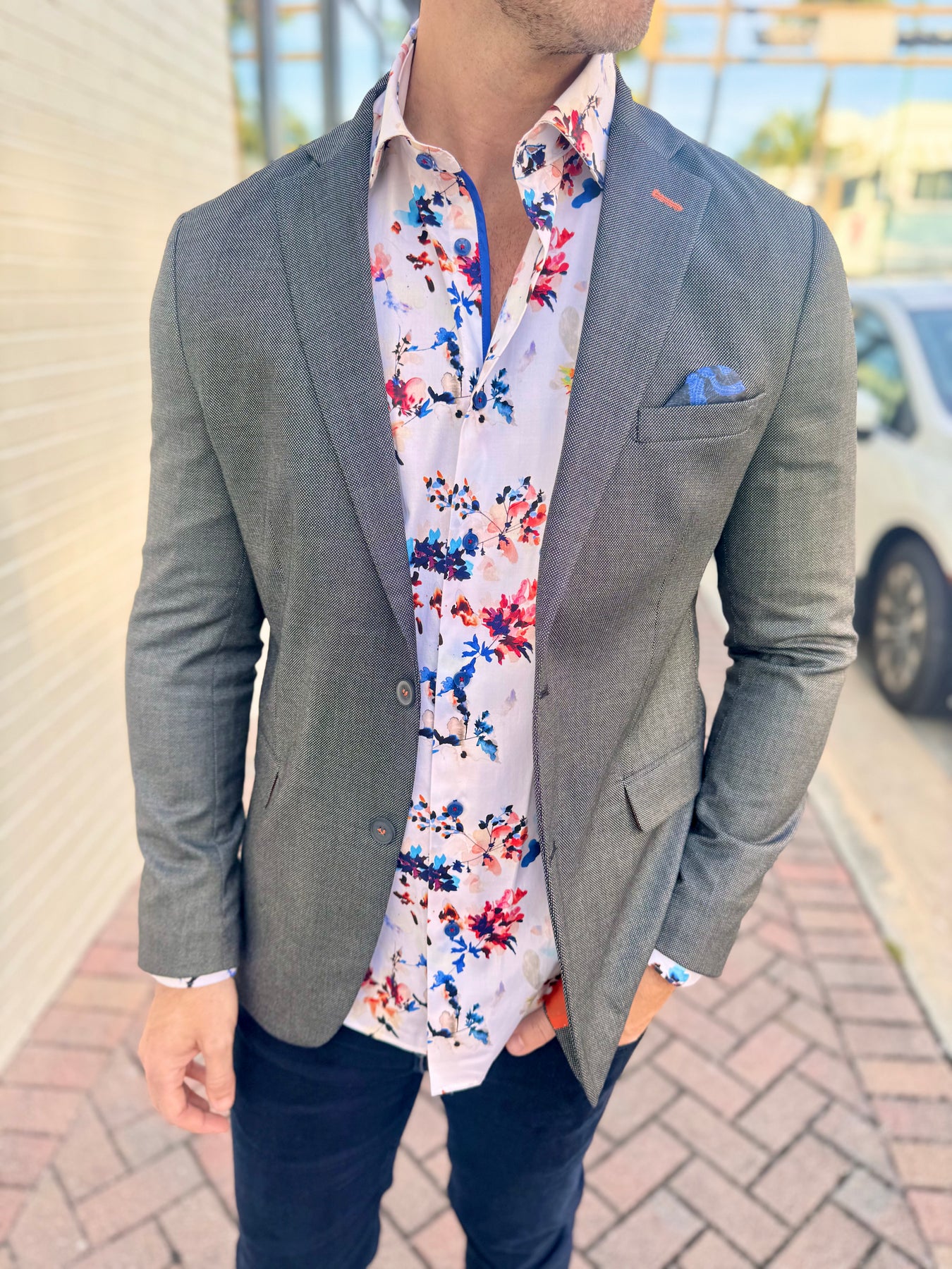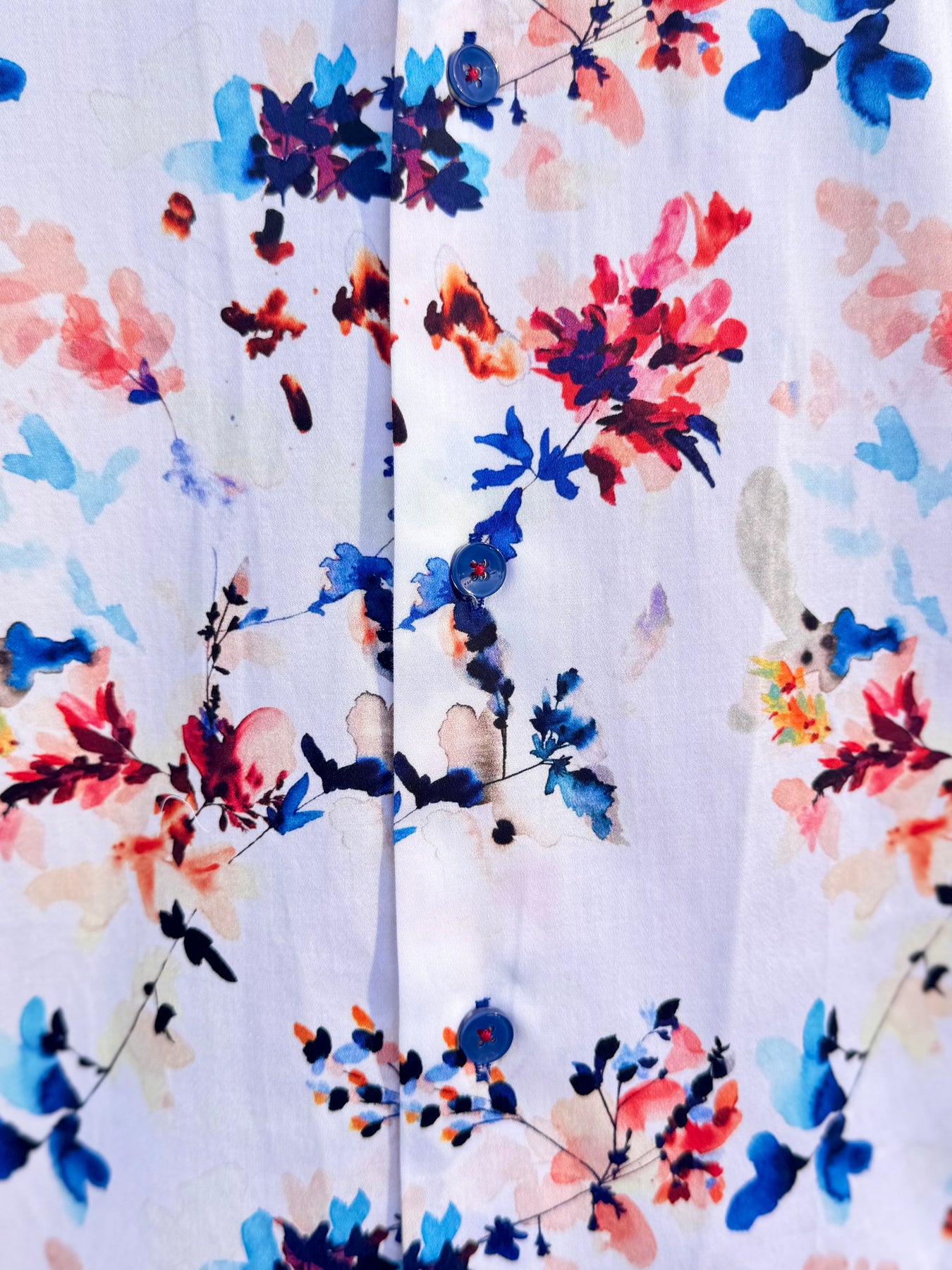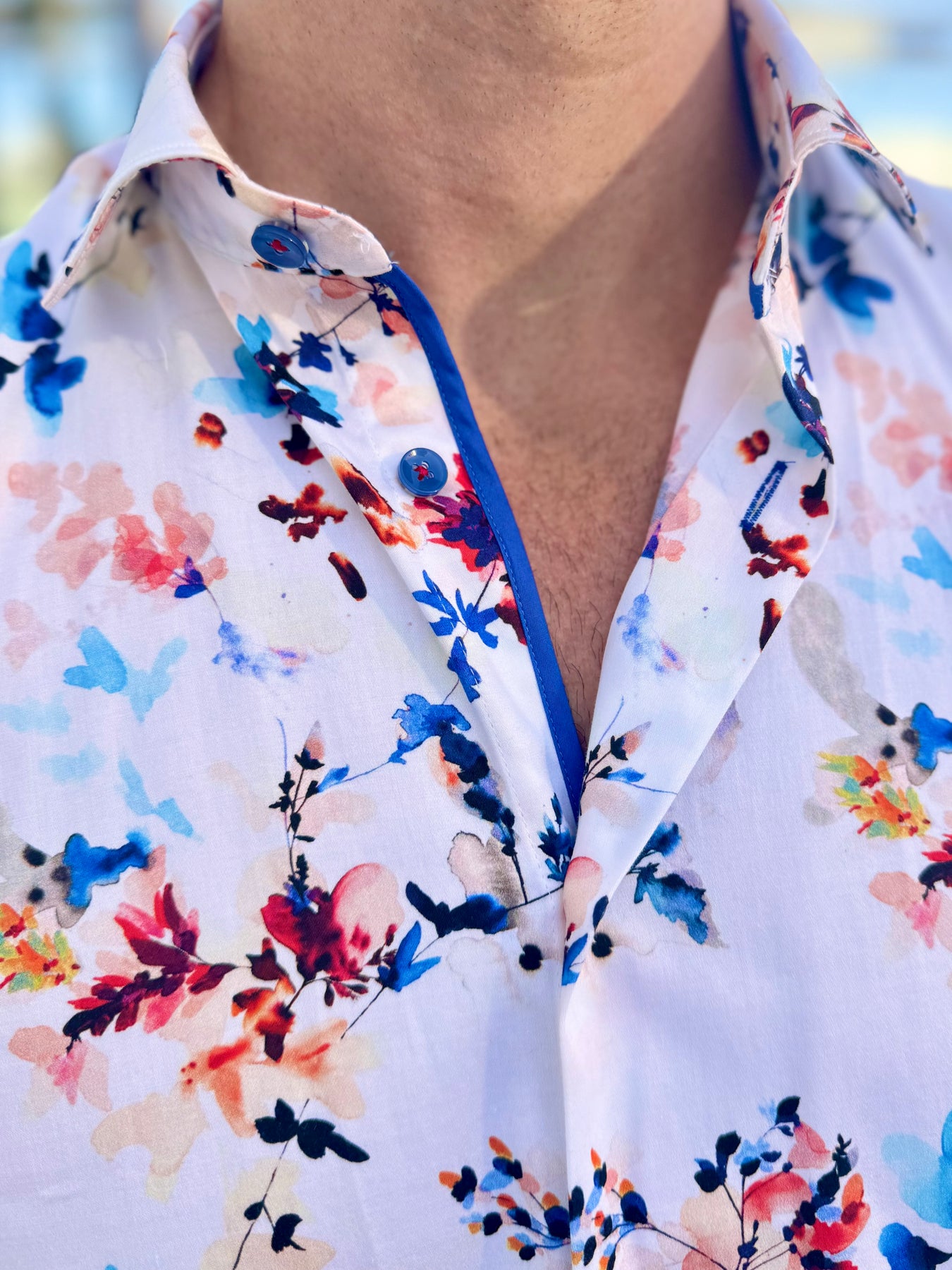 Fresh, vibrant, and effortlessly refined, the Coastal Bloom Signature Long Sleeve Button-Down brings a modern, resort-inspired twist to classic menswear. Its watercolor floral print blends coral, navy, and sky-blue tones on a soft ivory base, while bold cobalt contrast details elevate every rolled sleeve and movement.