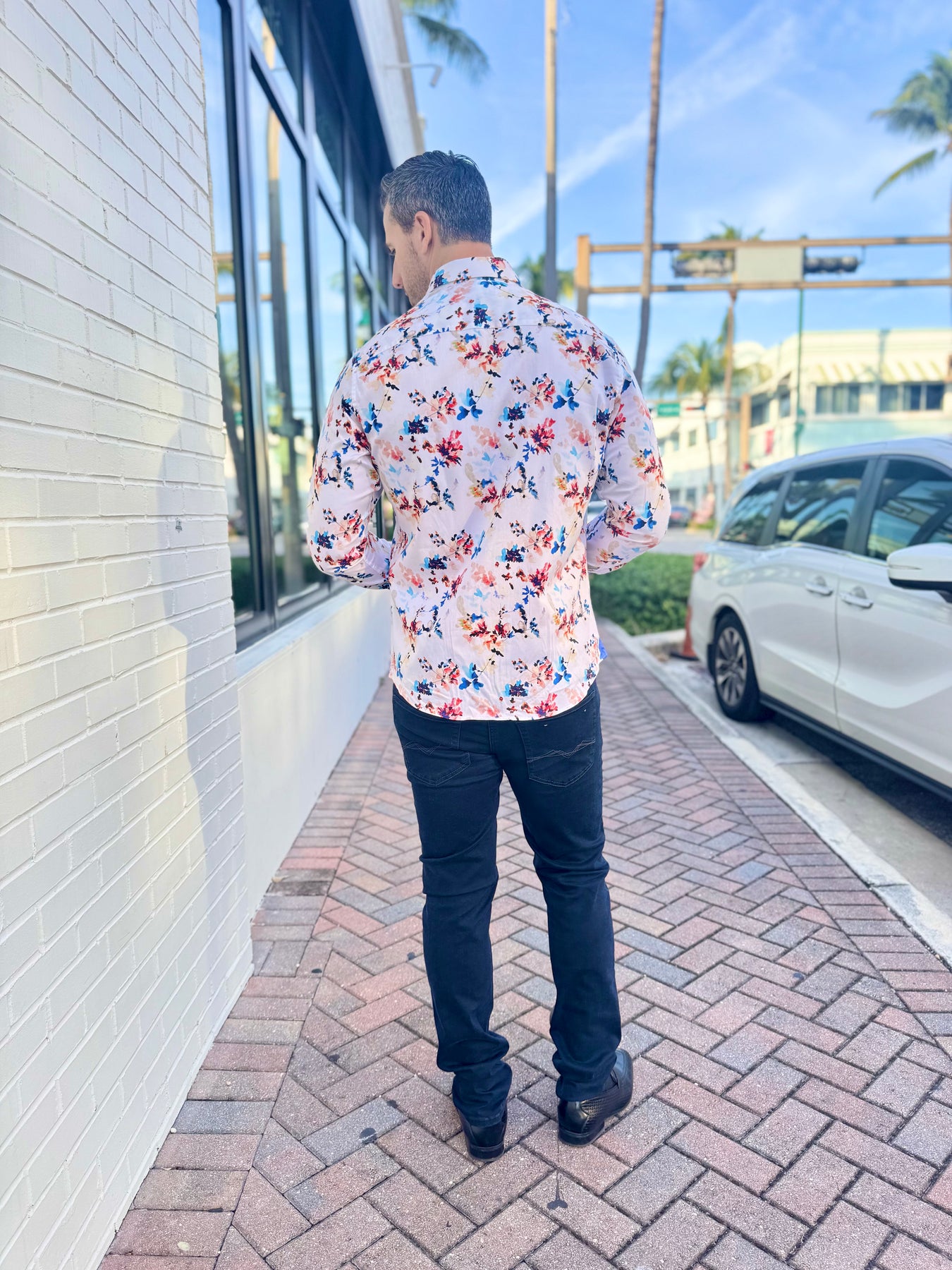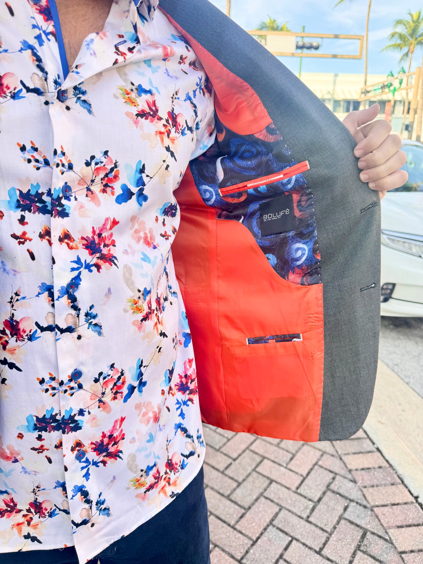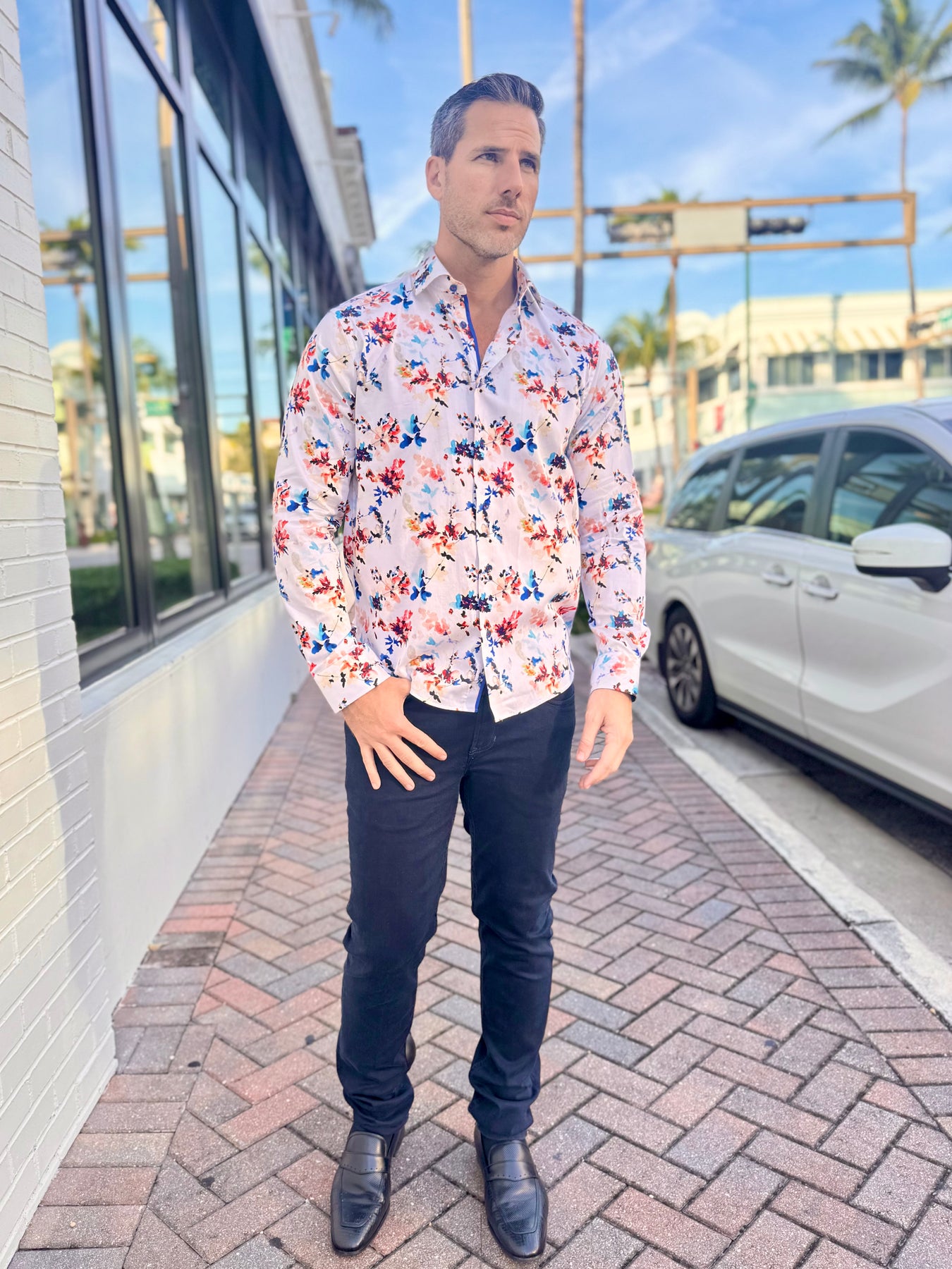 Fresh, vibrant, and effortlessly refined, the Coastal Bloom Signature Long Sleeve Button-Down brings a modern, resort-inspired twist to classic menswear. Its watercolor floral print blends coral, navy, and sky-blue tones on a soft ivory base, while bold cobalt contrast details elevate every rolled sleeve and movement.