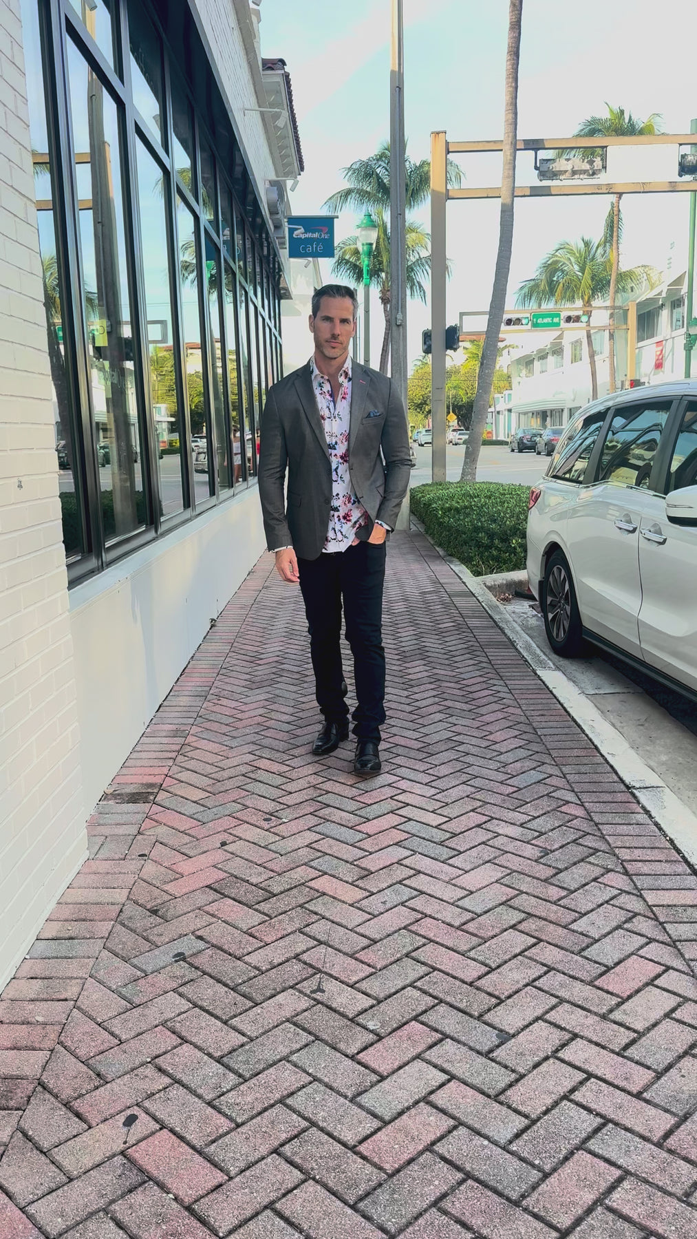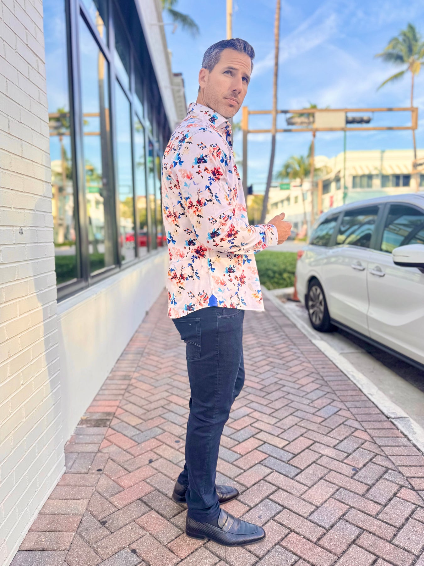 Pair with white or navy slim chinos for a crisp, coastal-lux look. Roll the sleeves to show off the cobalt cuff and bring out the cool tones in the print.