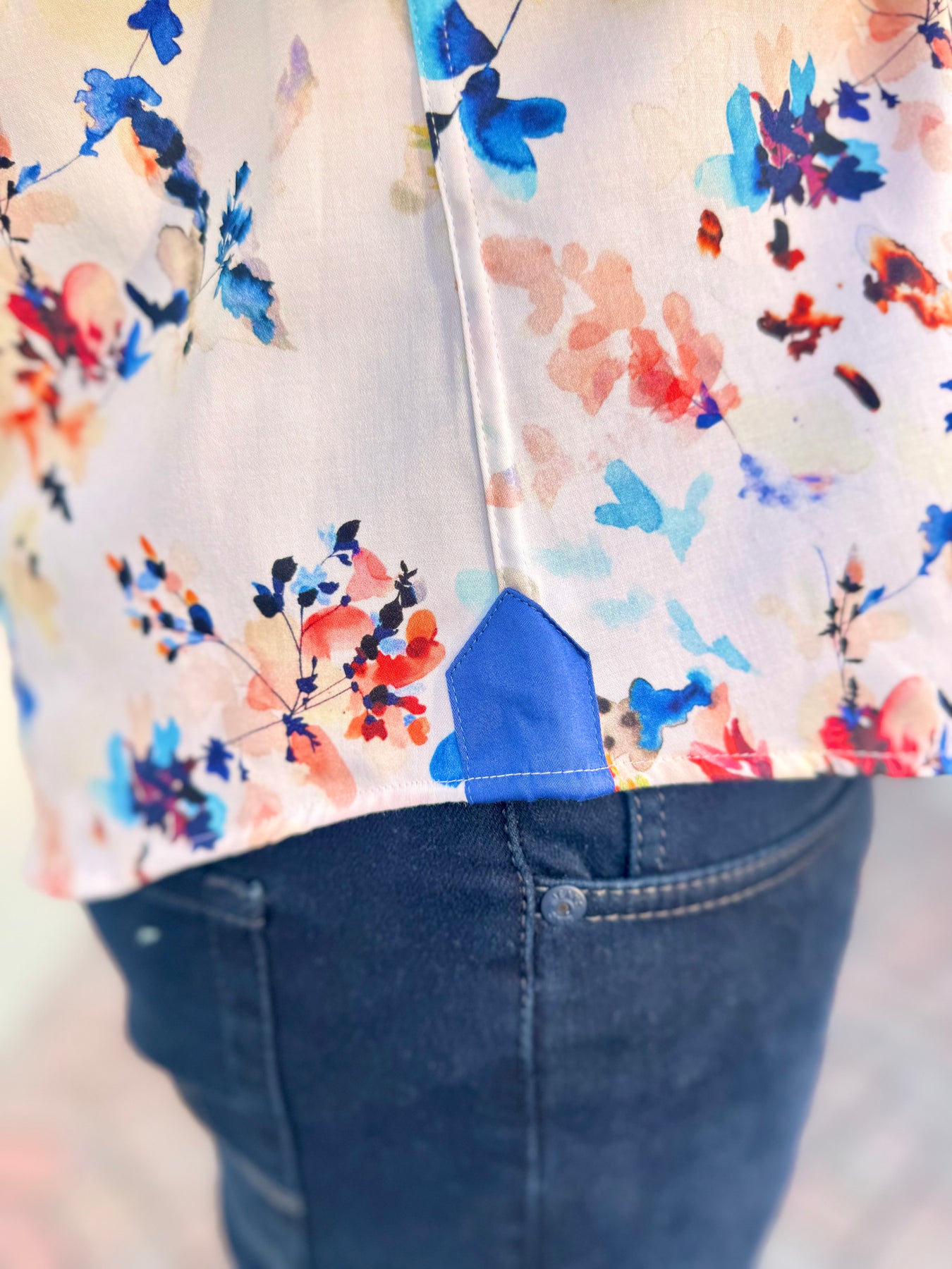 Matching contrast hem tab for a clean designer touch when untucked