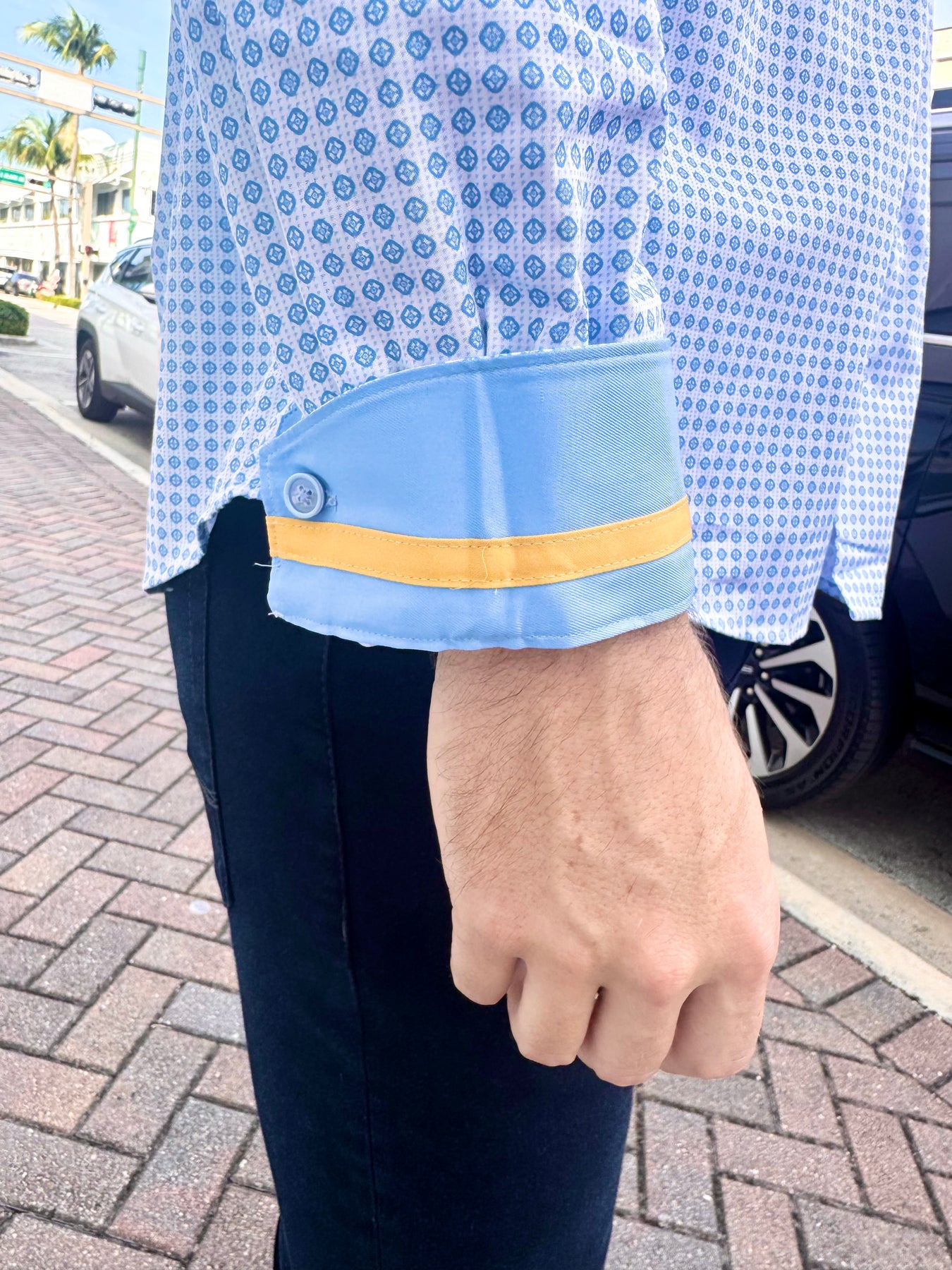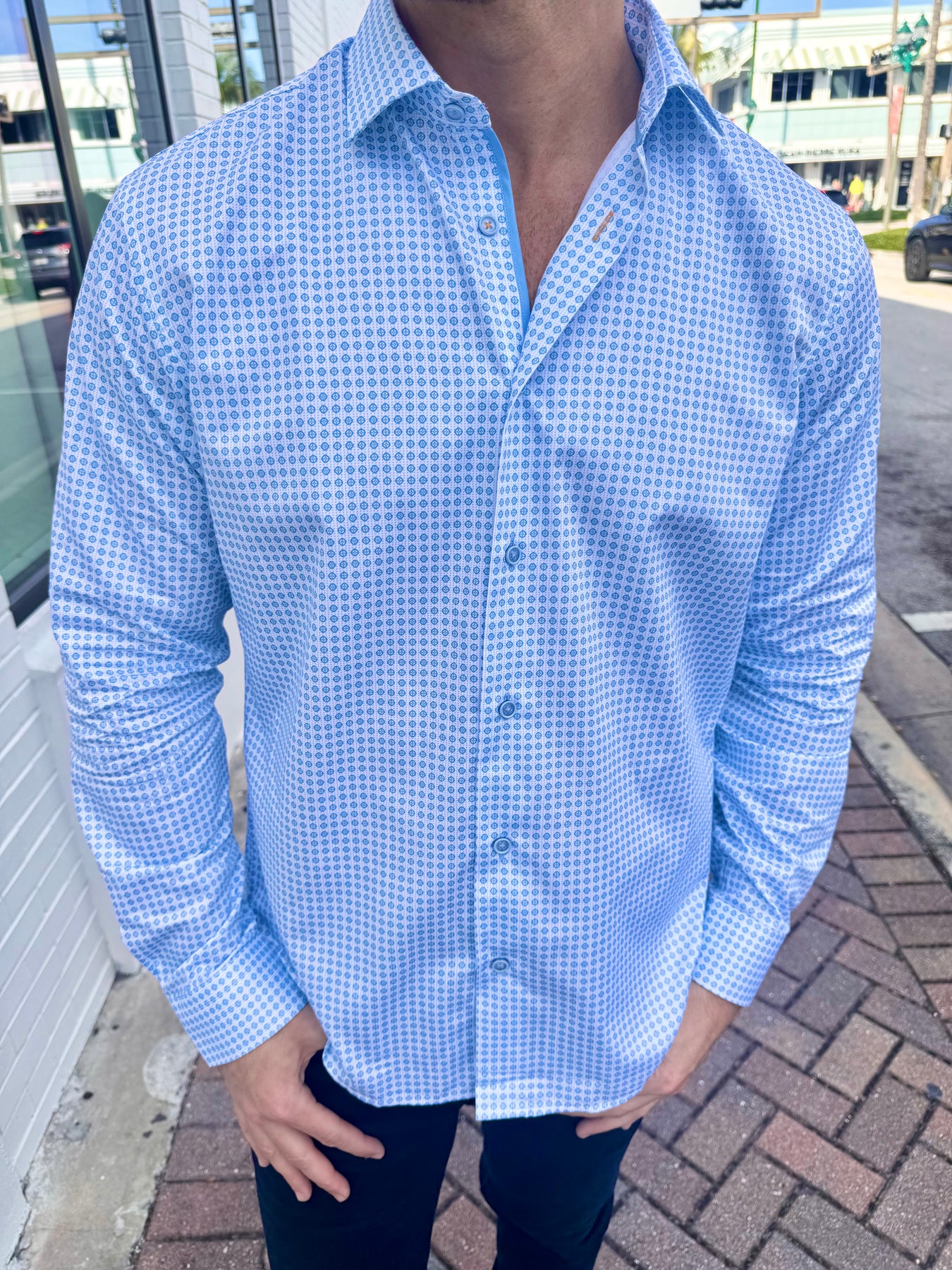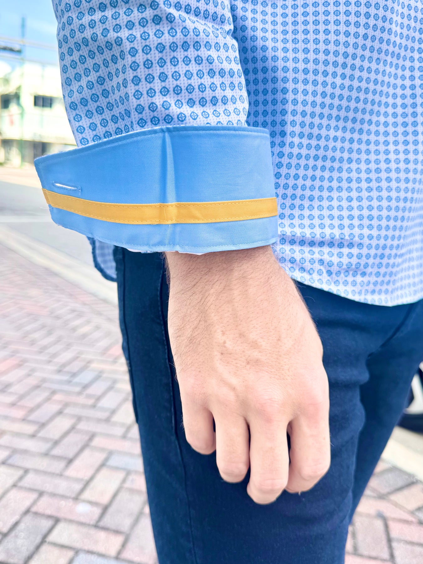 Clean, crisp, and effortlessly elevated, the Skyline Geo Accent Long Sleeve Button-Down blends cool blue tones with a refined geometric print for a modern, polished look. Light sky-blue trim and a bold gold accent stripe inside the cuff add the perfect touch of personality—subtle when worn down, striking when styled with rolled sleeves.