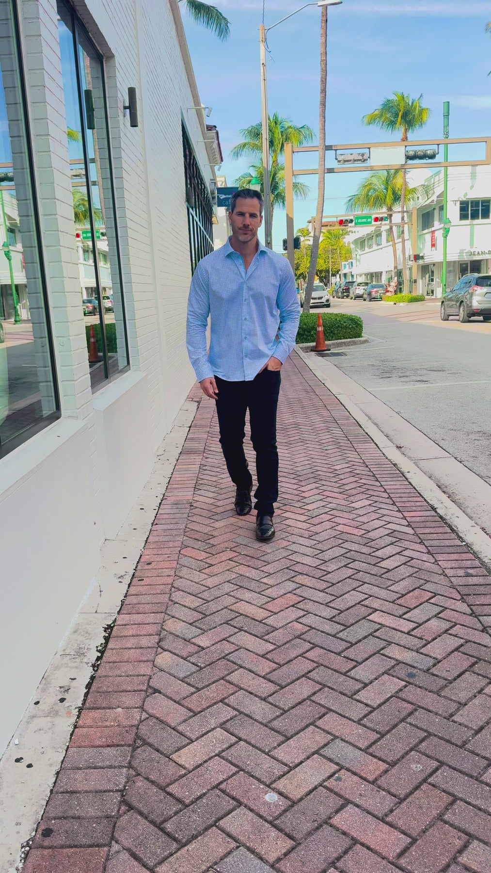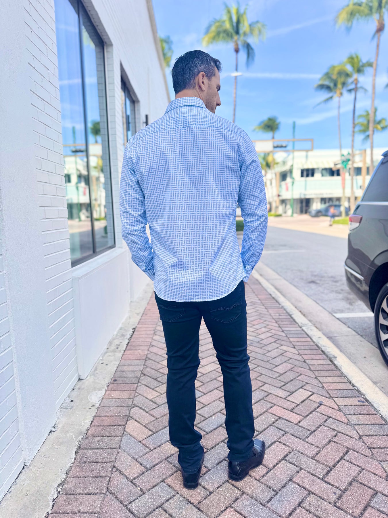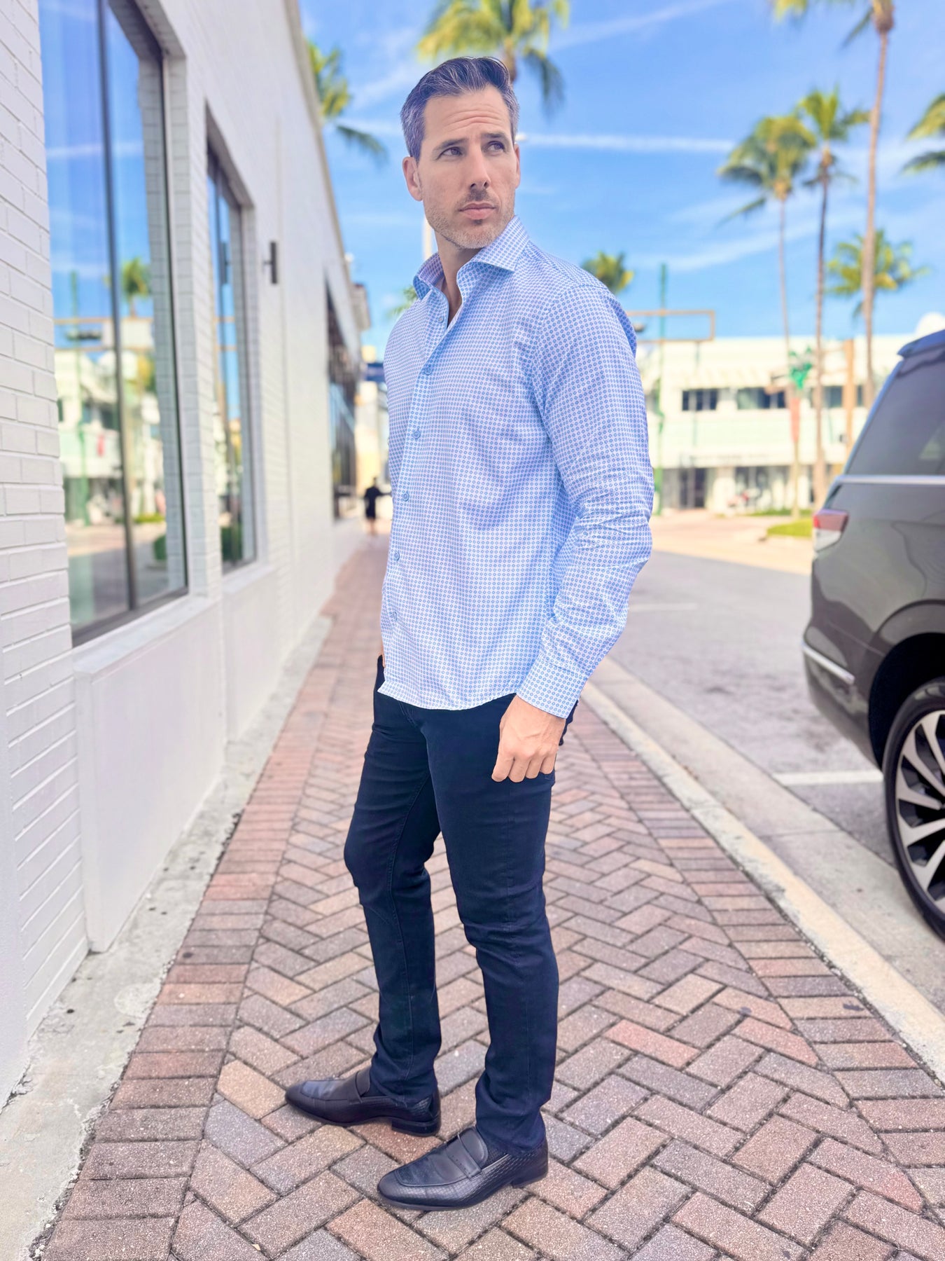 Clean, crisp, and effortlessly elevated, the Skyline Geo Accent Long Sleeve Button-Down blends cool blue tones with a refined geometric print for a modern, polished look. Light sky-blue trim and a bold gold accent stripe inside the cuff add the perfect touch of personality—subtle when worn down, striking when styled with rolled sleeves.