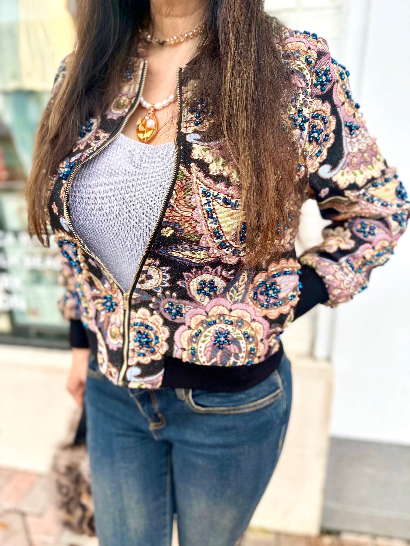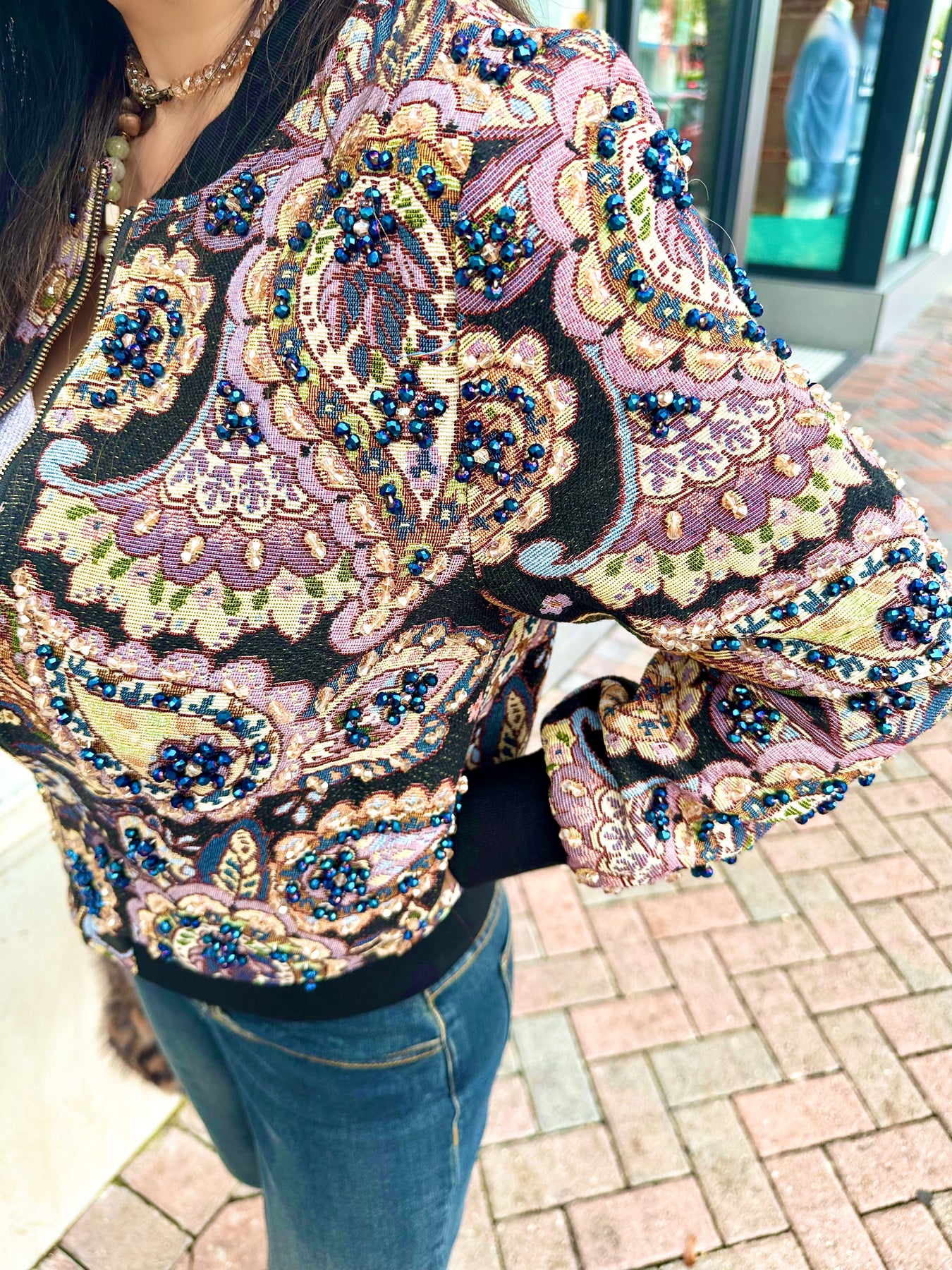 Turn heads in the Midnight Muse Bomber Jacket, a statement jacket that blends rich tapestry textures with a modern silhouette. Designed with intricate floral and paisley brocade in deep jewel tones, this luxe bomber features a front zip closure, contrast ribbed hem and cuffs, and subtle shimmer embellishment woven throughout. Whether dressed up for date night or thrown over denim for daytime glam, this jacket adds a touch of vintage elegance to any look.