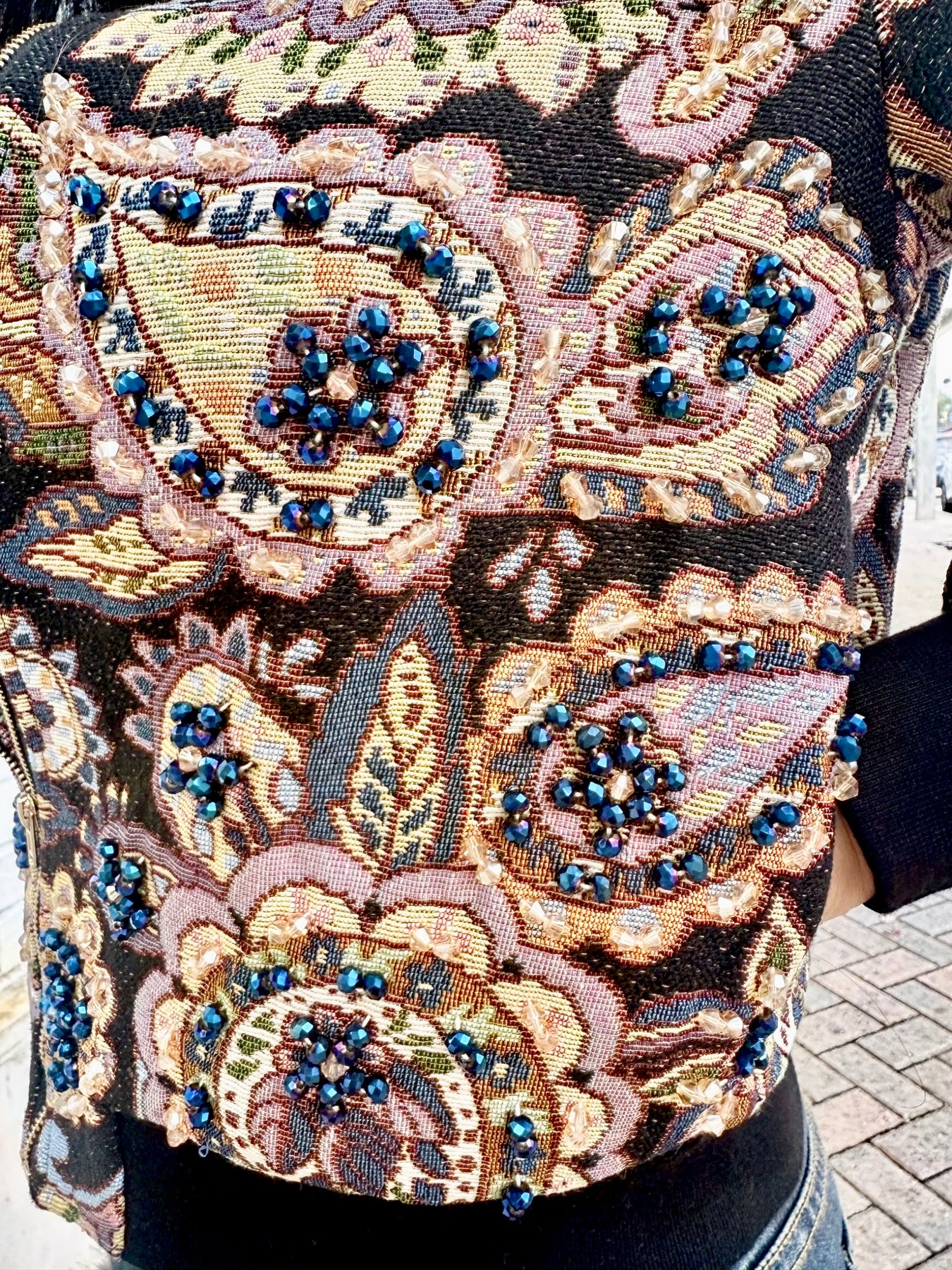 Black and jewel-tone floral and paisley brocade pattern
