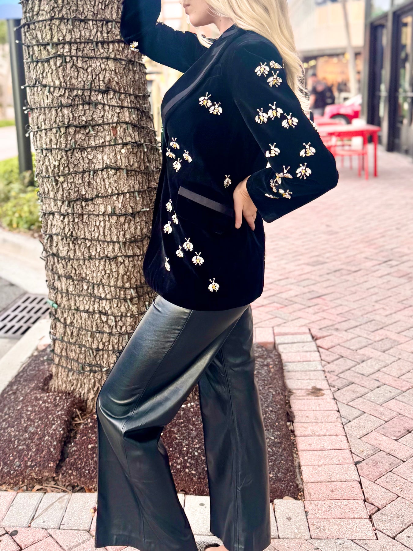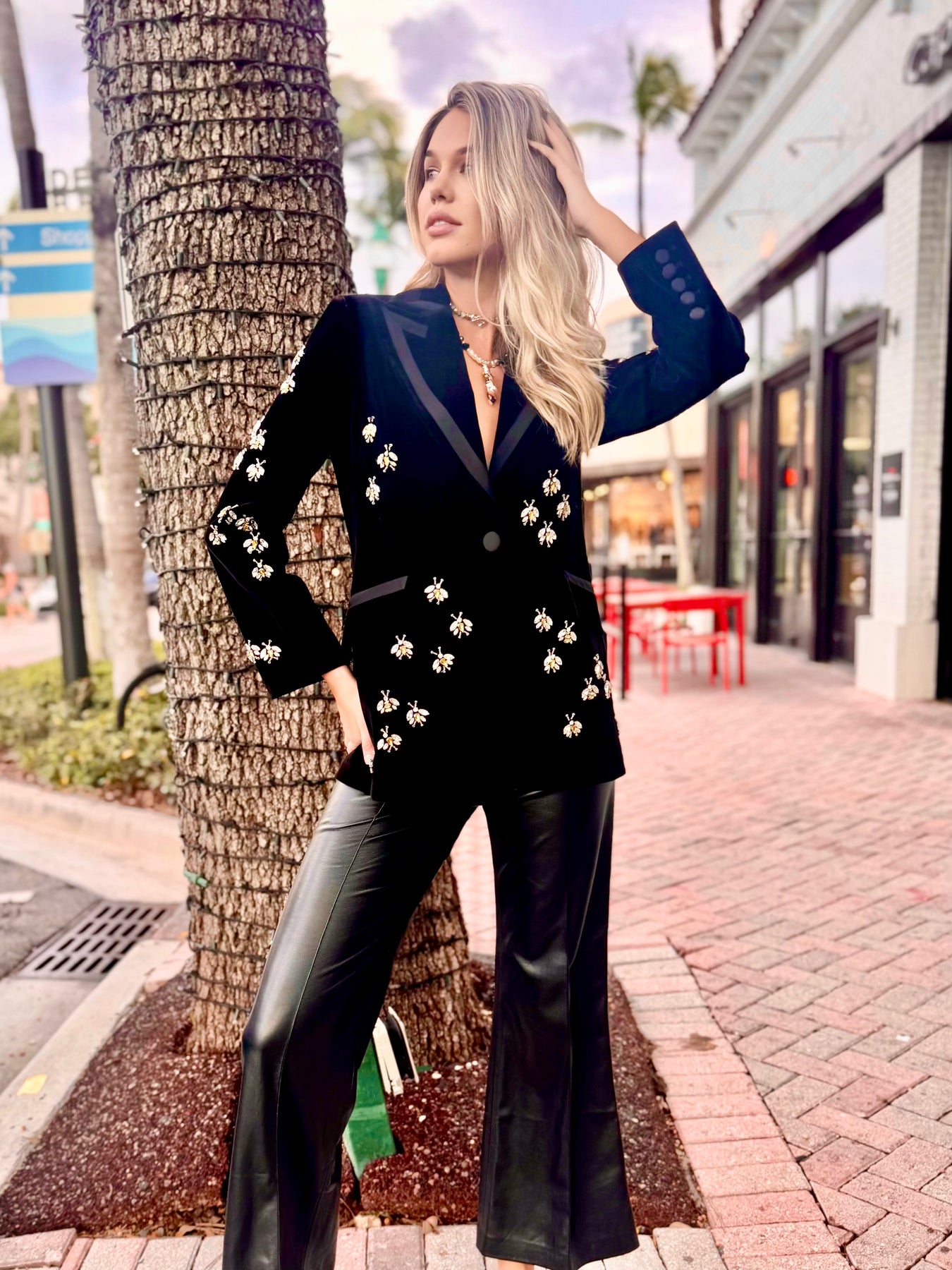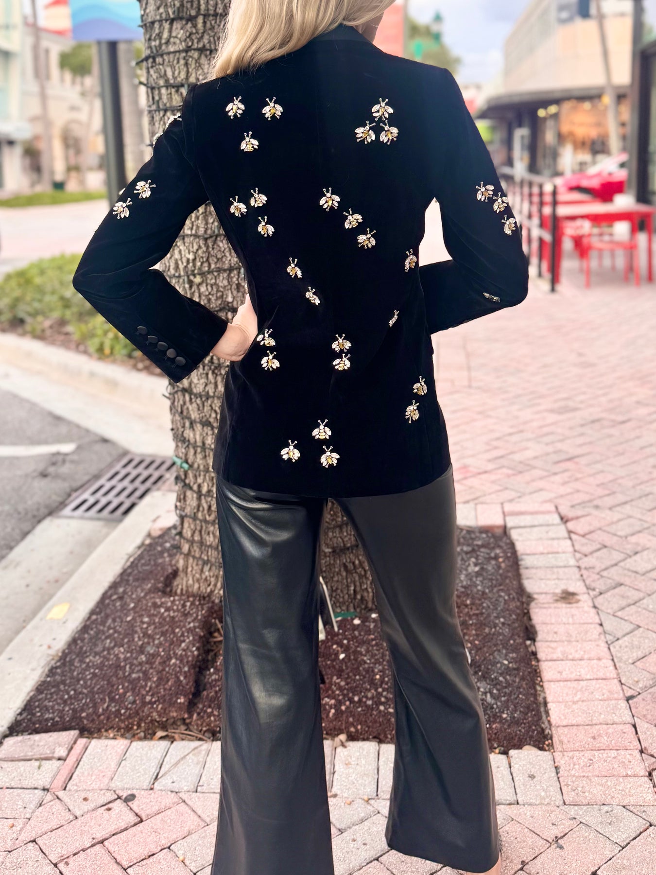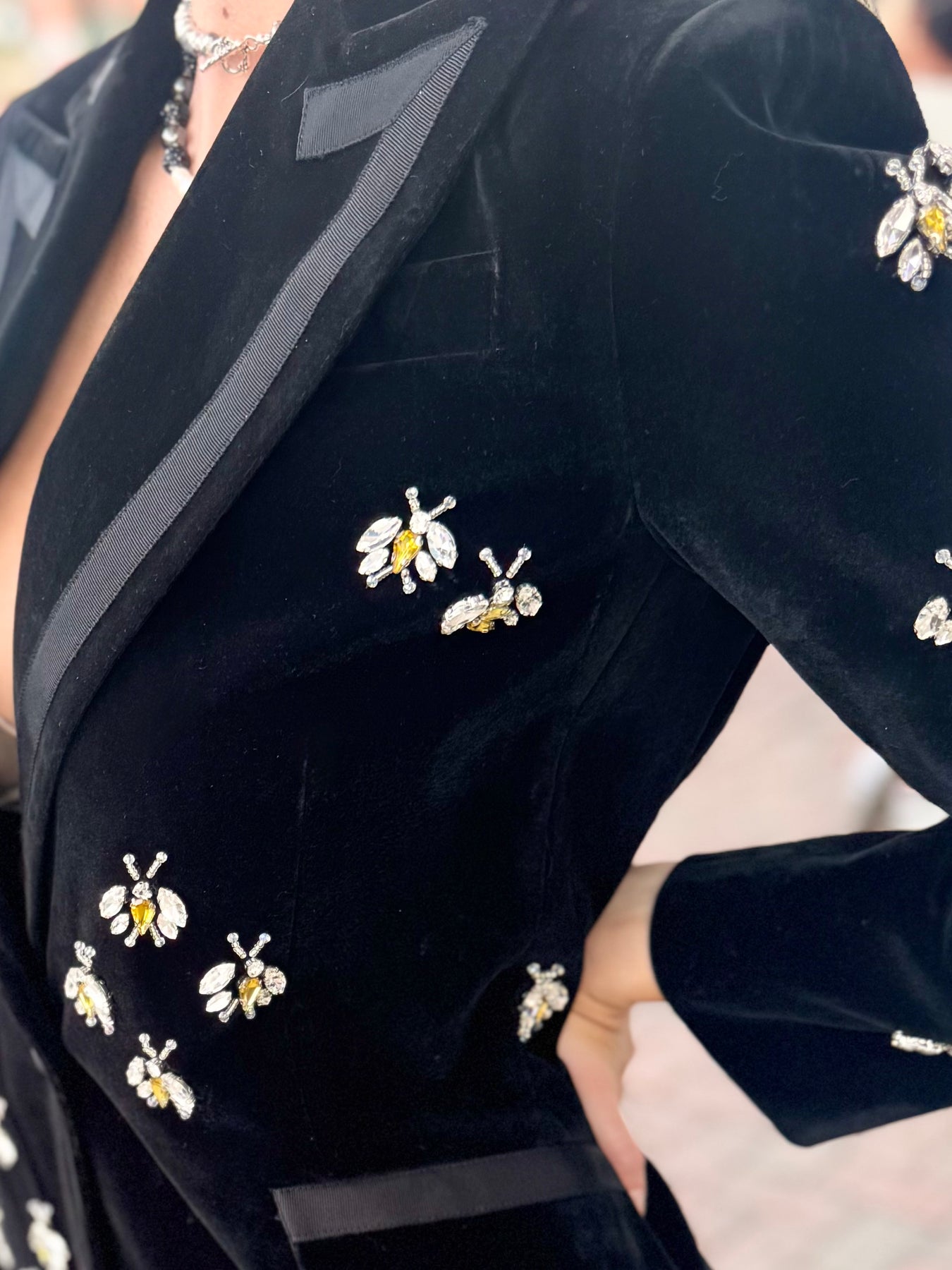 Buzz into bold elegance with the Velvet Hive Embellished Blazer — a show-stopping statement piece that exudes luxe glamour and playful charm. Crafted from rich black velvet and adorned with delicately jeweled bumble bee appliqués, this tailored blazer commands attention with every shimmering detail. Whether styled solo or layered over a sleek top, it’s the ultimate power piece for queen bees who dare to dazzle.