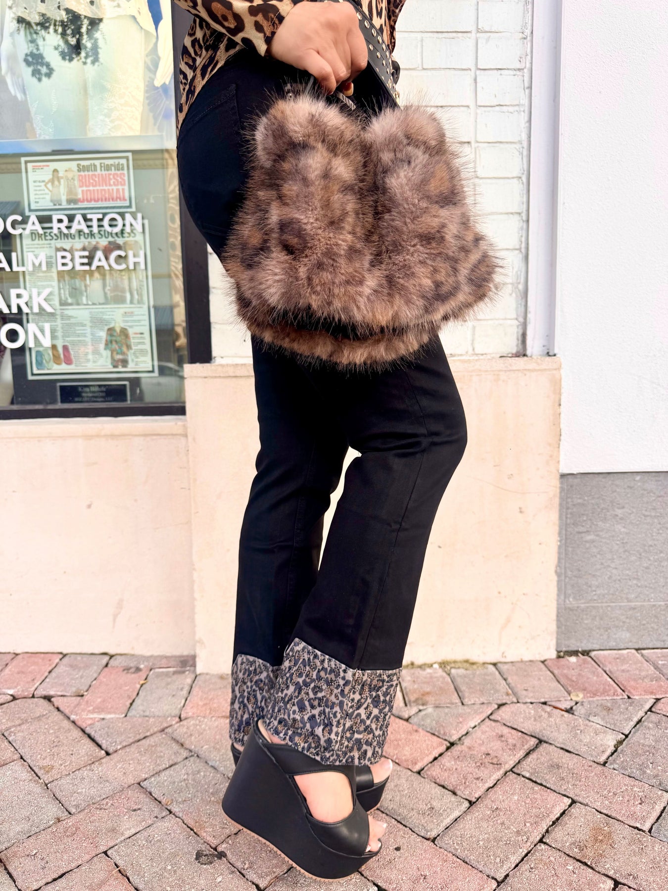 Mid-rise black jeans with statement cheetah fold-over cuffs