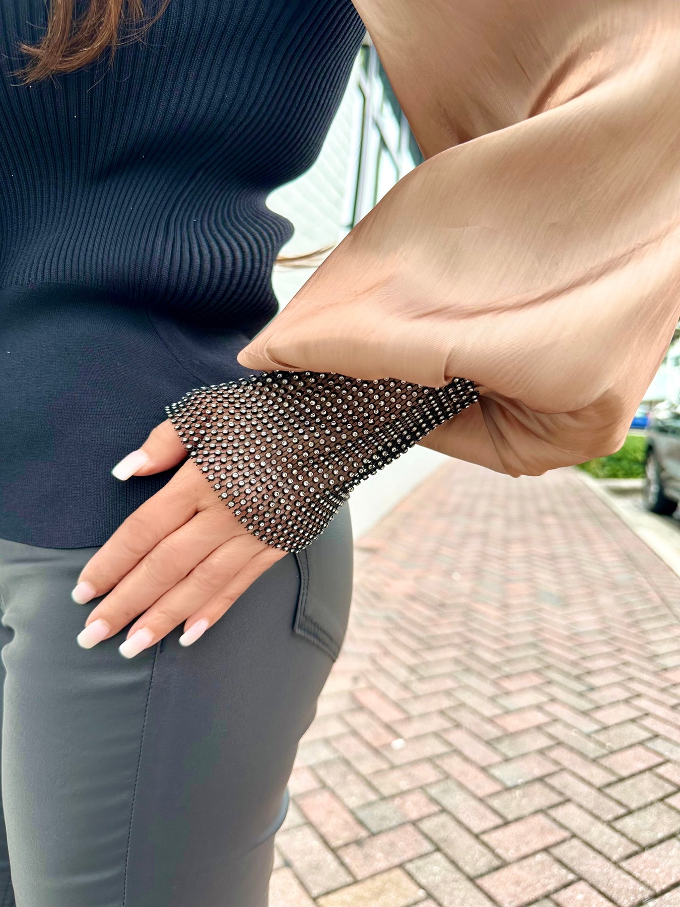 Soft, sultry, and effortlessly feminine—the Golden Ember Crinkle Top brings bohemian romance to your everyday wardrobe. Designed in a silky-satiny ruched ruffle fabric with a black knit base, this top features a flattering v-neckline and embellished 3/4 button front. Billowy sleeves with embellished button cuffs add an airy, relaxed feel, making this piece perfect for anything from brunch dates to work dinners.