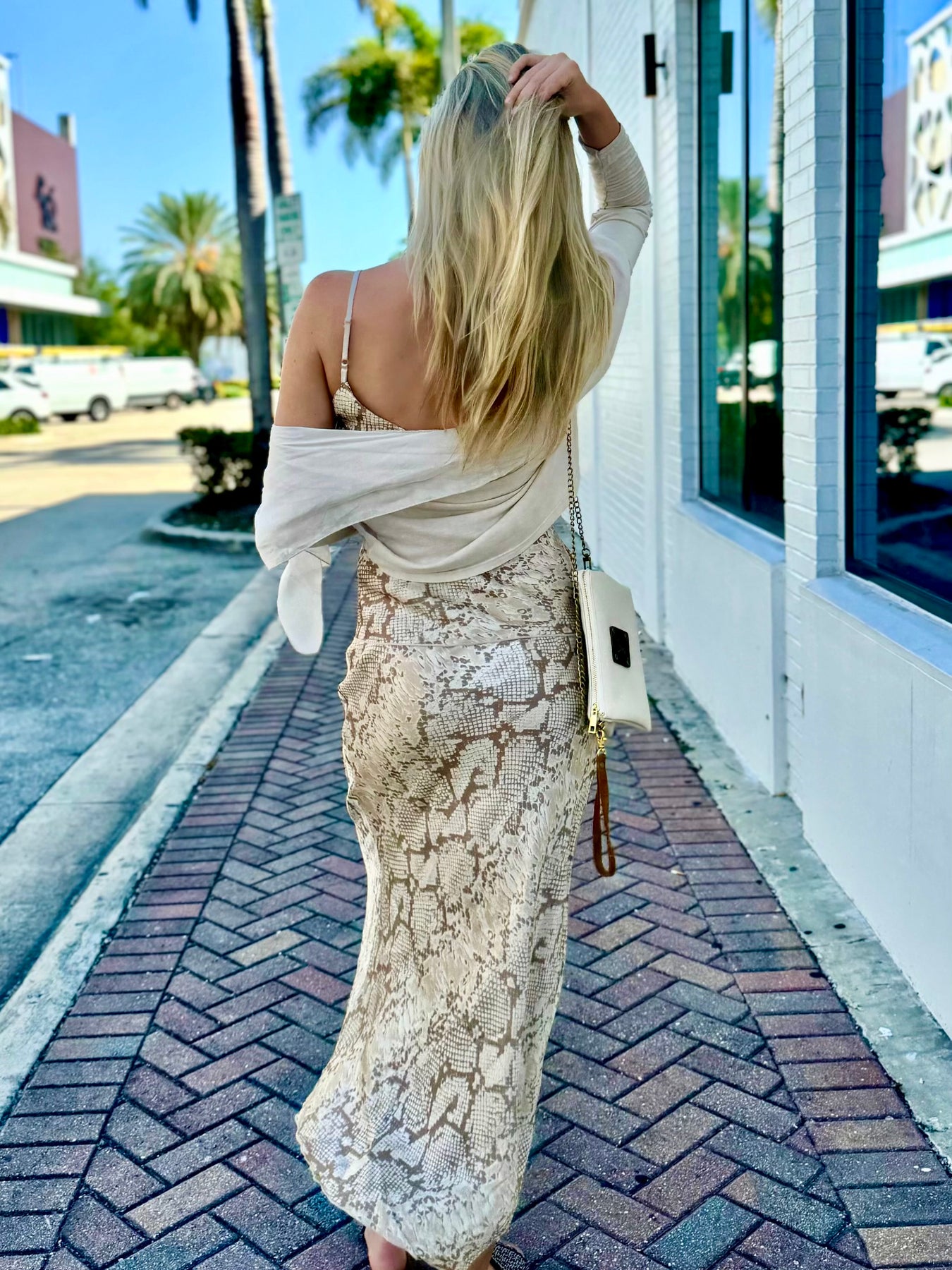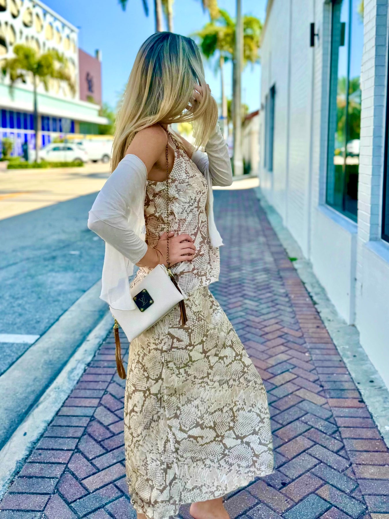 Slither into your power in the Sands of Serpent Cami & Skirt Set. With a soft python print in sandy beige tones, this two-piece ensemble is made for sun-soaked adventures and sultry nights out. The slinky cami features a flattering scoop neckline and adjustable straps, while the midi skirt flows with ease and hugs in all the right places. Worn together or separately, this set is endlessly versatile and undeniably chic. Add a woven belt, platform sandals, and a crochet layer for a luxe boho look.