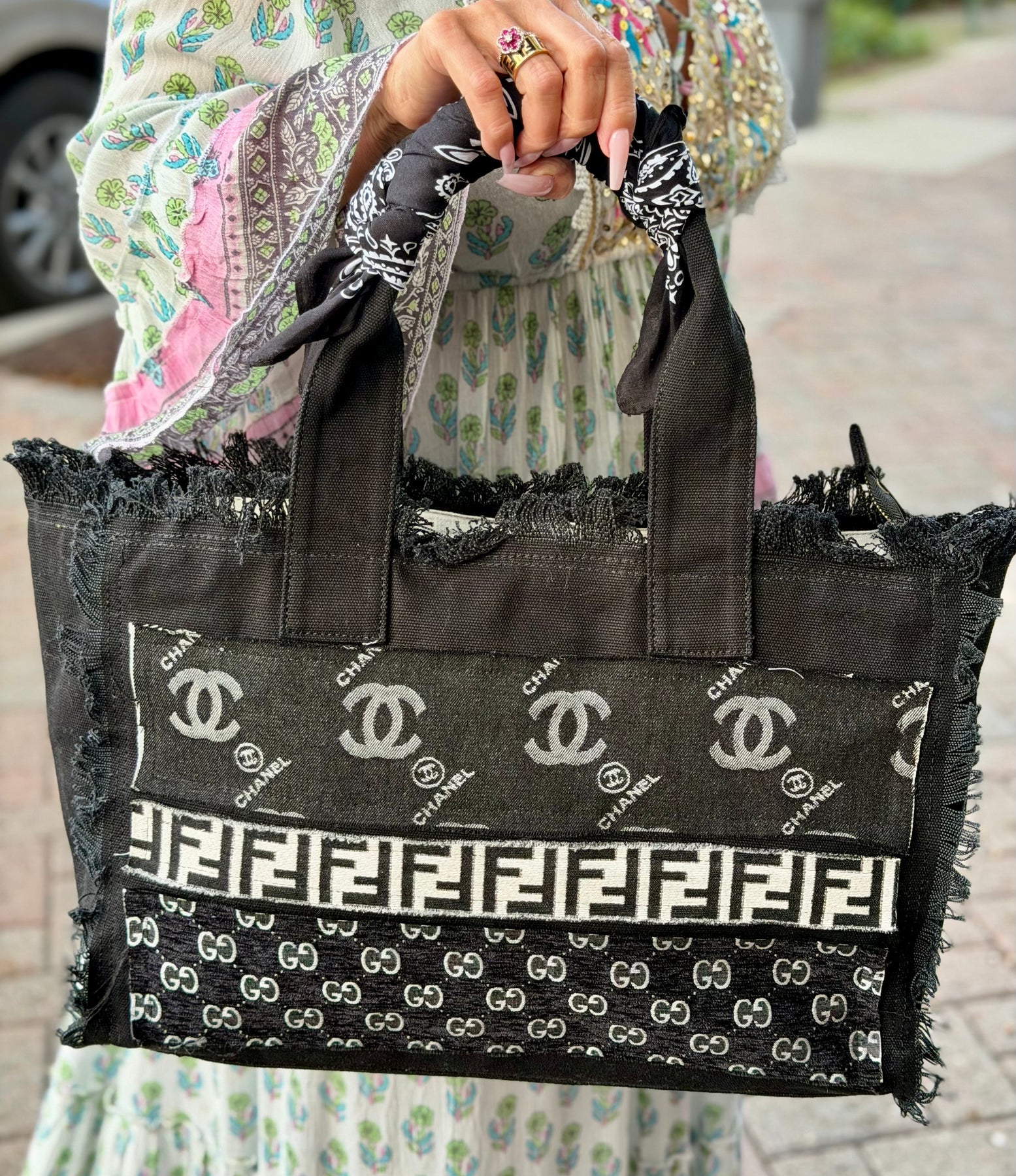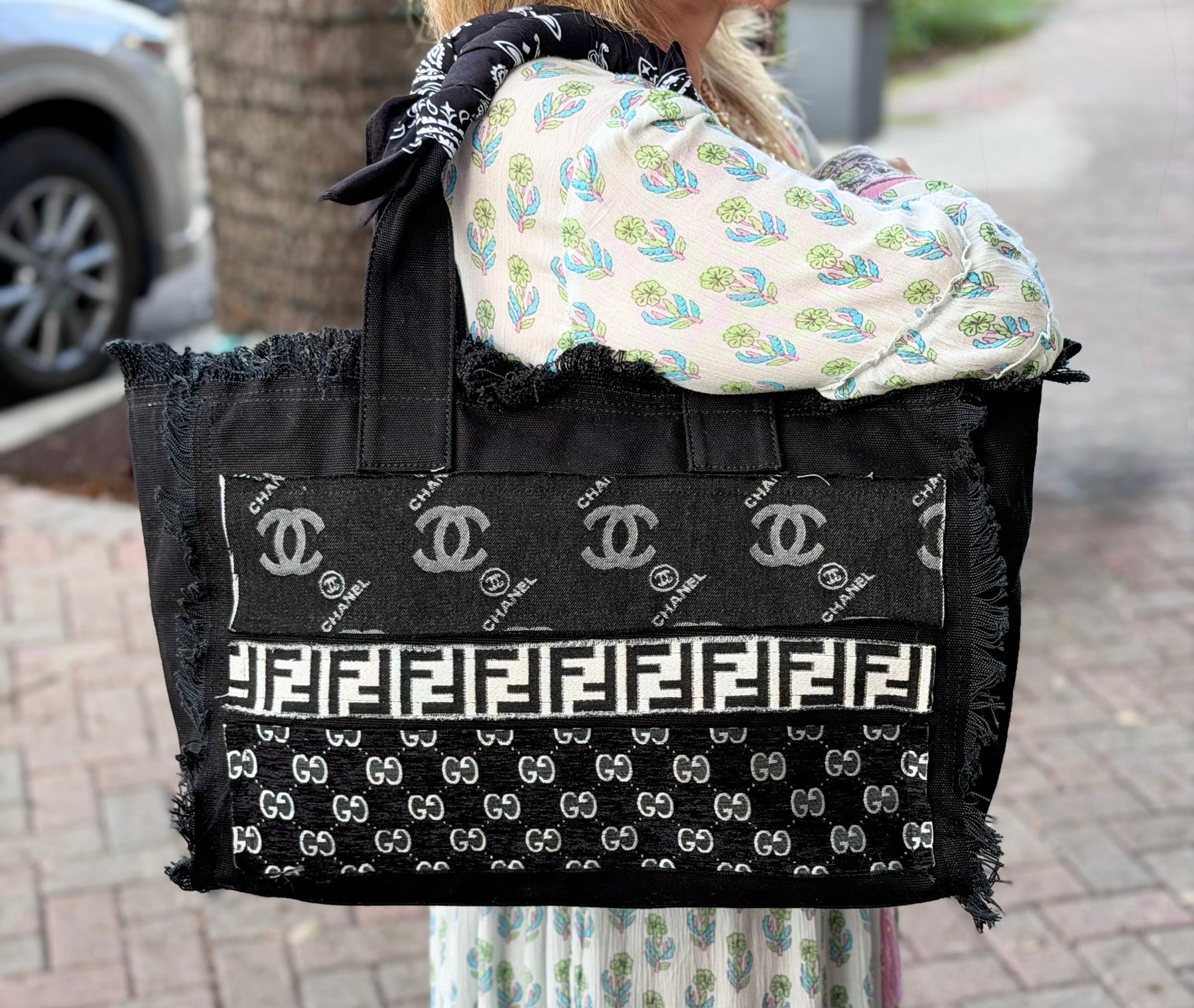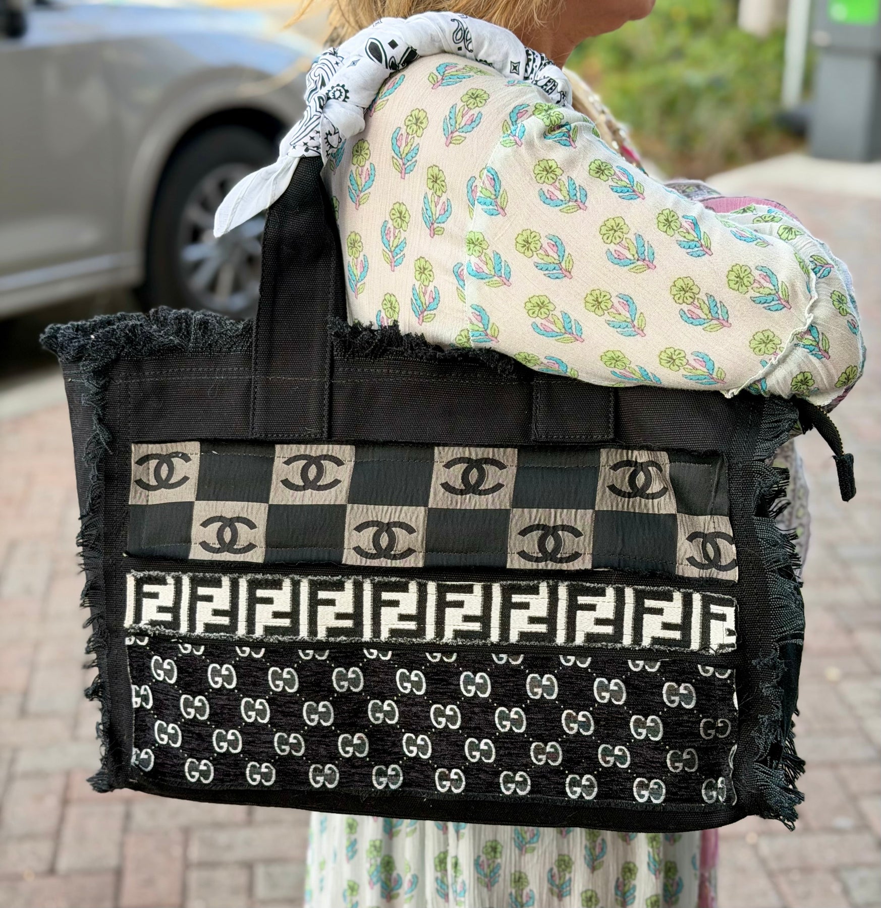 A statement in sustainable luxury, this up cycle patchwork tote is handcrafted from authentic vintage, designer, fabric strips, artfully layered to create a bold, high fashion, silhouette. Featuring mixed monogram panels in neutral tones, black canvas, trim, and raw frayed edging, this structured handbag blends street style edge with couture heritage. Finished with sturdy top handles wrapped with a cream or black bandana, and a spacious interior, it’s the perfect everyday luxury carry all for the fashion collector who values individuality and sustainability. Each piece is one of a kind.