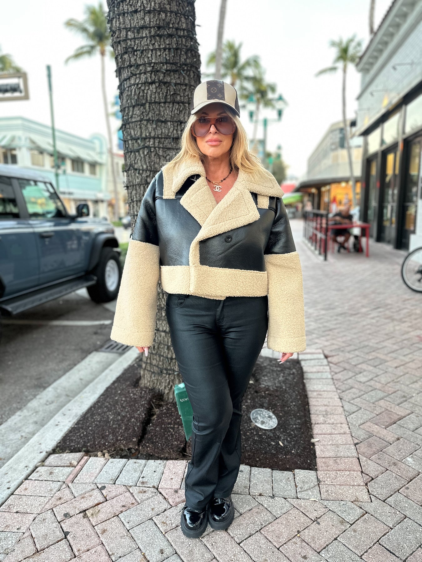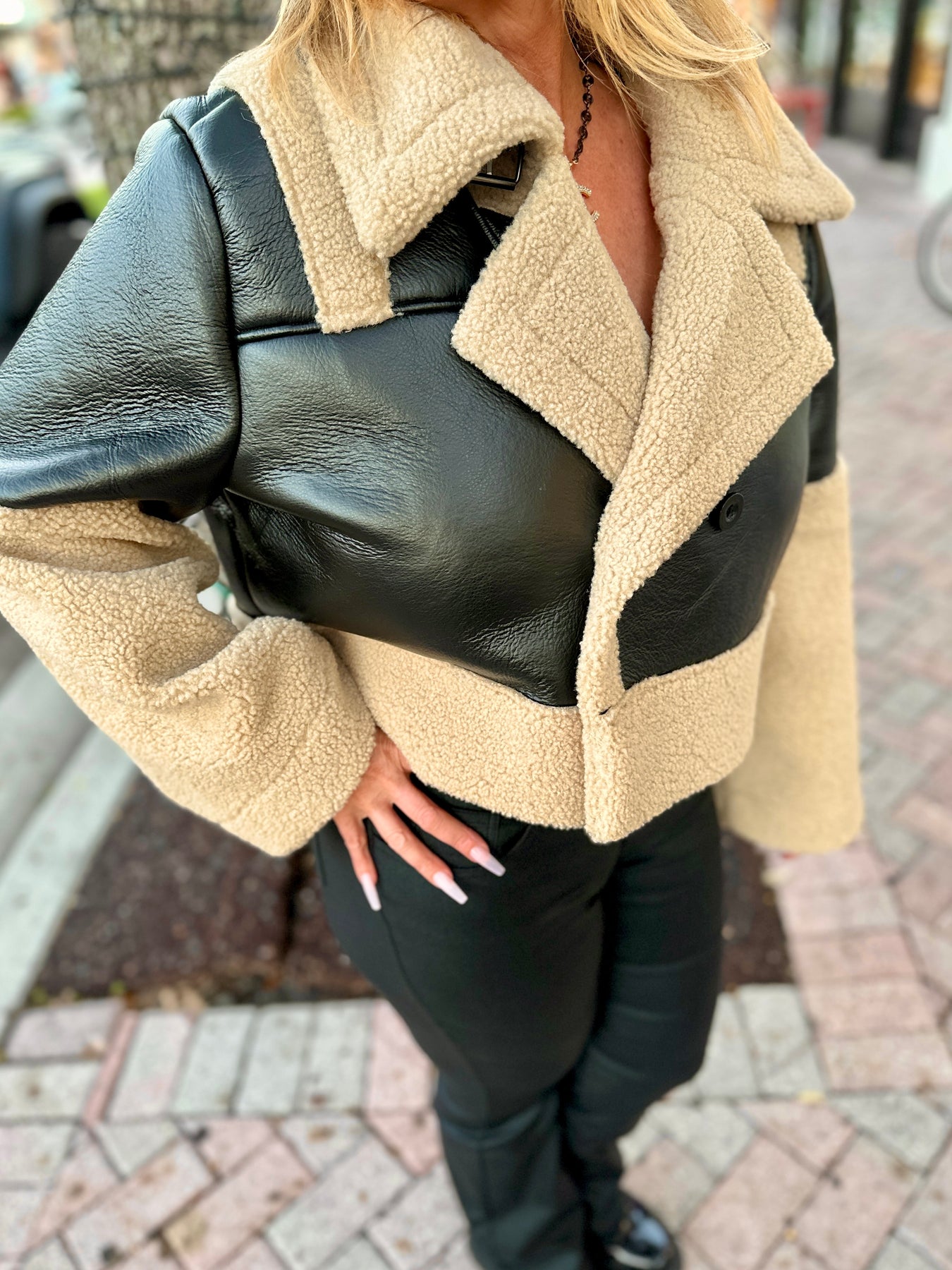 Cool-girl edge meets cozy texture in the Frostline Edge Vegan Leather Jacket. This cropped stunner is crafted from supple vegan leather and trimmed with plush sherpa detailing along the collar and cuffs for a bold, winter-ready contrast. With an effortlessly boxy fit and structured silhouette, it adds just the right amount of attitude to any cold-weather look — no compromise on comfort or conscience.