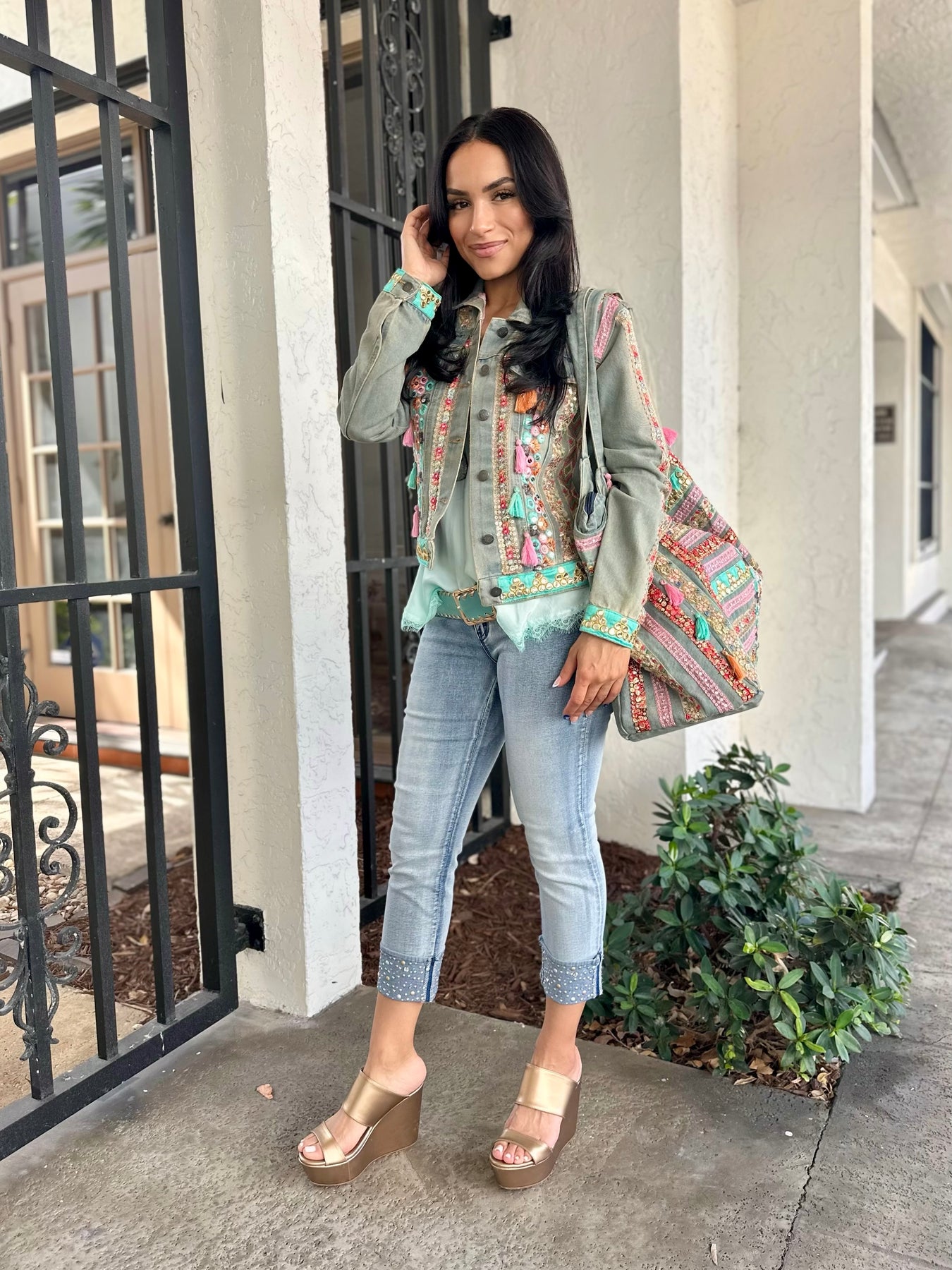 Embroidered and embellished detail on front with colorful tassels