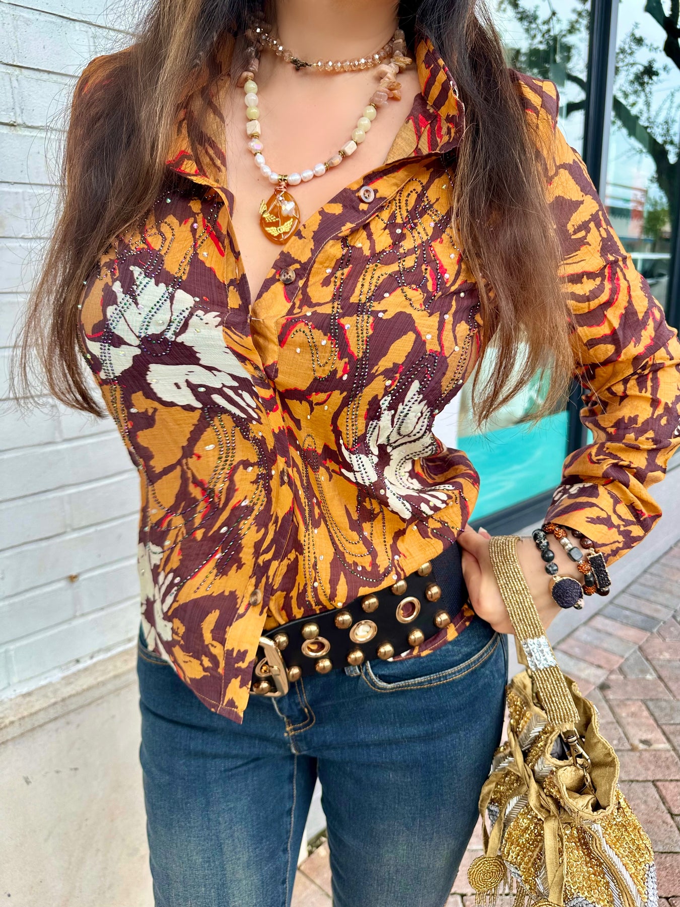 Bring bold energy to your fall wardrobe with the Autumn Bloom Crystal Button Down Top — a vibrant blend of golden mustard, deep maroon, and fiery red in an abstract floral print that’s as eye-catching as it is unique. Subtle crystal embellishments cascade across the chest and sleeves, catching the light with every move. Made from a lightweight woven fabric, this collared button-down features a tailored silhouette with just enough stretch to flatter your shape while offering everyday comfort.