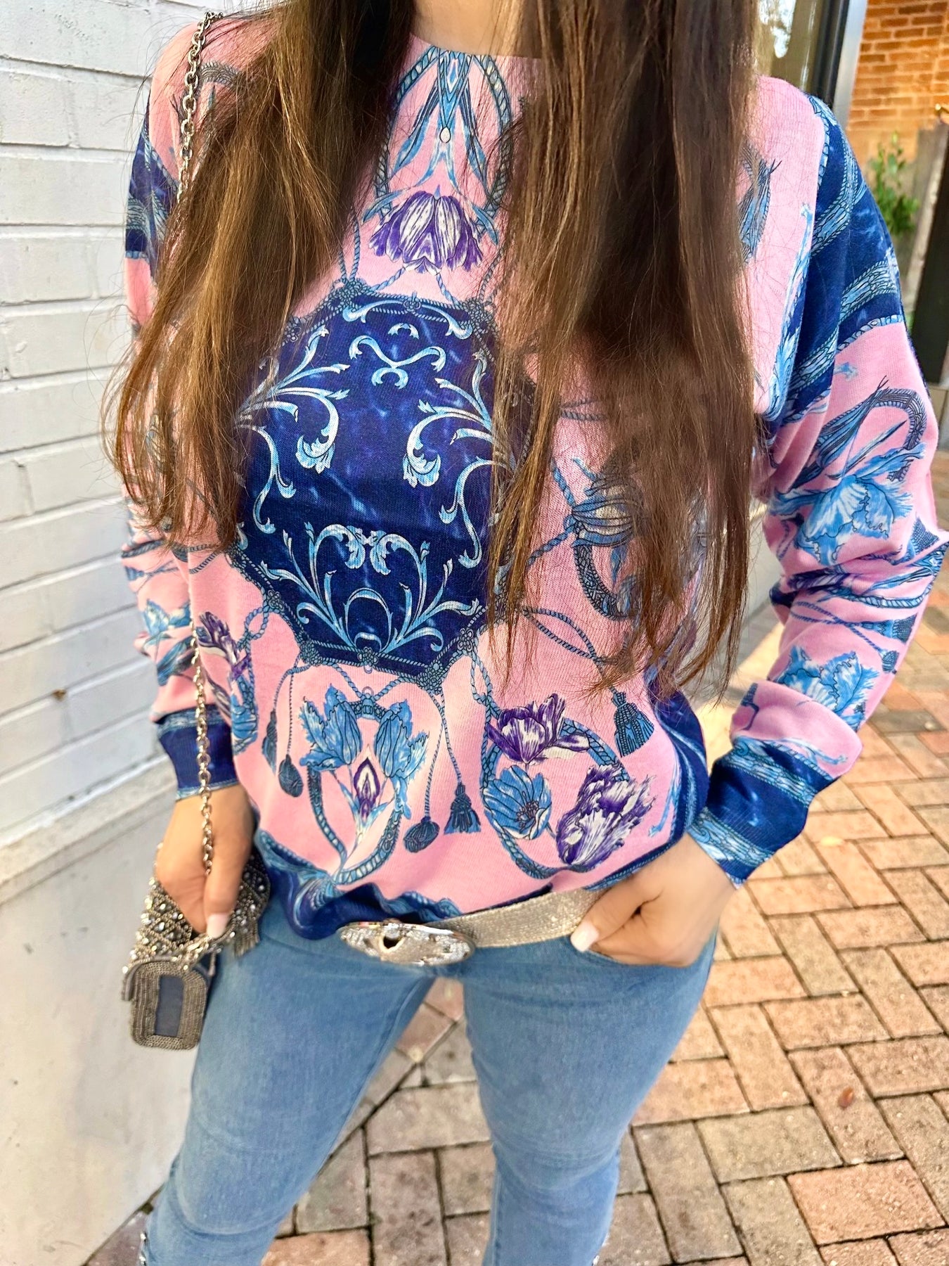 Infuse your wardrobe with regal elegance in the Botanical Royale Baroque Long Sleeve Knit Top. This long-sleeve pullover features a rich, artistic print in vivid pink and royal blue hues, blending vintage-inspired baroque florals with modern streetwear edge. The soft stretch knit offers all-day comfort while making a bold statement. Whether dressed up or down, this top adds instant luxury to your everyday style.