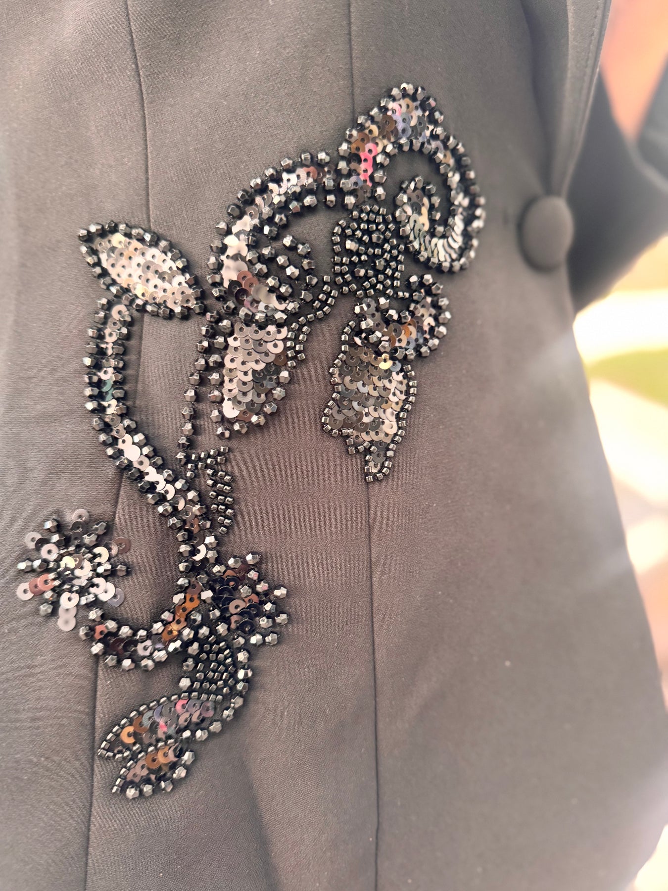 - Sheet back detail with tonal beaded floral embellishment