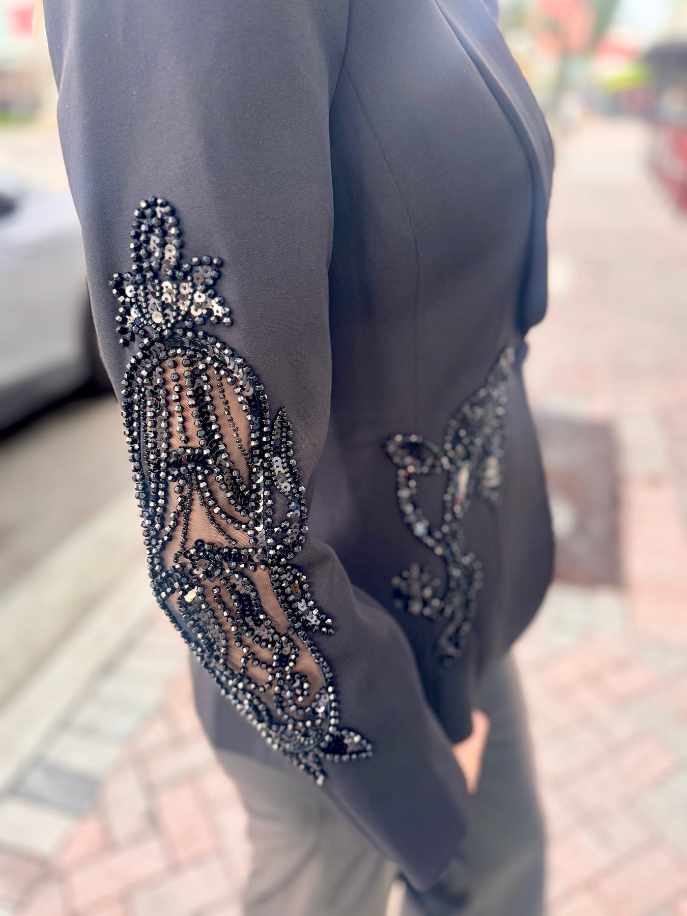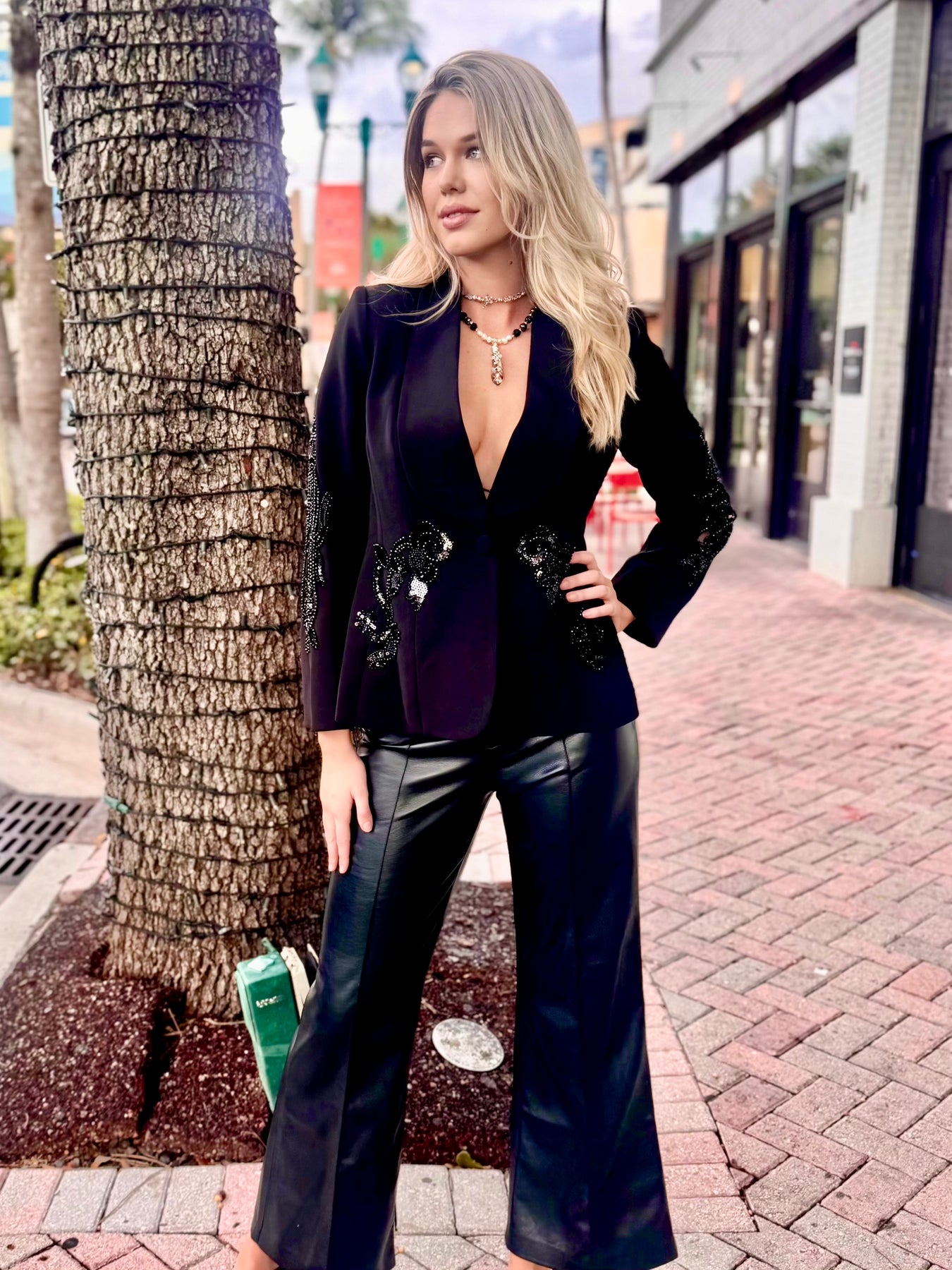 Let your look blossom after dark. The Nightfall Fleur Embellished Blazer blends sharp tailoring with intricate beaded floral embellishments, creating a look that’s both commanding and ethereal. Crafted with a sleek silhouette and subtle shimmer, this piece brings drama and polish to any evening affair. Whether layered over leather pants or styled solo as a statement jacket, it’s your go-to for bold sophistication.