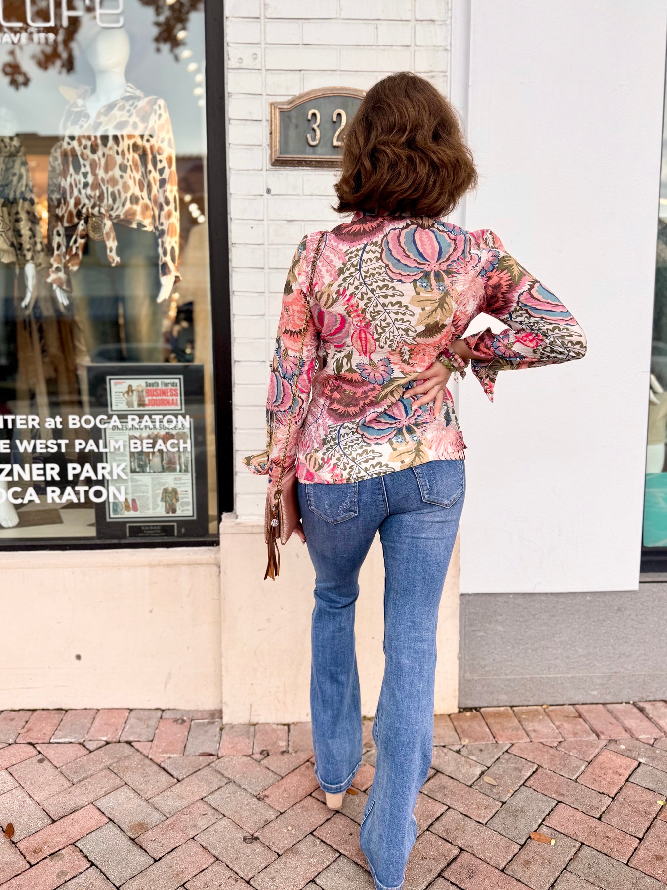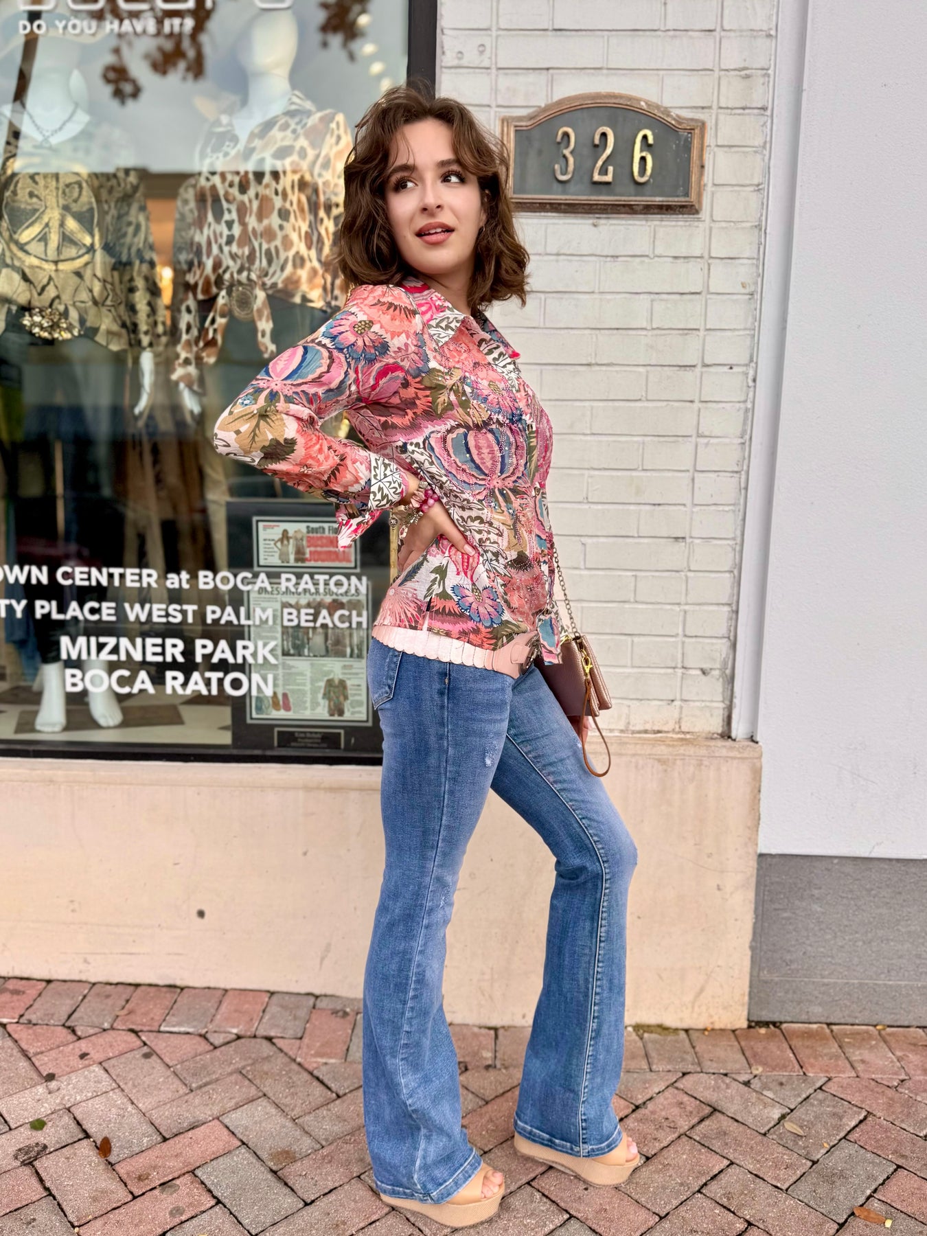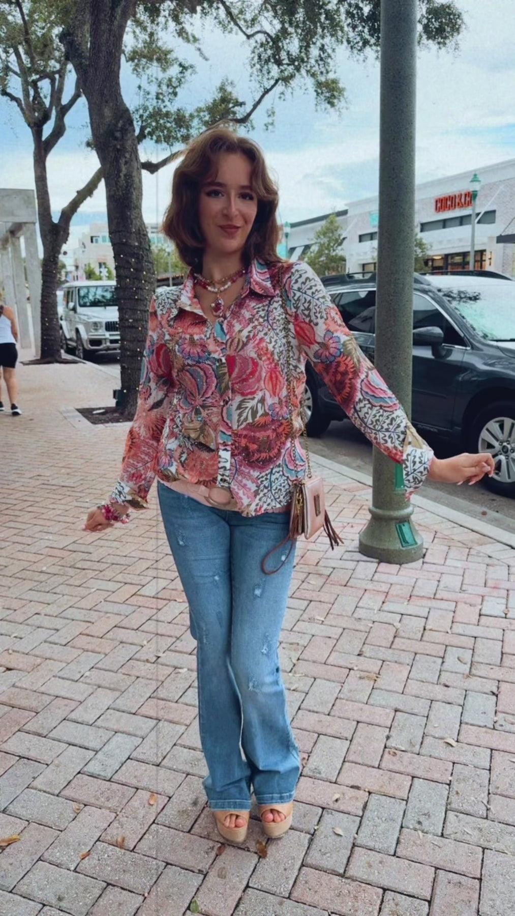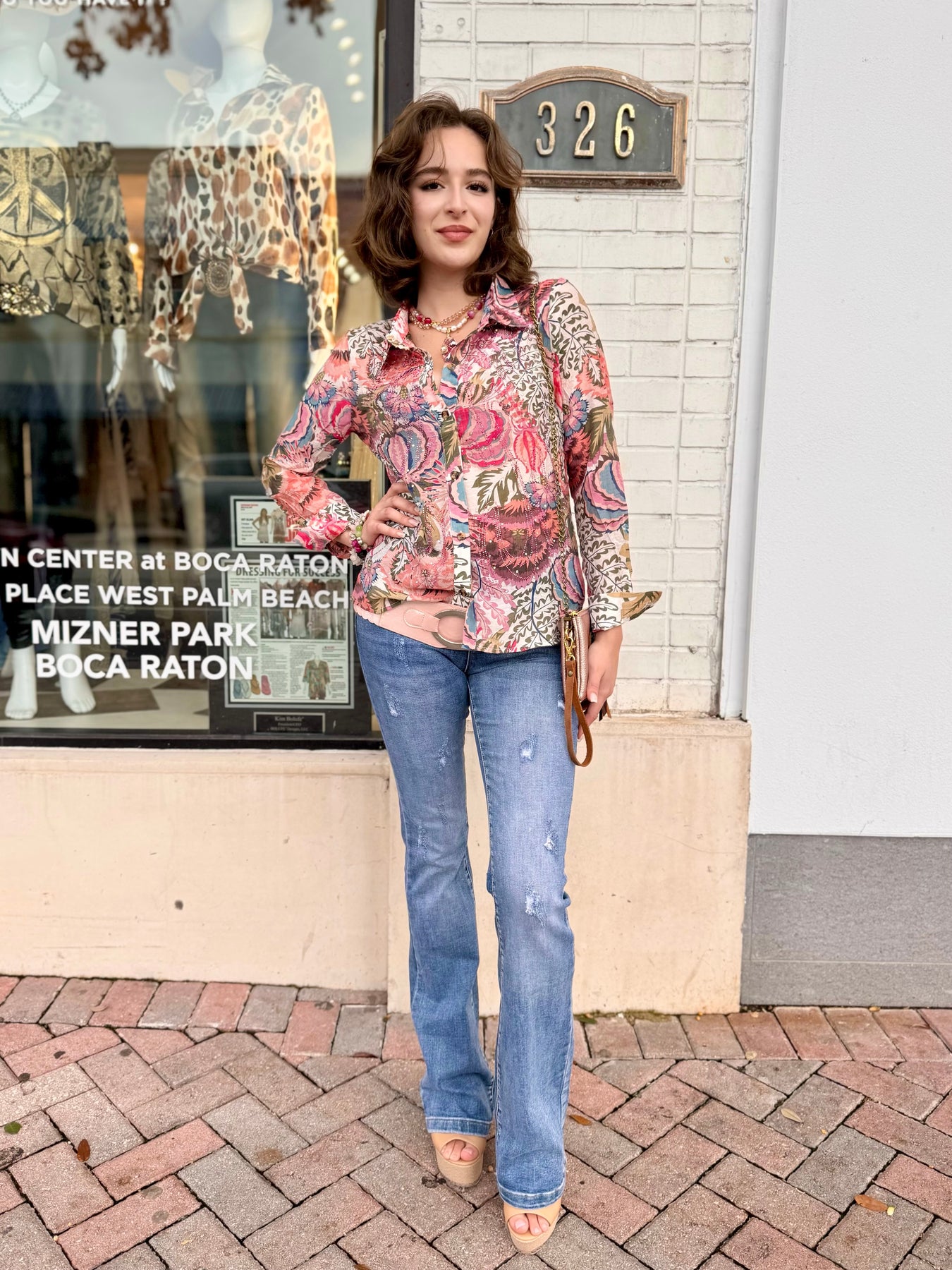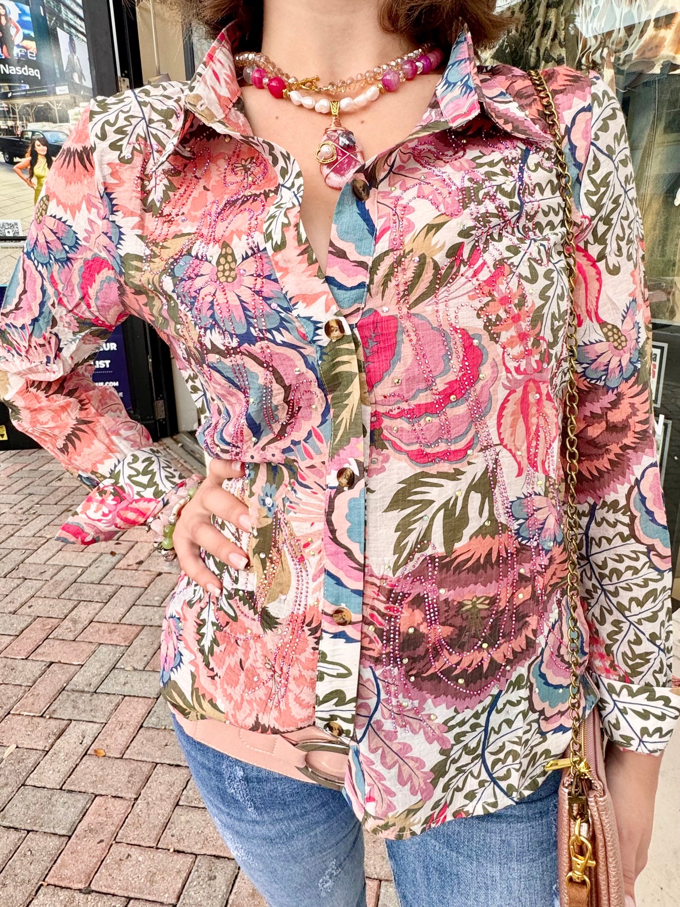 Turn up the shimmer with the Wildflower Mist Button Down Top —a luminous statement piece that captures the light (and attention) from every angle. Crafted from a lightweight, crinkled floral-print fabric, this blouse features delicate rhinestone embellishments throughout. The tailored silhouette, classic collar, and button-front closure blend timeless design with modern flair. Perfect for day-to-night transitions, this blouse is effortlessly chic paired with trousers, jeans, or a sleek skirt.