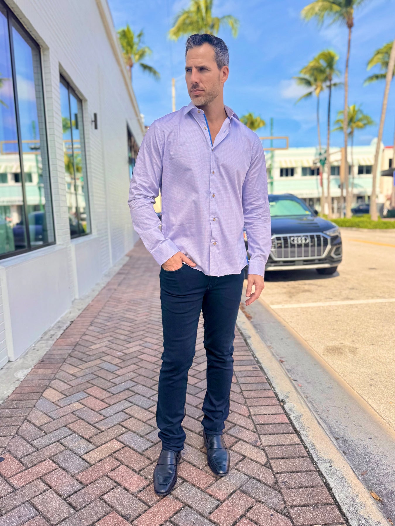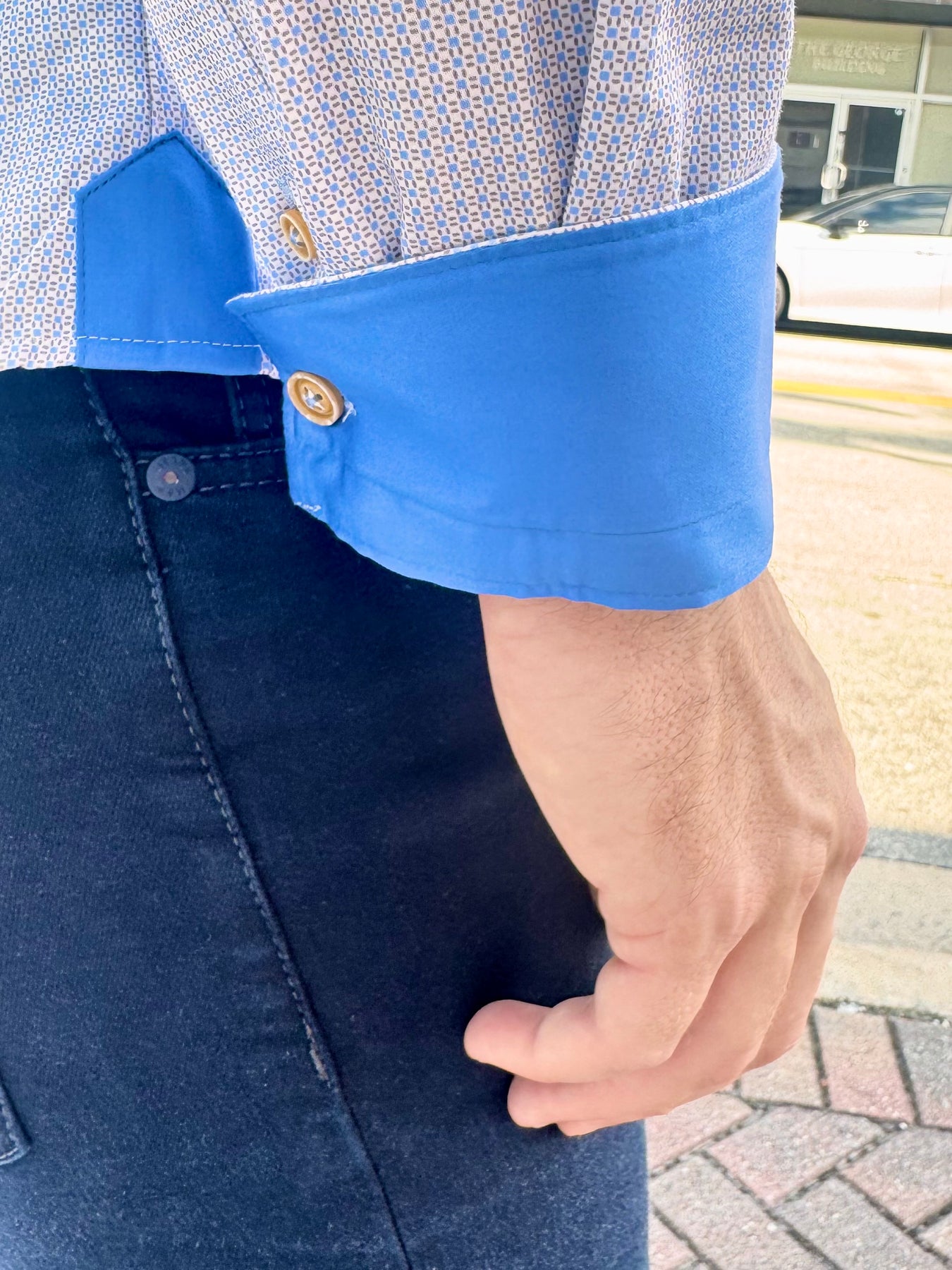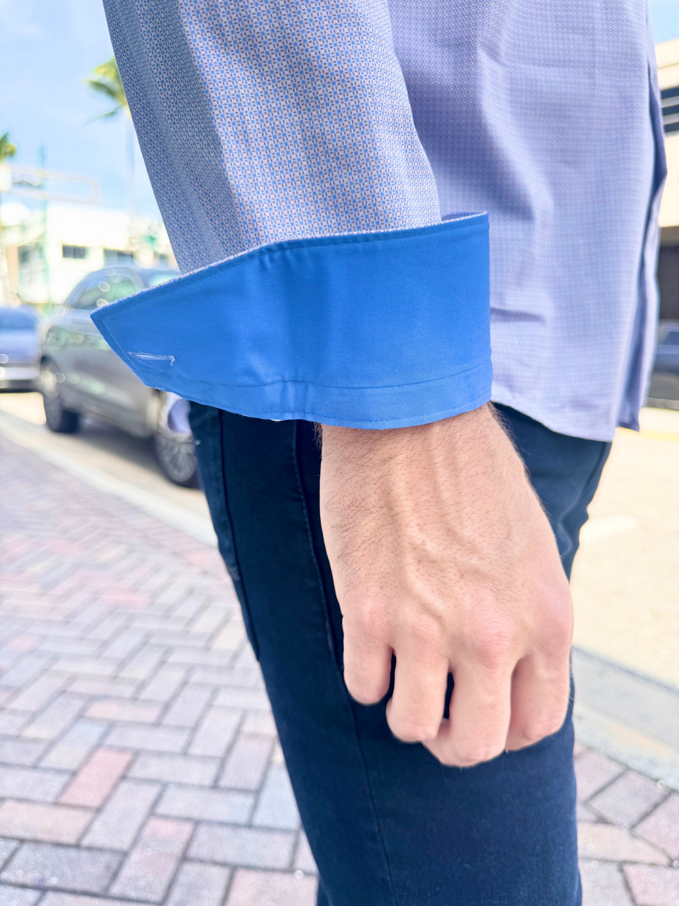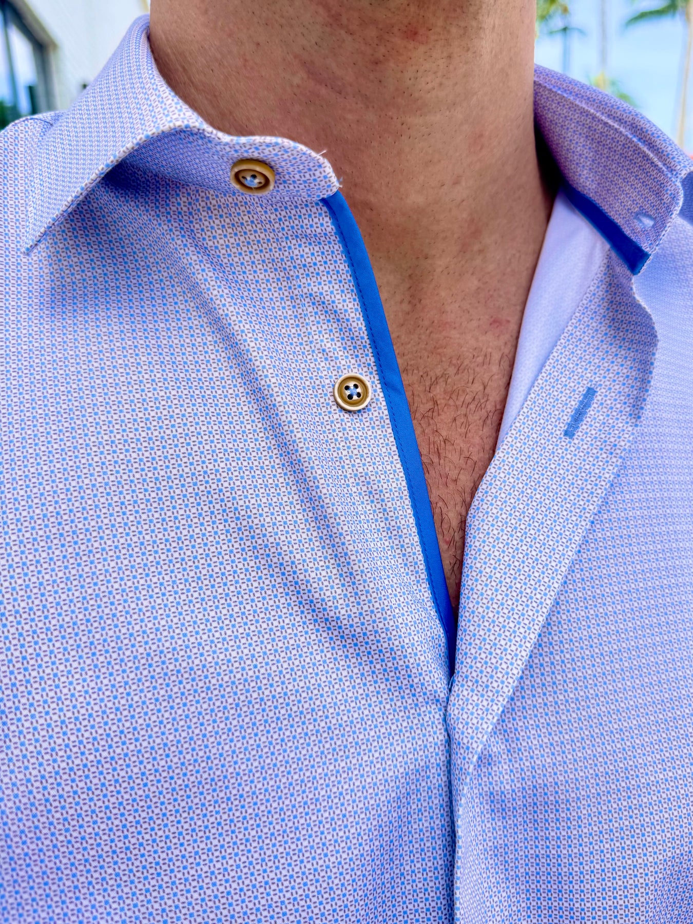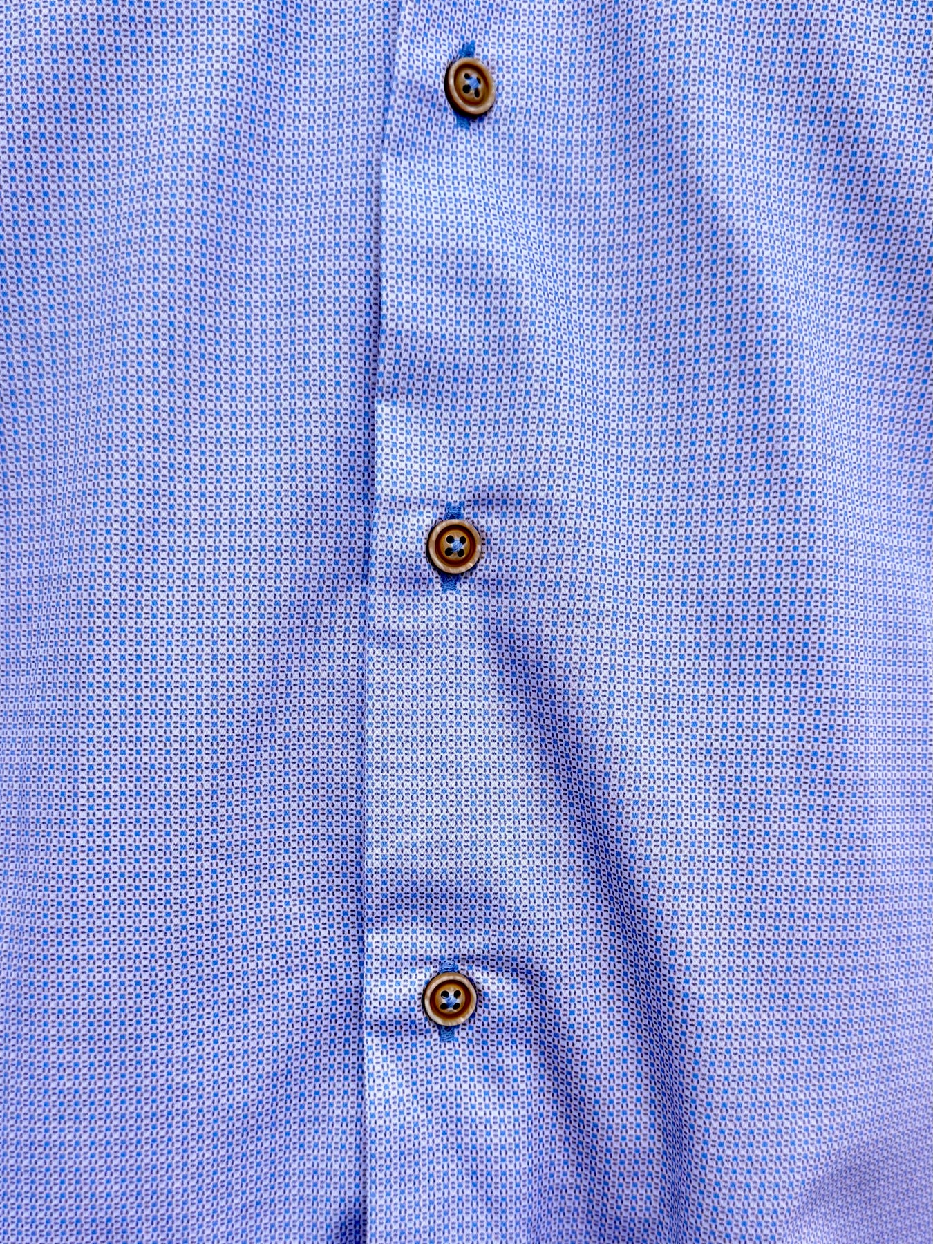 A clean, modern essential elevated with dynamic contrast. The Blue Horizon Micro-Grid Long Sleeve Button-Down features a crisp geometric pattern in soft blue and tan, paired with bold cobalt trim for a refined yet standout finish. Perfect for day-to-night wear, this shirt blends polished structure with effortless versatility.