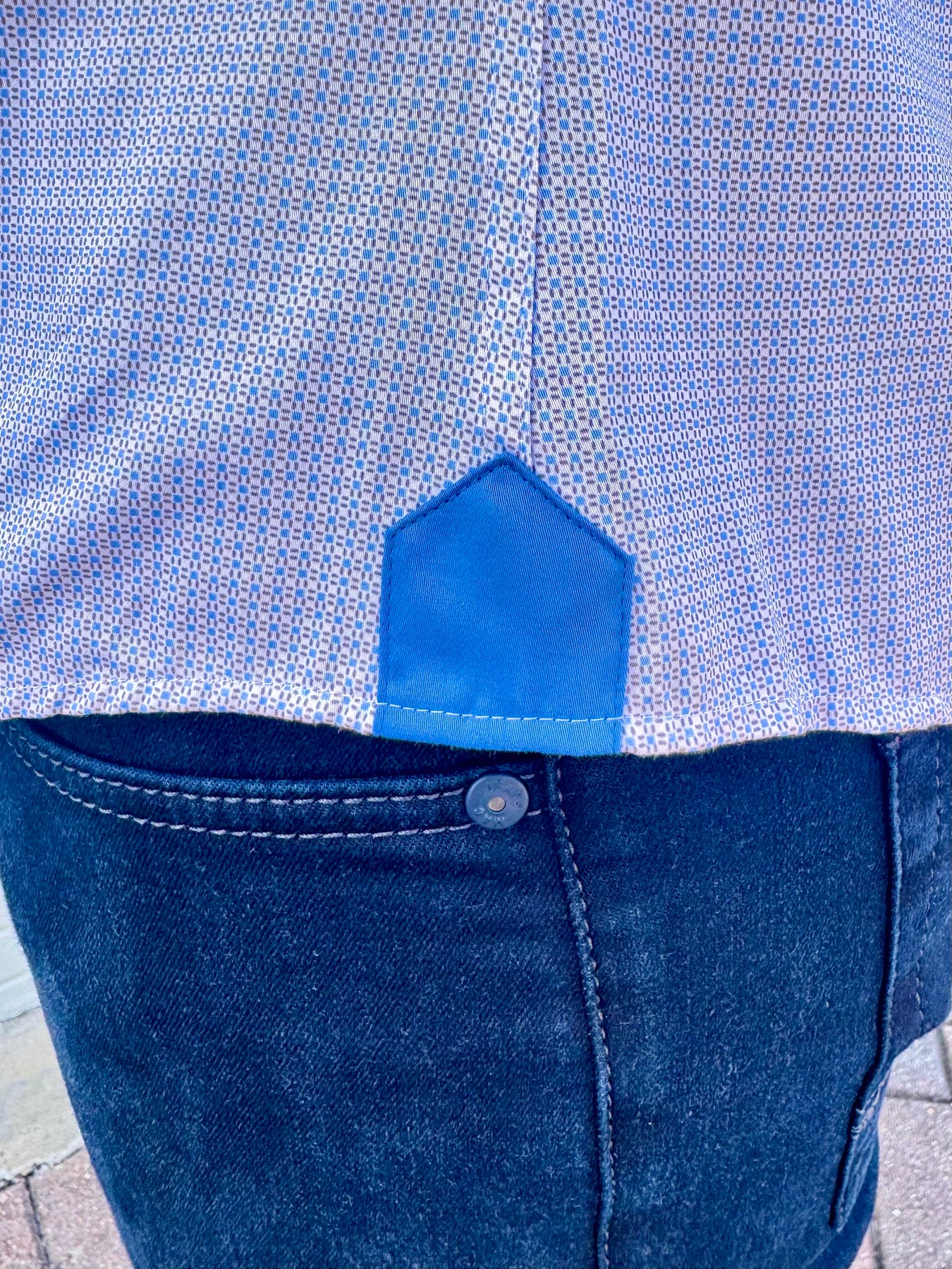 Contrast cobalt placket trim, cuff lining, and side gussets
