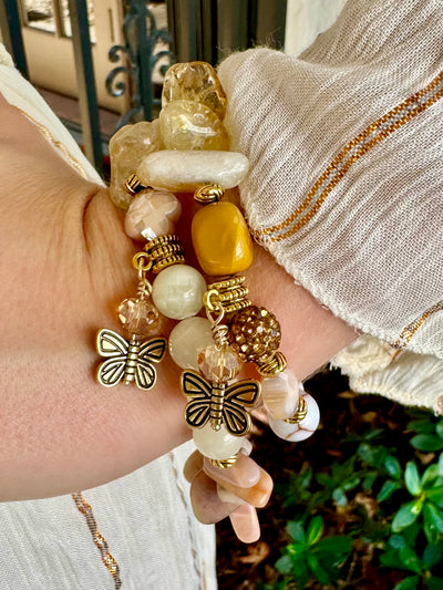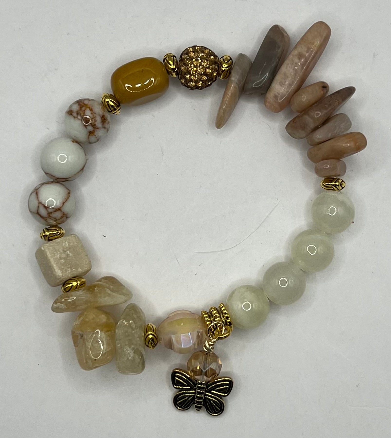 Citrine quartz large stones, rhinestones, sunstone chip beads, white-gold howlite beads, golden rhinestone and gorgeous butterfly bead or plain