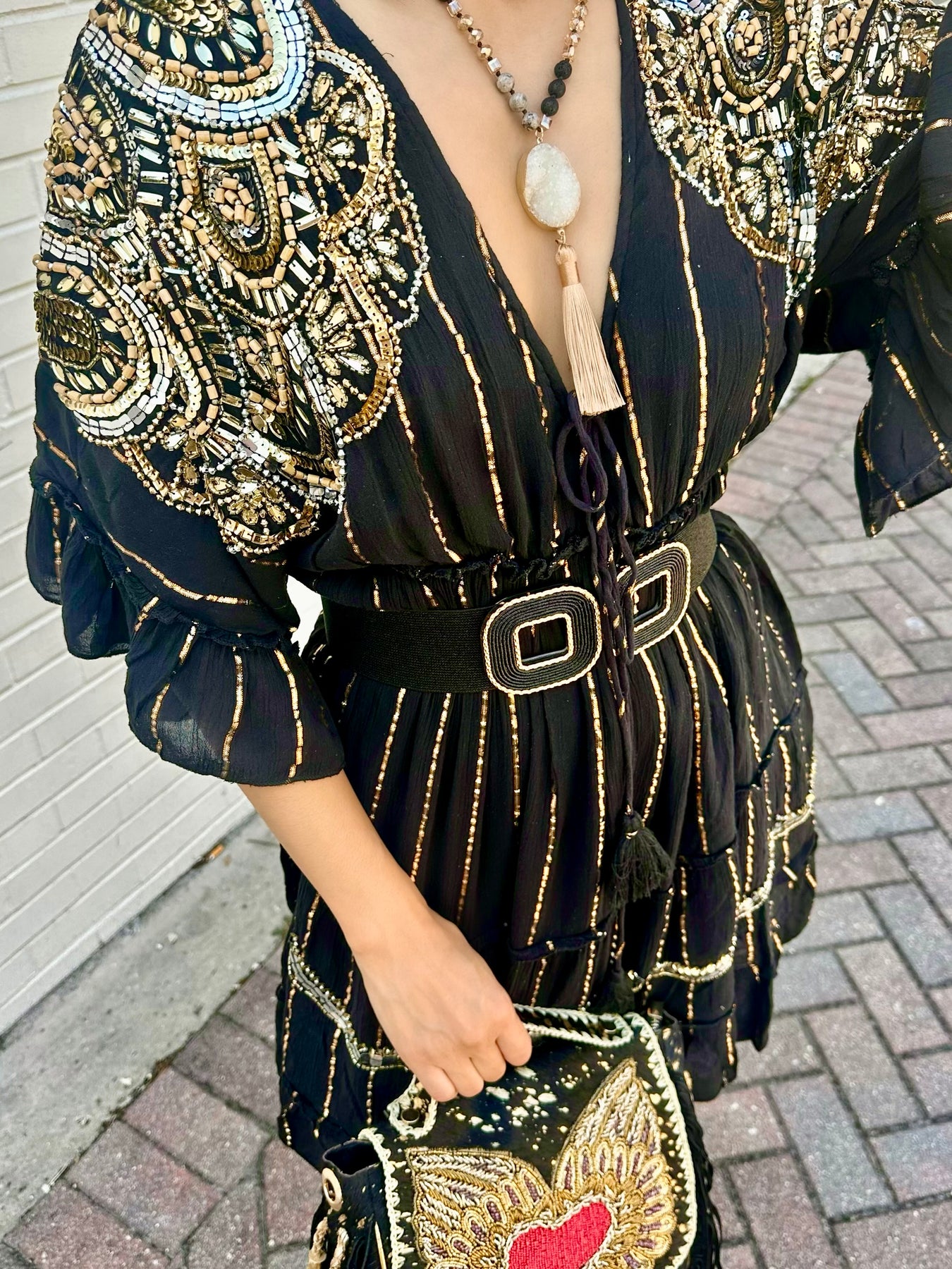 Gold embroidered and embellished detail on front