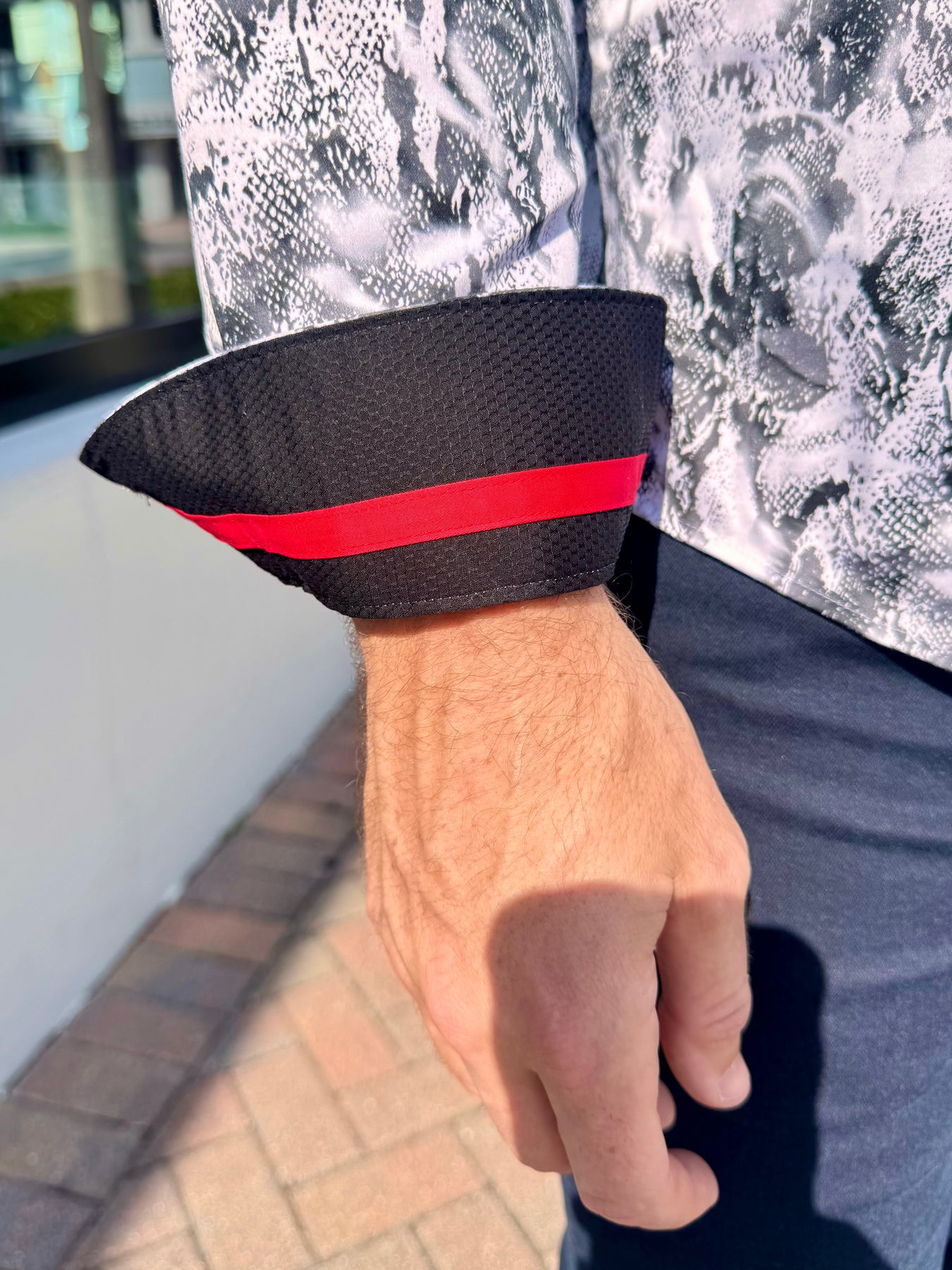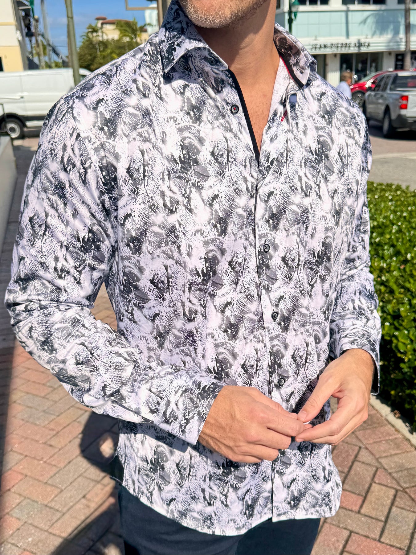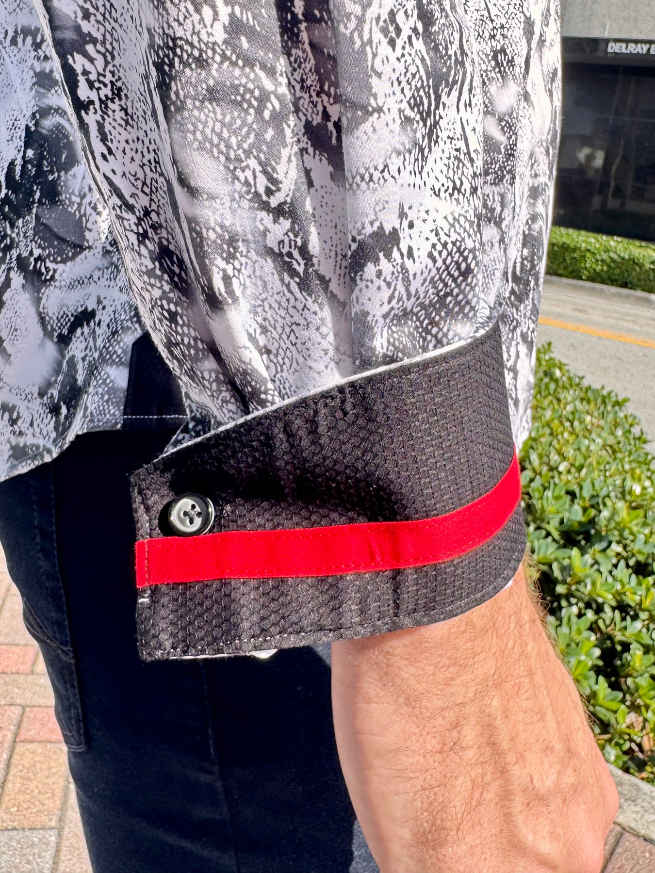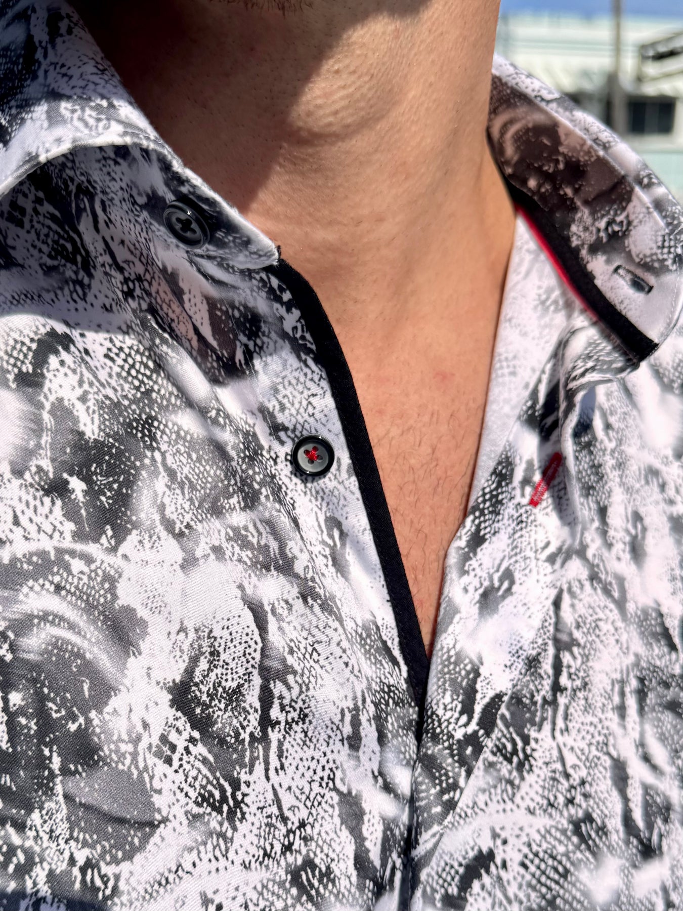 A bold, monochrome statement piece designed for the man who isn’t afraid to stand out. The Midnight Python Contrast Long Sleeve Button-Down features an abstract black-and-white snakeskin print that adds depth and edge, paired with sleek black contrast details and a pop of red for unexpected sophistication. Modern, sharp, and effortlessly confident—this shirt turns every entrance into a moment.