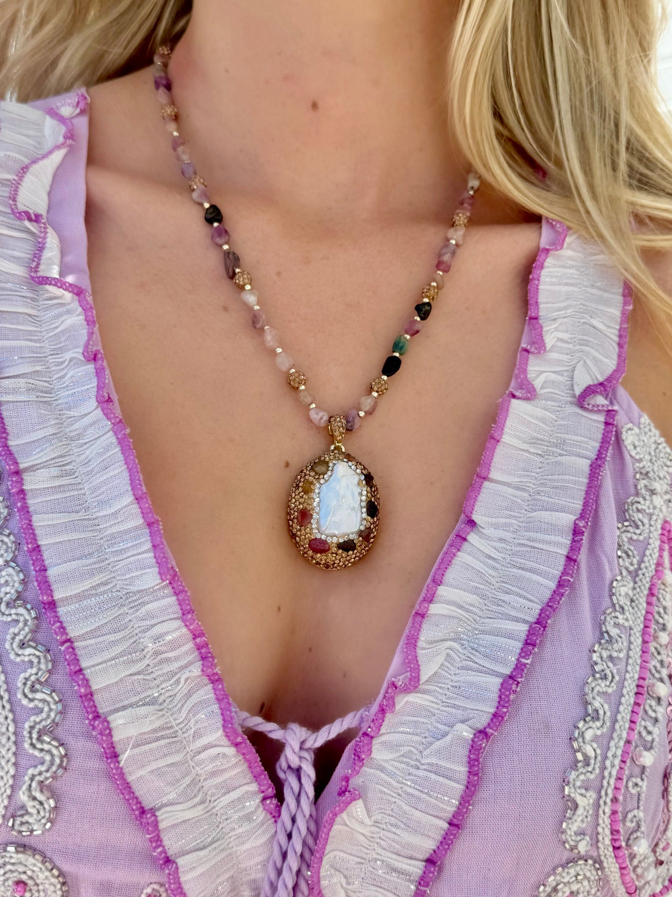 Crystal wrapped pendant with Amethyst or Baroque Pearl center